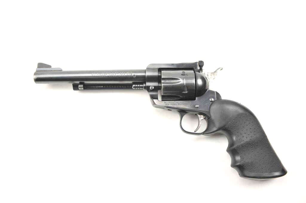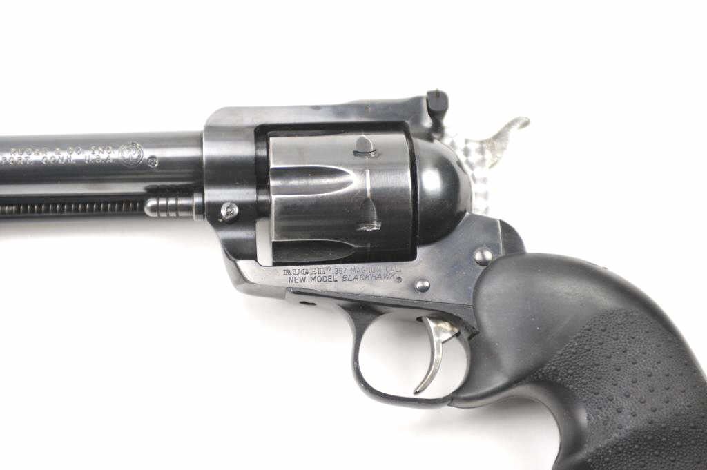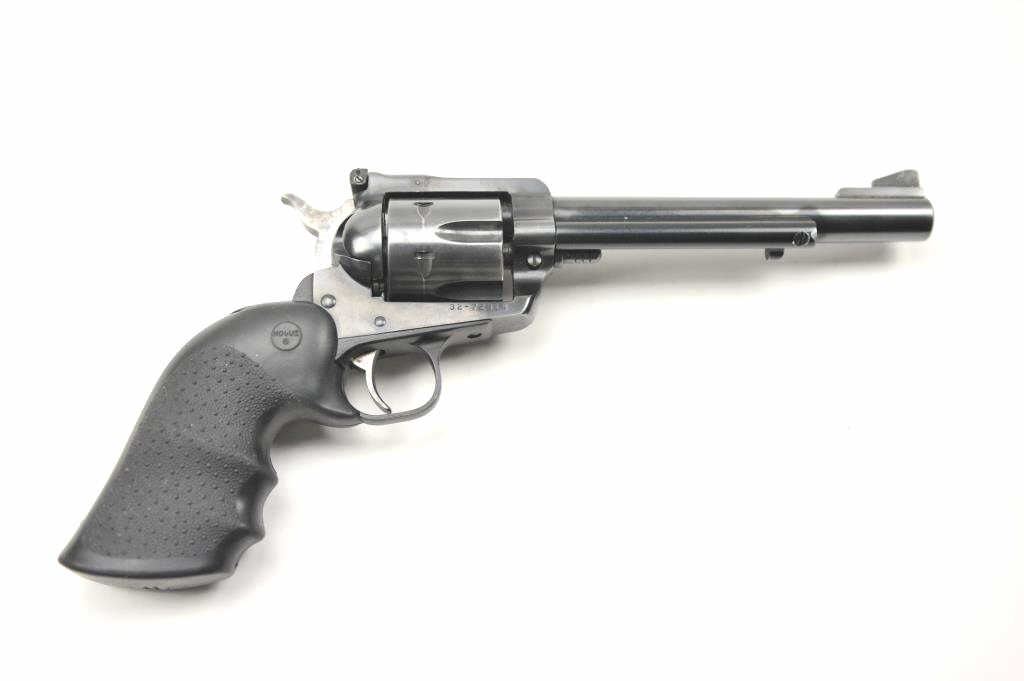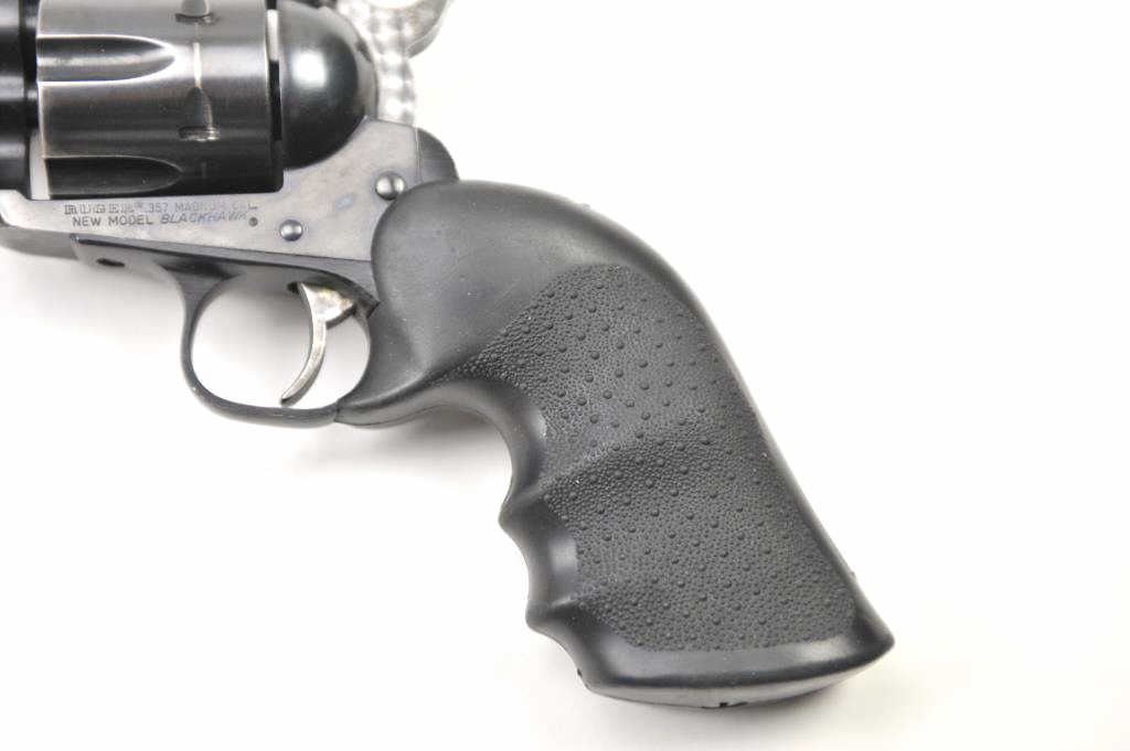Ruger New Model Blackhawk Flat Top SA revolver, .357 Magnum caliber, Serial #32-72315. The pistol is in fine overall condition with a 6 ½” barrel with a ramped blade front and adjustable rear sights. Thehammer and trigger have been engine turned and the action has been lightened. The pistol retains approximately 93-95% of the original blue finish with edge wear and a faint index line on the cylinder. The textured rubberHogue combat grips are in very good condition. The bore is good, the action is tight and the markings are sharp. Est.: $300-$600. (Modern/PPT).