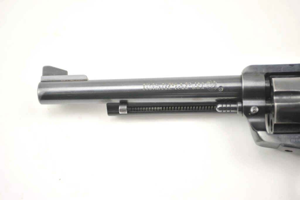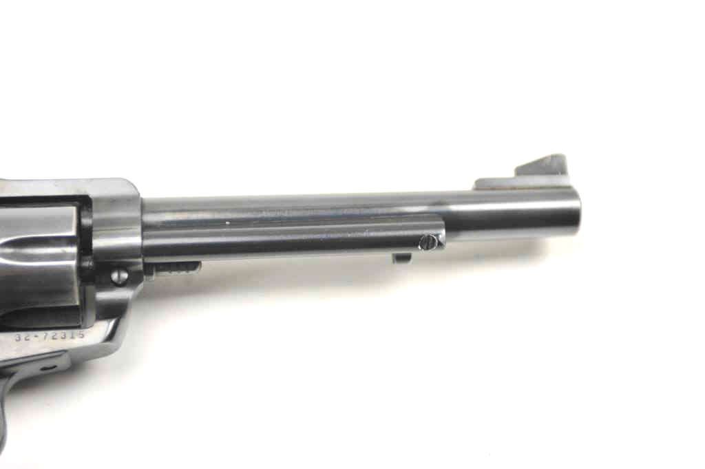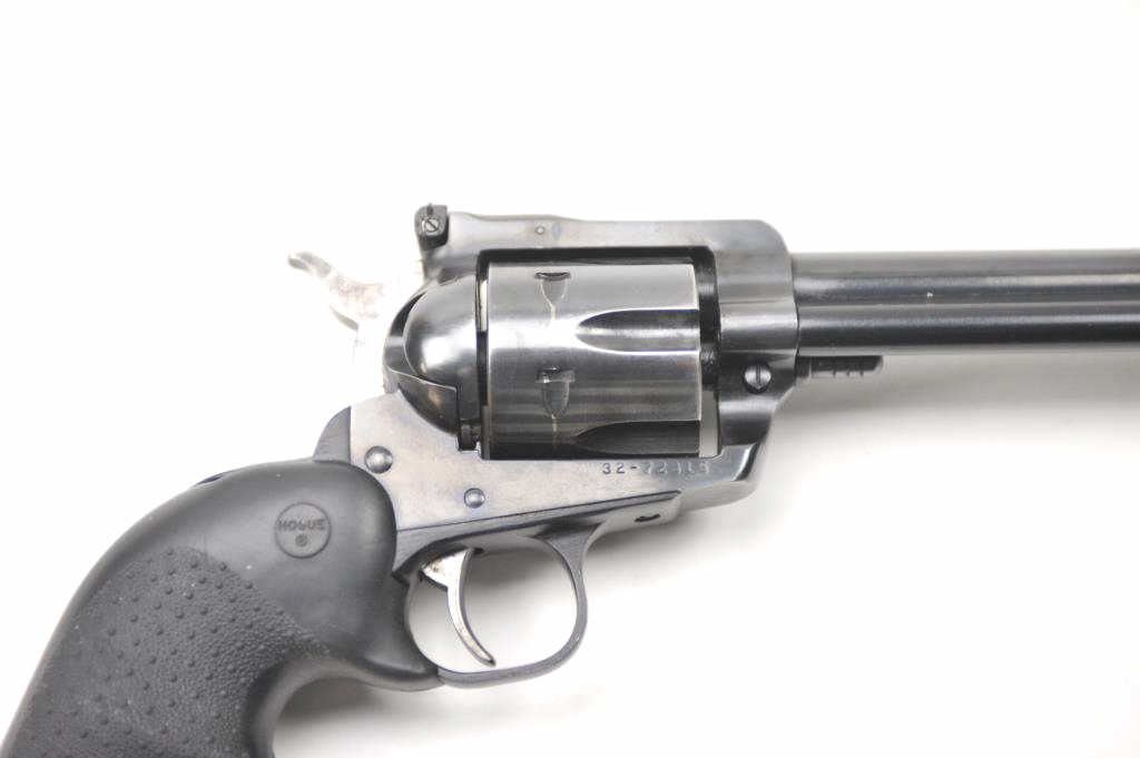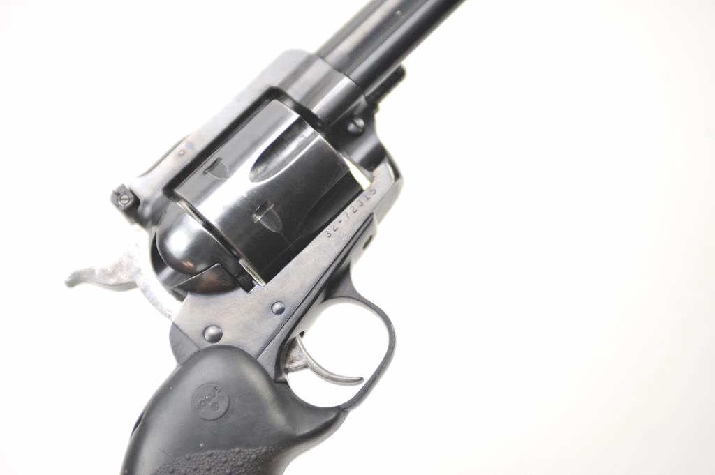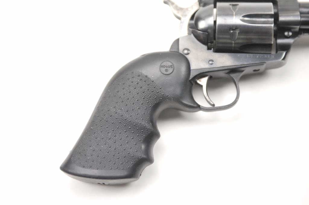 Ruger New Model Blackhawk Flat Top SA revolver, .357 Magnum caliber, Serial #32-72315. The pistol is in fine overall condition with a 6 ½” barrel with a ramped blade front and adjustable rear sights. Thehammer and trigger have been engine turned and the action has been lightened. The pistol retains approximately 93-95% of the original blue finish with edge wear and a faint index line on the cylinder. The textured rubberHogue combat grips are in very good condition. The bore is good, the action is tight and the markings are sharp. Est.: $300-$600. (Modern/PPT).