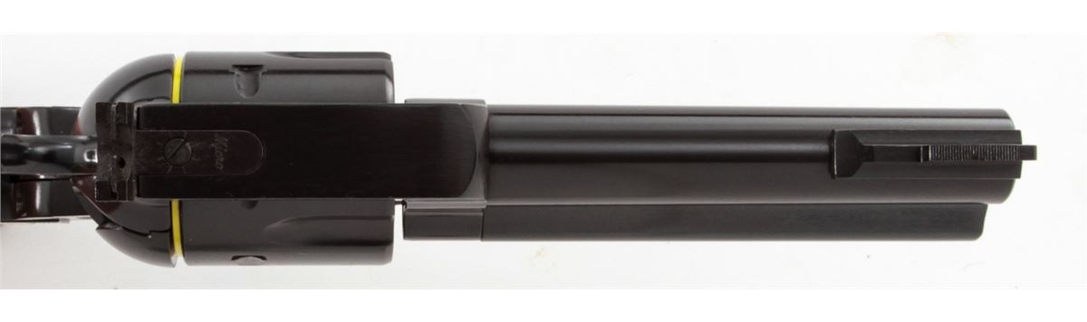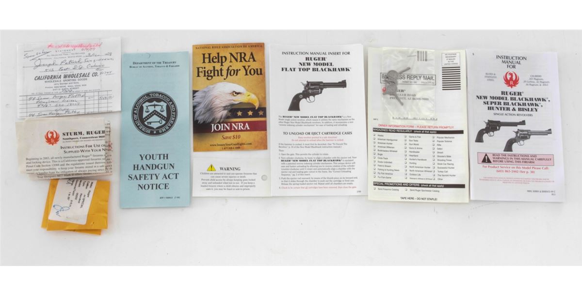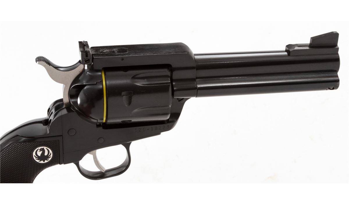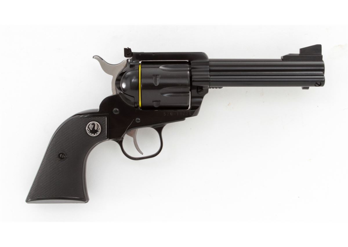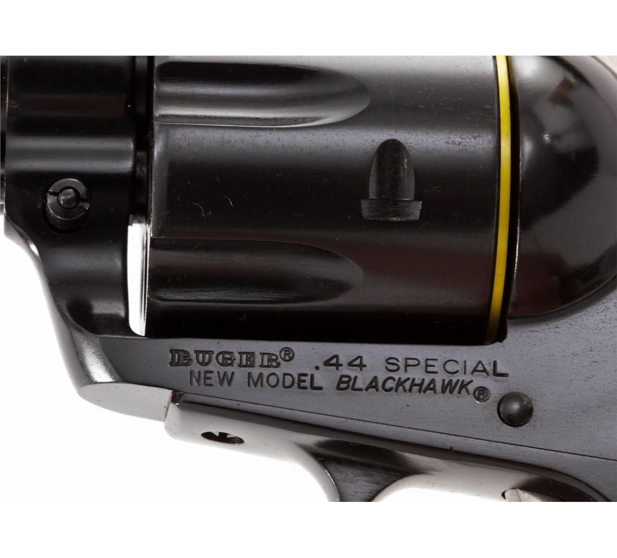 Ruger New Model Blackhawk Revolver, #520-18228, .44 Spec. cal., 4-3/4'' barrel, blue finish, factory checkered black plastic grips. Condition is excellent, appearing near new with light index line, in its original box. Est.: $400-$600. (Modern/PPT)