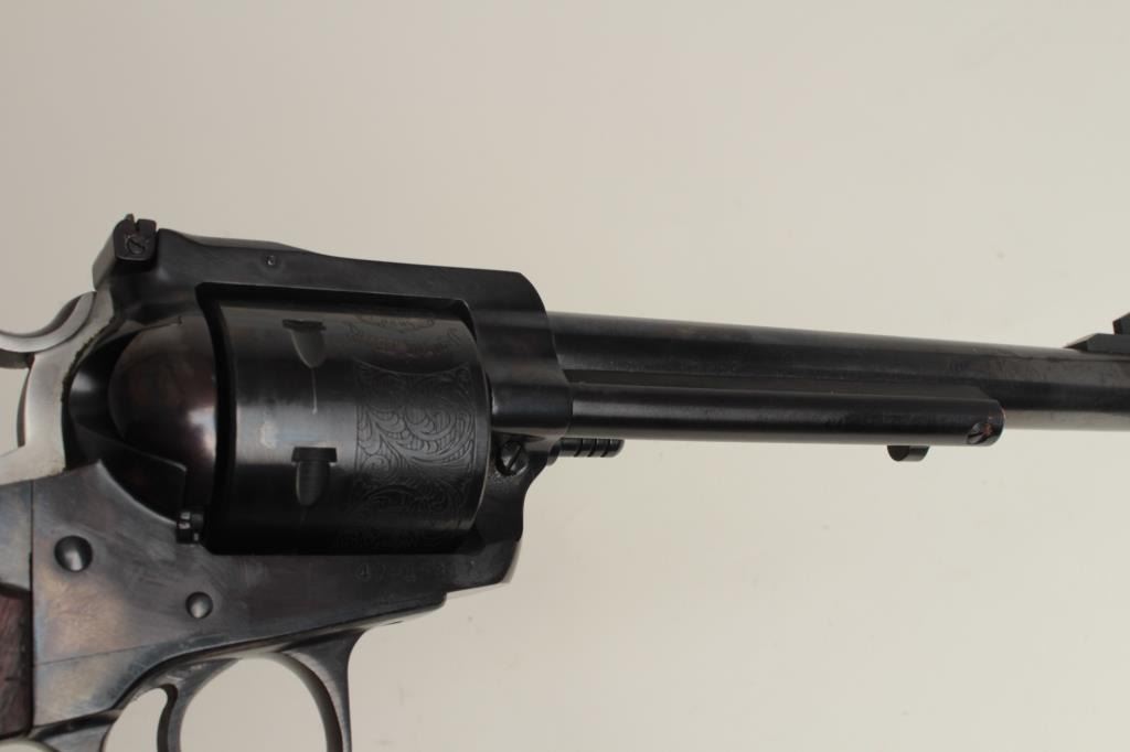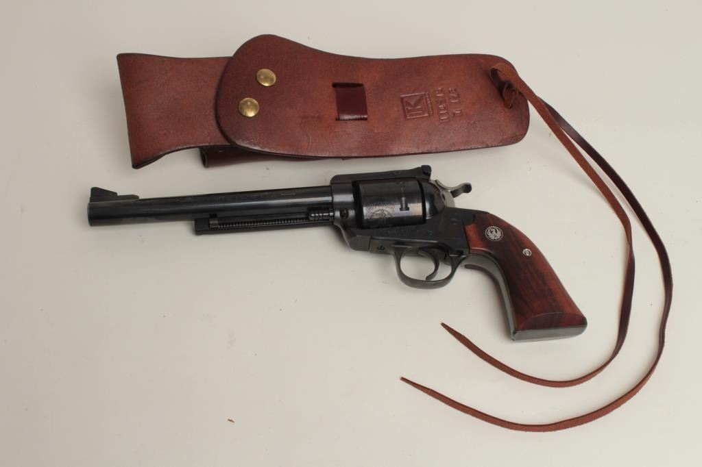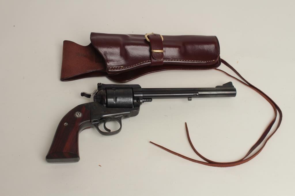 caliber, 7.5” barrel, blued finish, wood medallion grips, S/N 47-15817, in overall fine condition showing high point wear only, fine bore, crisp action, sharp markings and fine grips with some minimal handling mars. Accompanied by a brown leather holster. (C&R/PPT). Est.: $300-$600.