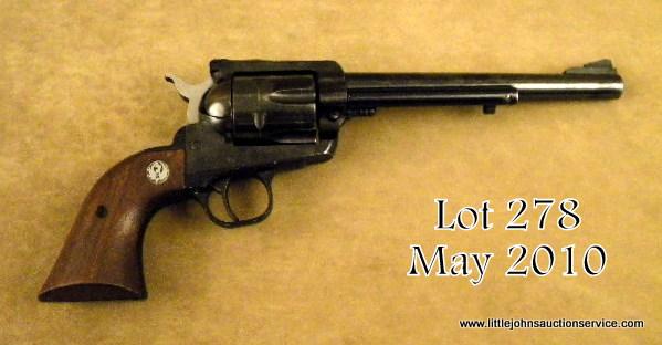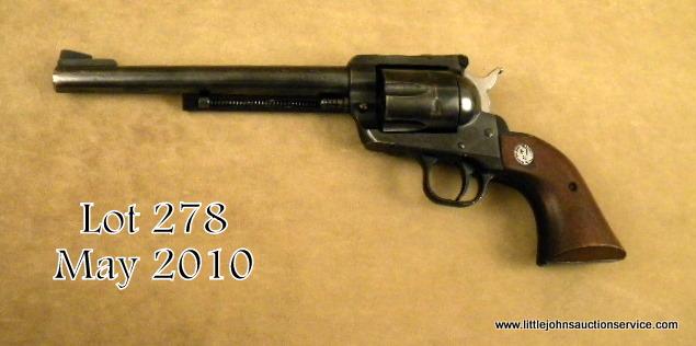 Ruger New Model Blackhawk single action revolver, .30 carbine cal., 7-1/2” barrel, blue finish, Ruger medallion smooth wood grips, #51-01267. This gun is in overall very good condition showing approx. 90% original finish with muzzle wear andsome minor spots of erosion, very good bore, crisp action, sharp markings and very good wood grips with some small scattered scratches and mars from carry and storage. Est.: $250-$500.