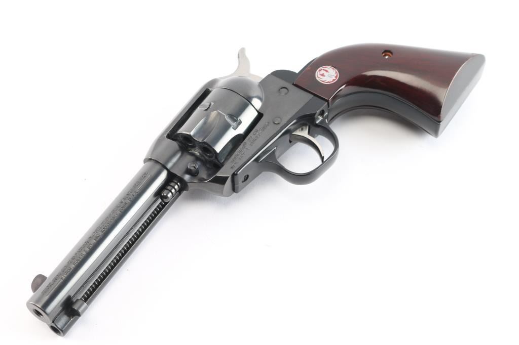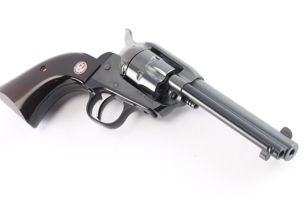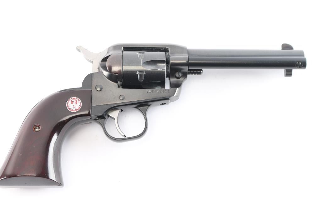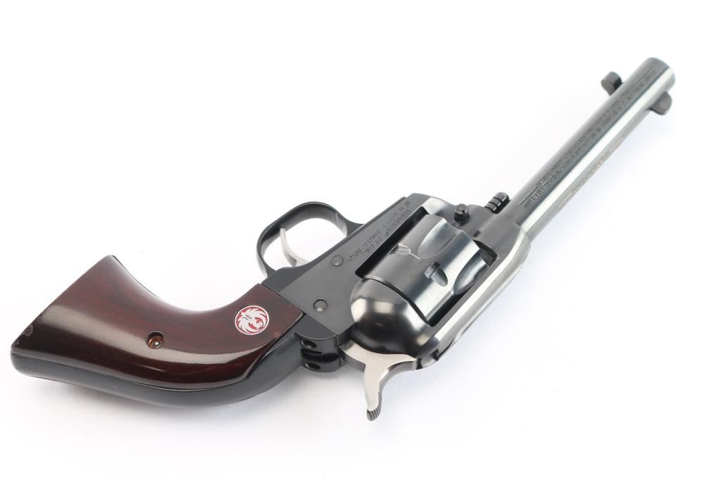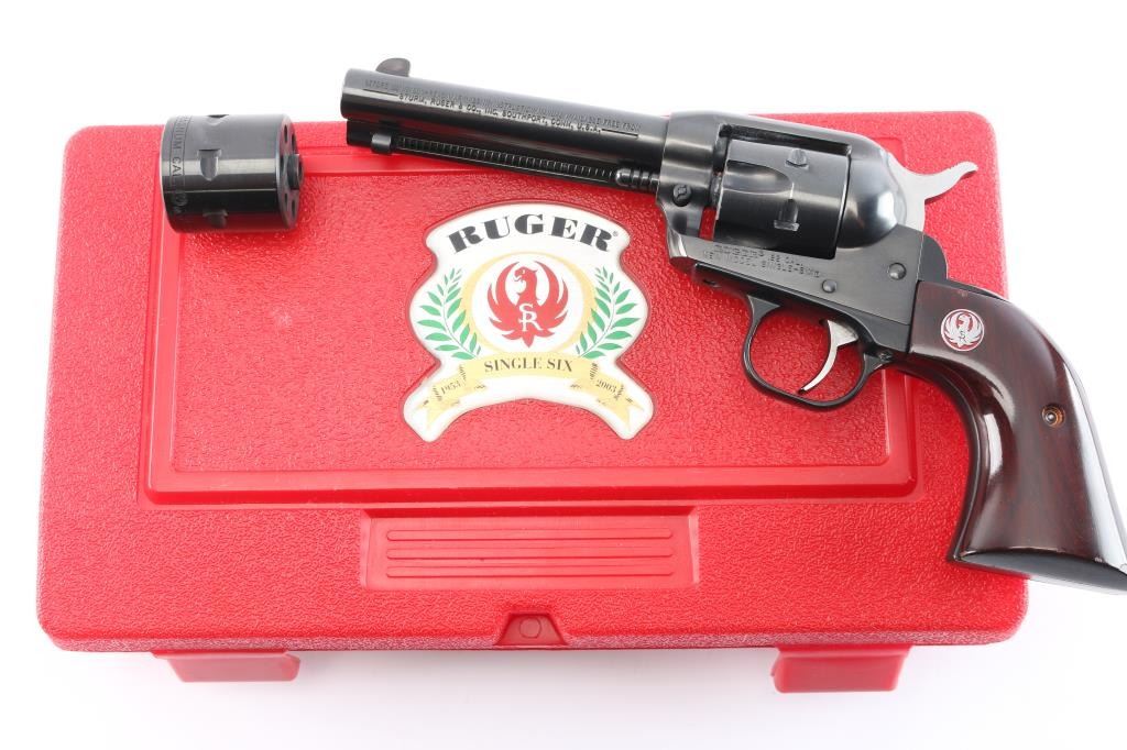 ’50 Years of Single Six’ Western style small frame single action revolver chambered in .22 Long Rifle with a swappable .22 Magnum conversion cylinder. Manufactured in Southport, CT as a 50th Anniversary Edition produced in 2003 to commemorate 50 years of the Single-Six 1953-2003. Features a blued finish, 4 5/8" barrel with gold filled anniversary roll mark, blade front sight, square notched rear sight, ejector rod with flat faced head, smooth curved trigger, serrated hammer spur, transfer bar safety, fluted six-shot cylinder, black finished alloy grip frame, and smooth Cocobolo grips with red/silver Ruger medallions. Includes the original factory special edition red hard case with matching end label, documents, lock, spent case, and factory fitted .22 Magnum unfluted conversion cylinder. Revolver retains approximately 95% of its original finish showing minor edge wear, a partial drag line on the cylinder, and small loss on the triggerguard. The action is smooth with minor play in the lock-up, the bore is excellent and the Cocobolo grips are very good with minor losses to the finish.