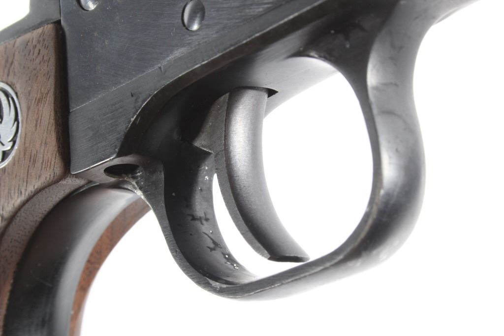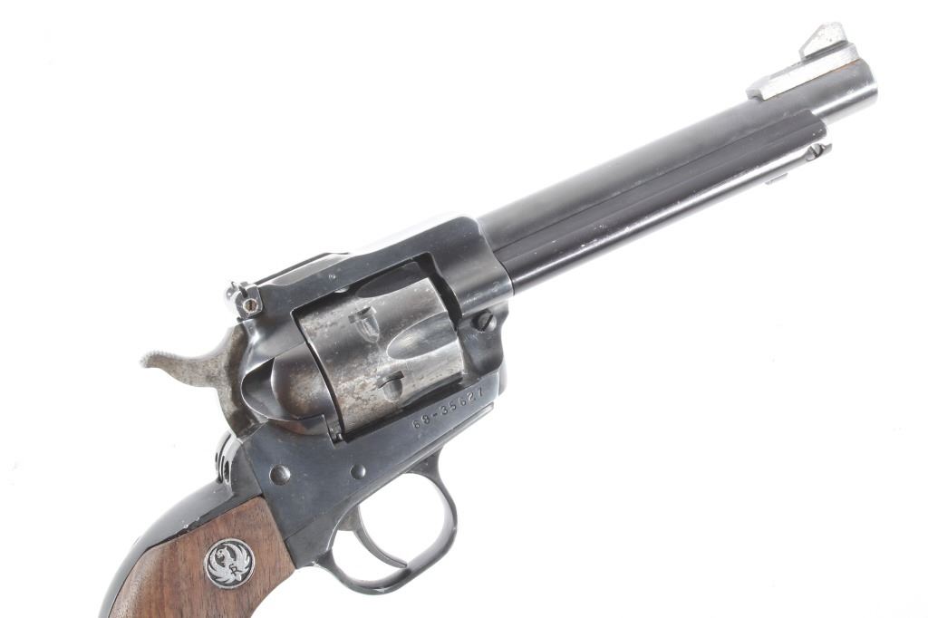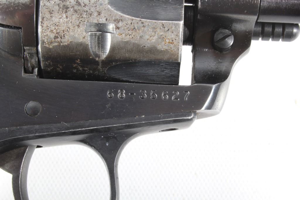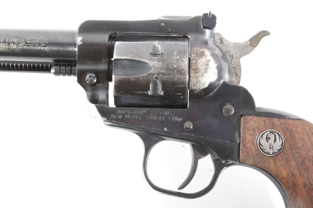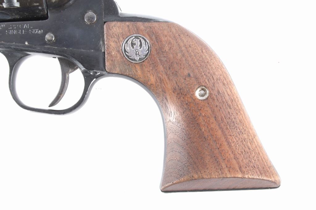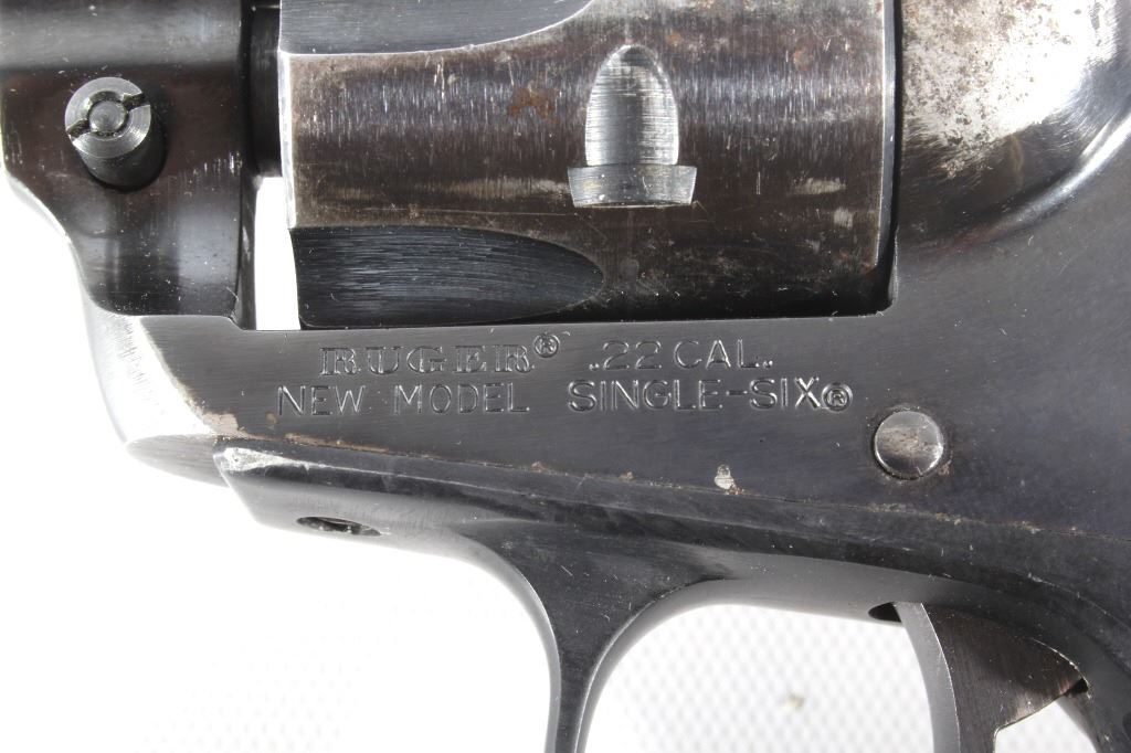 You are bidding on a Ruger New Model Single Six .22 LR Revolver. The revolver features a 5 1/2" barrel, six shot cylinder, walnut grips, adjustable sights, and blue'd finish. The Ruger Single-Six is a single action rimfire revolver produced by Sturm, Ruger. The Single-Six was first released in June 1953. The Single-Six is currently produced as the New Model Single-Six. The term "New Model" simply means that this model includes Ruger's transfer bar mechanism for increased safety, allowing one to carry the revolver safely with all 6 chambers loaded. Prior to 1973, the Single-Six was produced without the transfer bar mechanism, making it less safe to carry with all six chambers loaded, and with the hammer resting on a loaded chamber. The transfer bar safety allows the revolver to fire only when the trigger has been pulled. Ruger provides the transfer bar safety upgrade free of charge for owners of any old model Single-Six. This revolver shows good condition, showing wear to the finish and handling marks. The finish shows 65% bluing. The mechanics are tight and smooth. The bore is shiny with good rifling. This revolver was manufactured in 1981. Modern firearm. FFL transfer or NICS background check required, The serial number is 68-35627