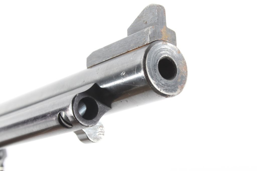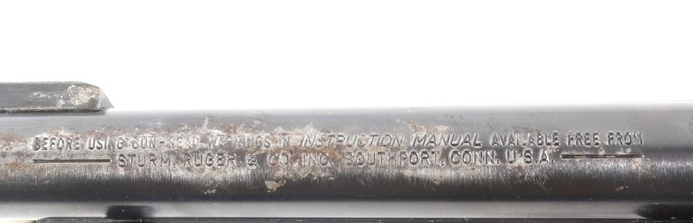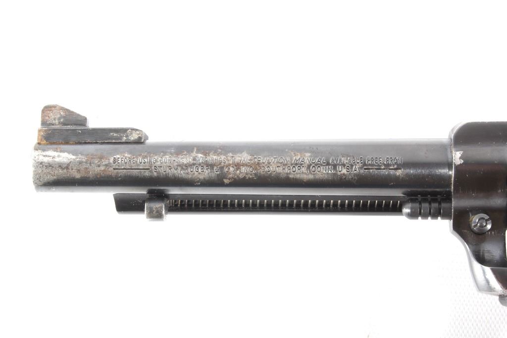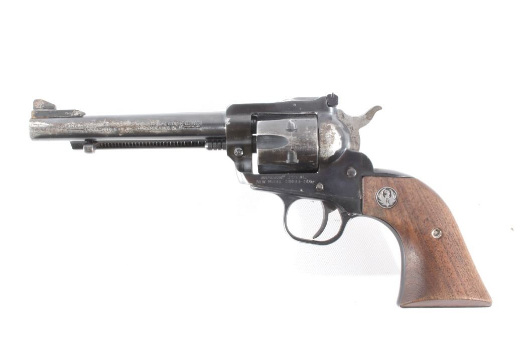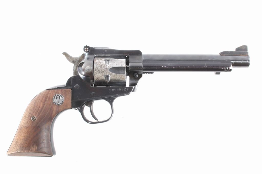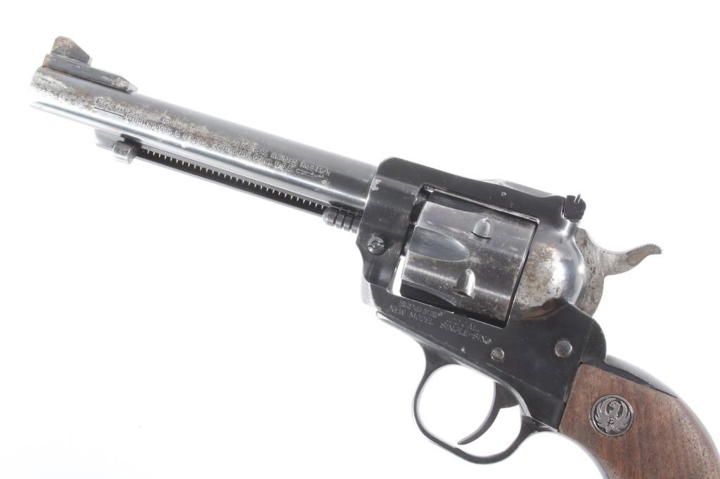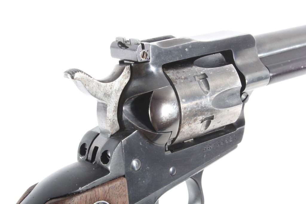You are bidding on a Ruger New Model Single Six .22 LR Revolver. The revolver features a 5 1/2" barrel, six shot cylinder, walnut grips, adjustable sights, and blue'd finish. The Ruger Single-Six is a single action rimfire revolver produced by Sturm, Ruger. The Single-Six was first released in June 1953. The Single-Six is currently produced as the New Model Single-Six. The term "New Model" simply means that this model includes Ruger's transfer bar mechanism for increased safety, allowing one to carry the revolver safely with all 6 chambers loaded. Prior to 1973, the Single-Six was produced without the transfer bar mechanism, making it less safe to carry with all six chambers loaded, and with the hammer resting on a loaded chamber. The transfer bar safety allows the revolver to fire only when the trigger has been pulled. Ruger provides the transfer bar safety upgrade free of charge for owners of any old model Single-Six. This revolver shows good condition, showing wear to the finish and handling marks. The finish shows 65% bluing. The mechanics are tight and smooth. The bore is shiny with good rifling. This revolver was manufactured in 1981. Modern firearm. FFL transfer or NICS background check required, The serial number is 68-35627