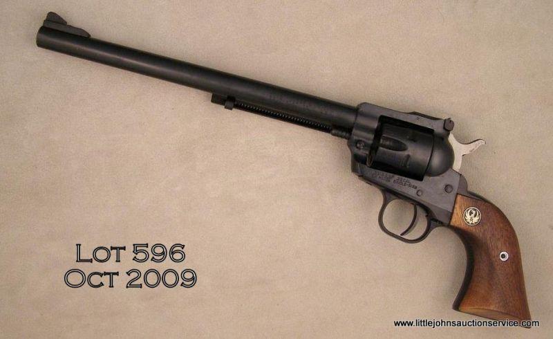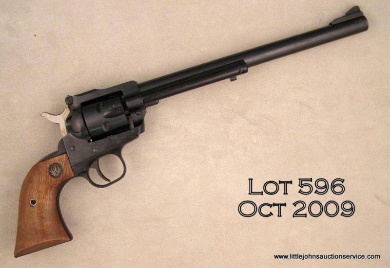 Ruger New Model Single Six Buntline, #64-28554, .22 LR, 9.5" barrel, blued finish, adjustable sights, with wood medallion grips. Revolver is in excellent condition with all associated paperwork, as well as an extra cylinder for .22Mag. Est. $150-$300.