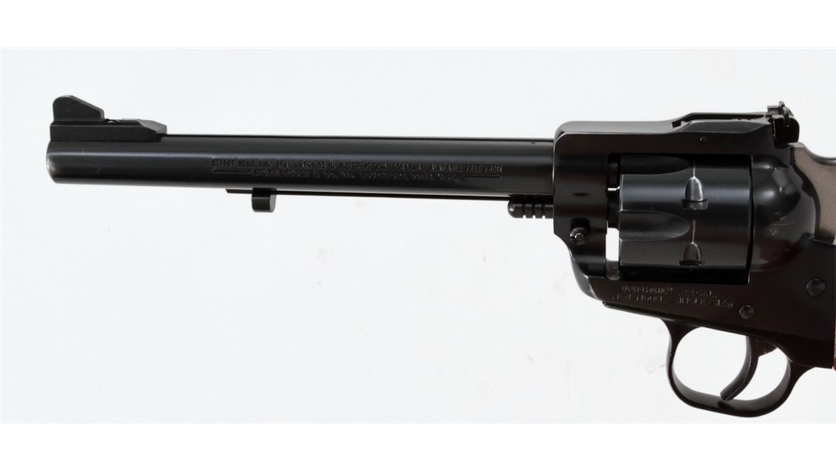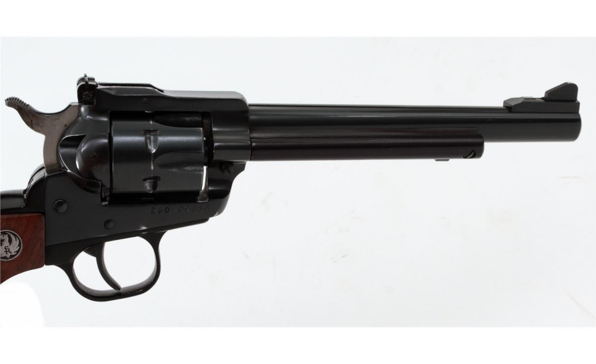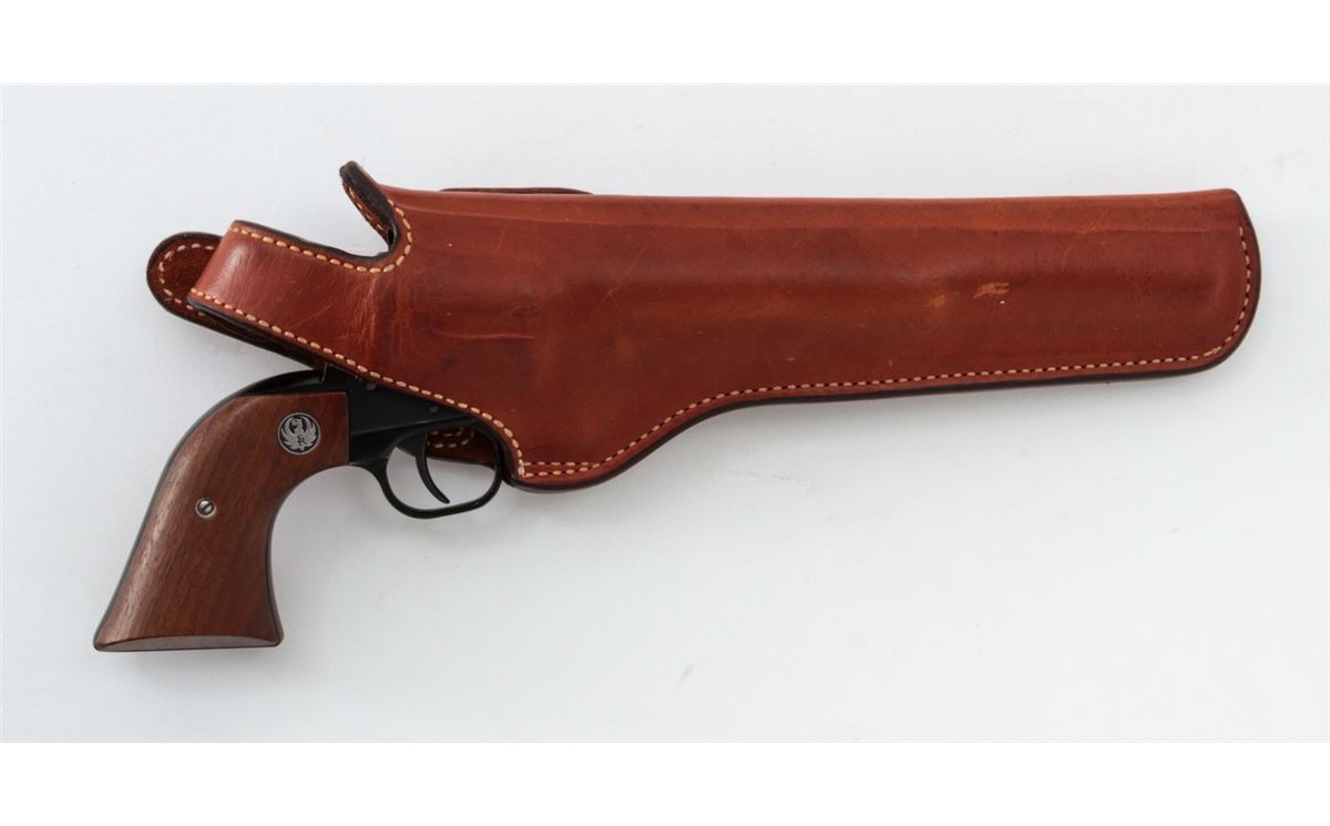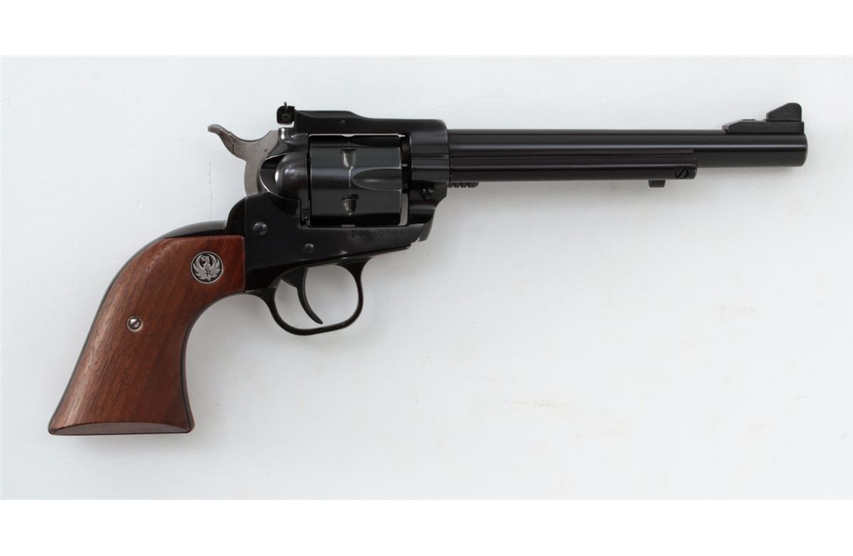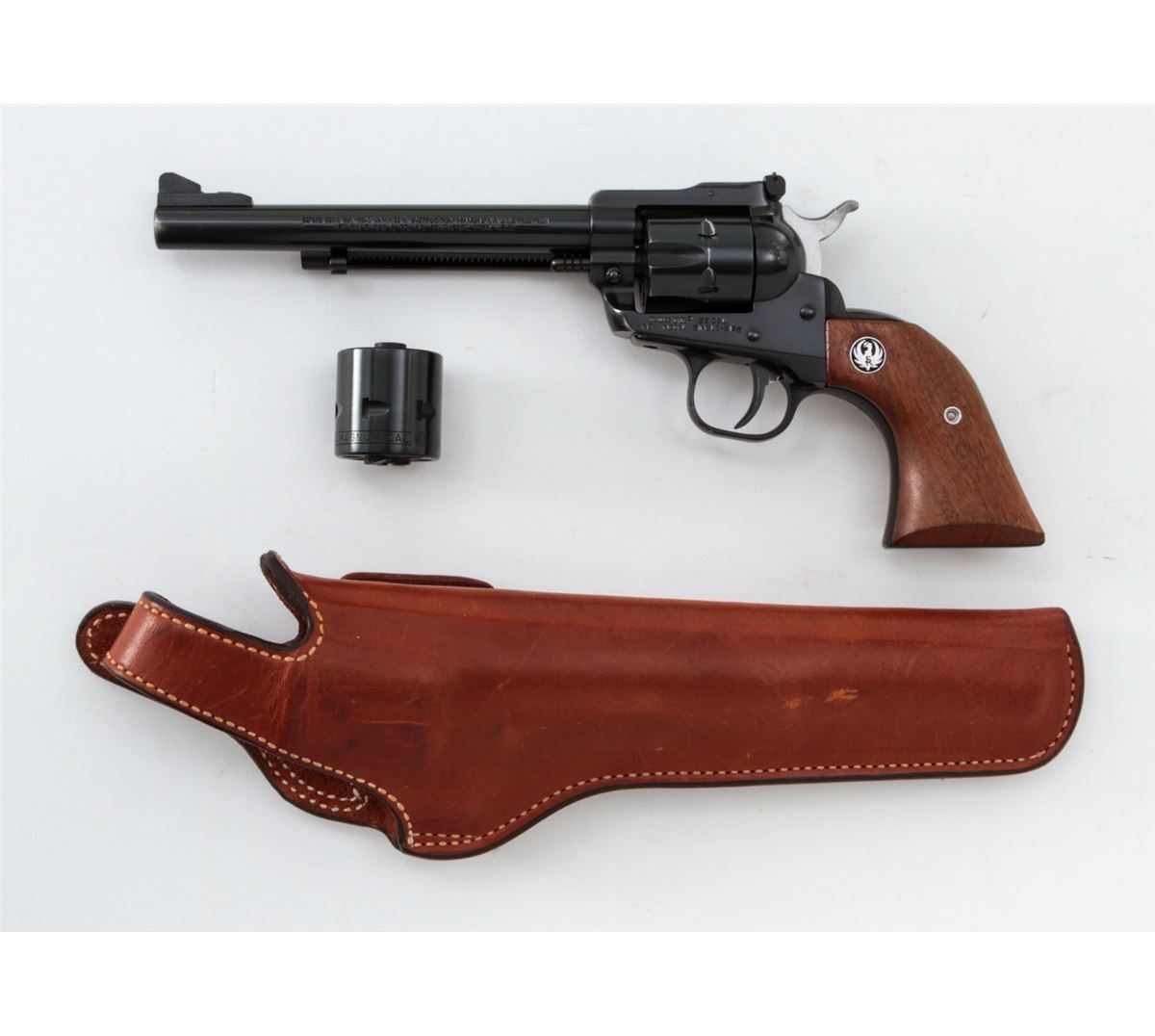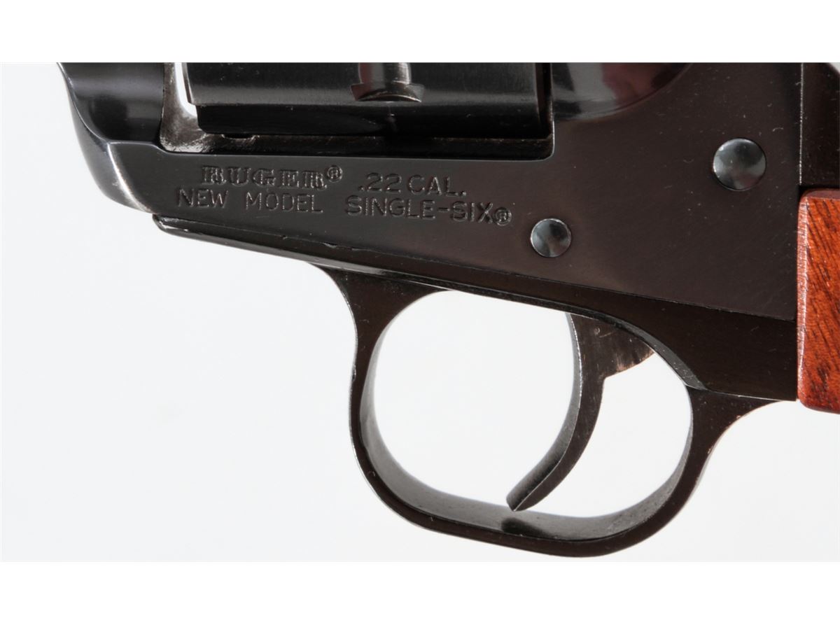 Ruger New Model Single Six Revolver, #260-09858, .22 LR/mag. cal., 6-1/2'' barrel, Blue finish, smooth factory walnut grips, in Bianchi holster. Condition is very good showing light wear at muzzle, with light index line to cylinder. Est.: $250-$400. (Modern/PPT)