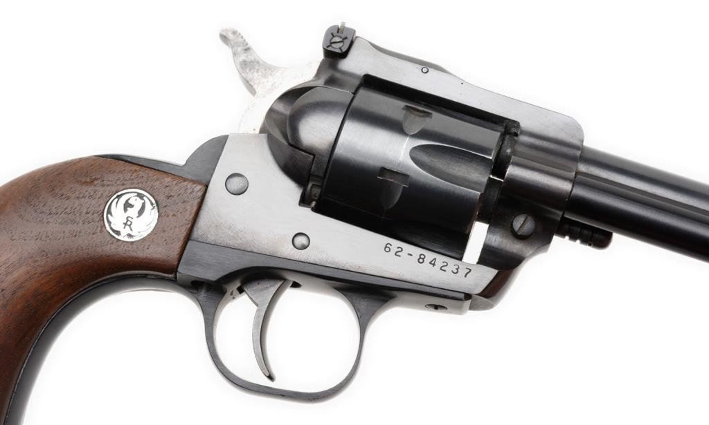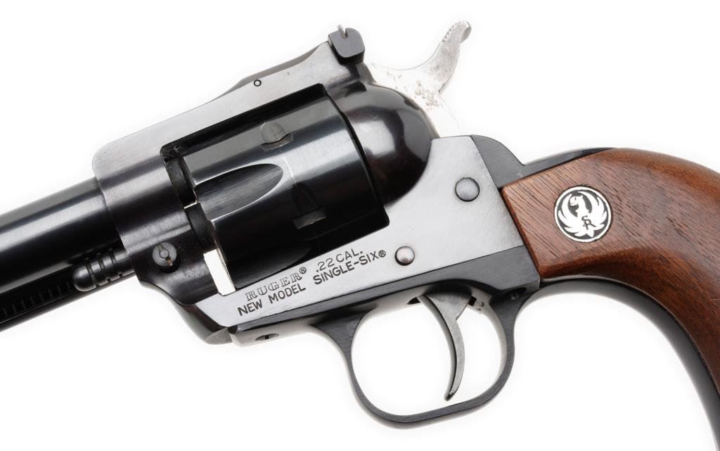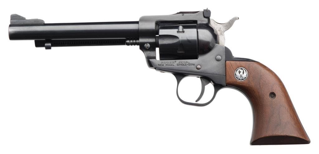 ++Ruger New Model Single Six Single Action revolver, .22 caliber, 5.5” barrel, S/N 62-84237, black finish, smooth wood black medallion grips. This gun is in overall fine condition showing the majority of its original finish, crisp action and markings, very good to near fine bore and fine grips. Est.: $250-$500.