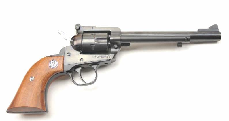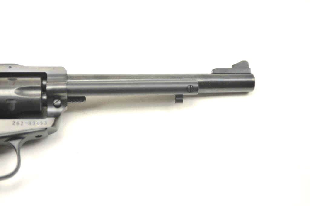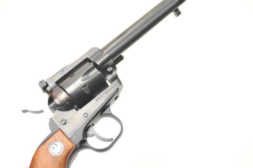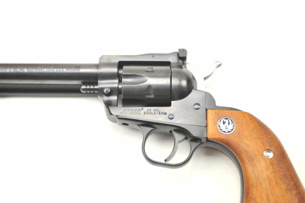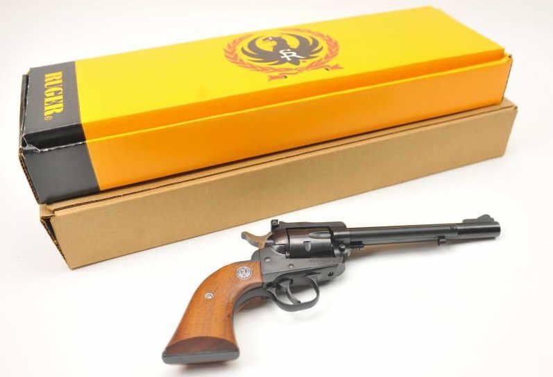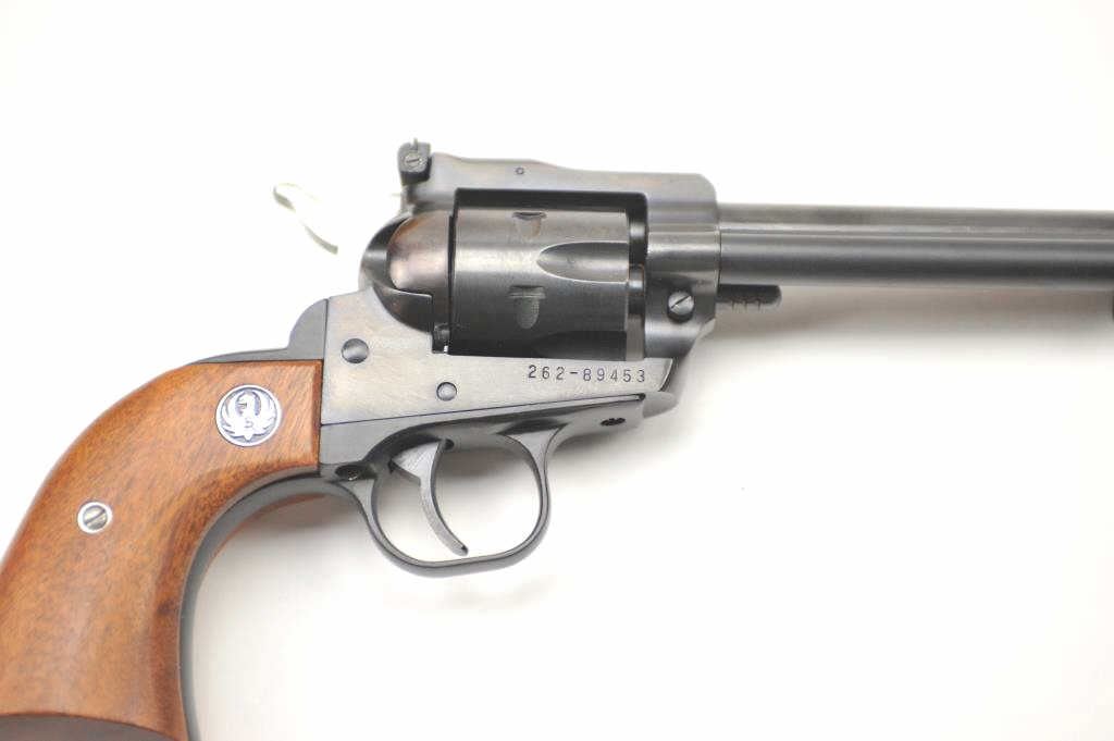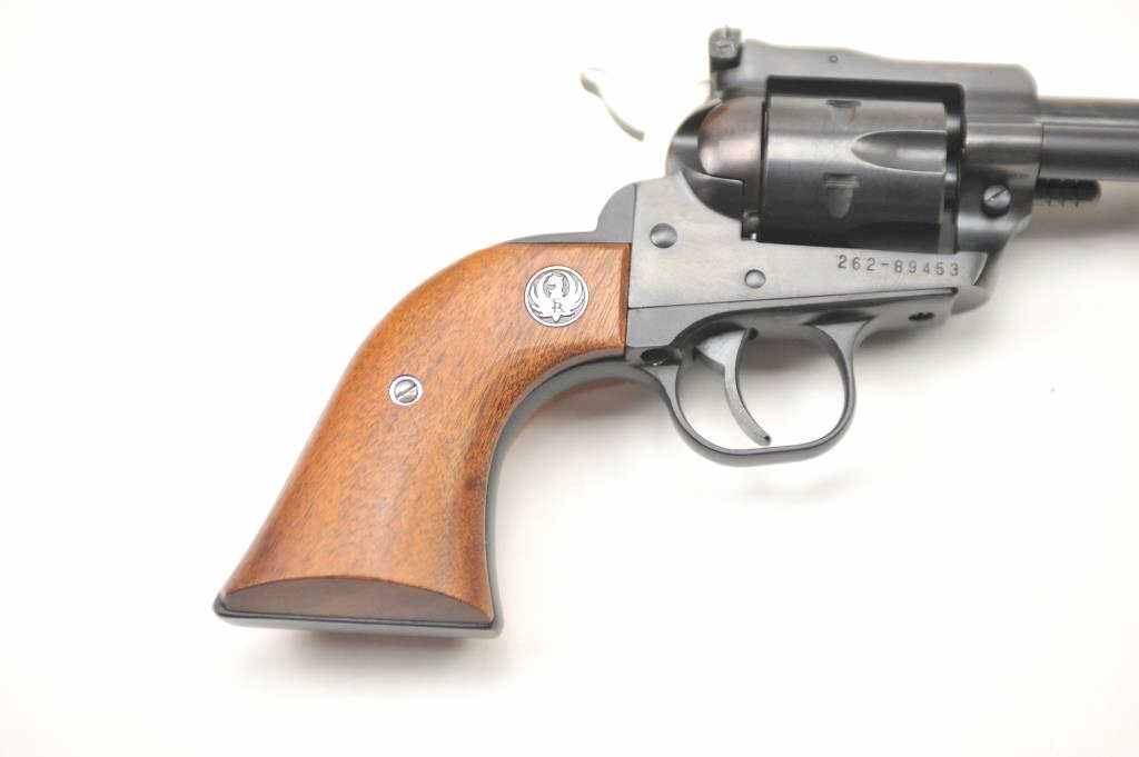 Ruger New Model Single Six revolver, Serial #262-89453, in .22 Long Rifle with an extra cylinder in .22 Magnum caliber. The pistol has a 6 ½” barrel in the original box with all associated paperwork, slip cover andmatching end label. The pistol is in 99.8-99.9% overall condition, showing light handling marks, test firing and appears nearly new. The 30 year old plus pistol shows no signs of use. Est.: $250-$500.(Modern/PPT).