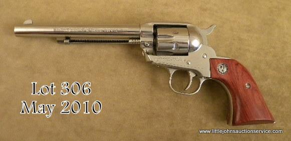 Ruger New Model Single Six single action revolver, .22 cal., 6-1/2” barrel, stainless steel, smooth wood Ruger medallion grips, #268-19946. This gun is in overall excellent condition showing little use or handling with an extra .22 Magnum cylindeand a blued .22 Win. Mag. cylinder; fine bore, crisp action, sharp markings and excellent grips; accompanied by a grey Ruger molded plastic carry case. Est.: $250-$350.