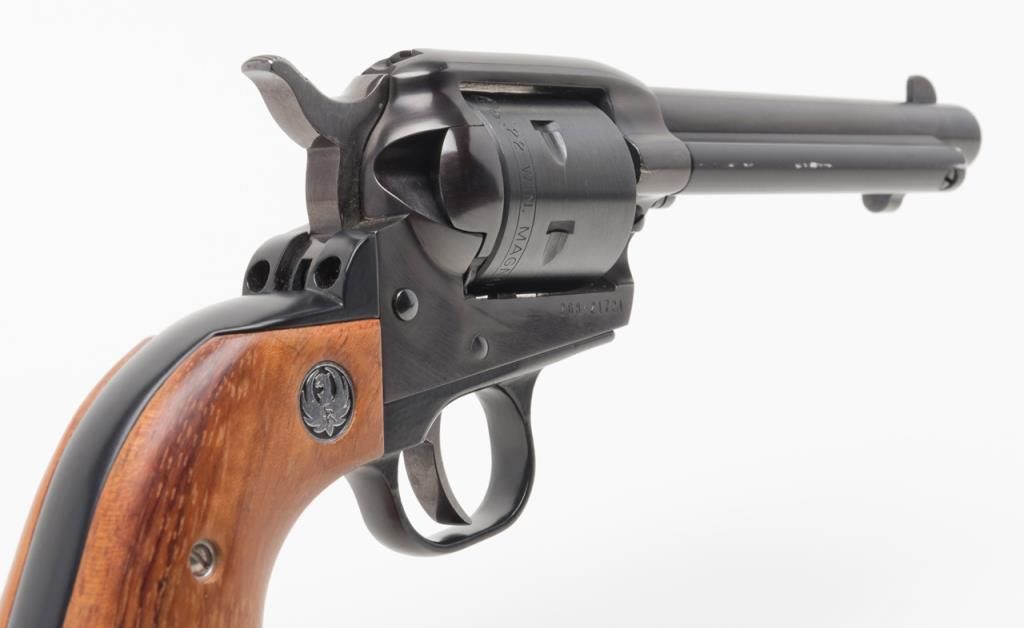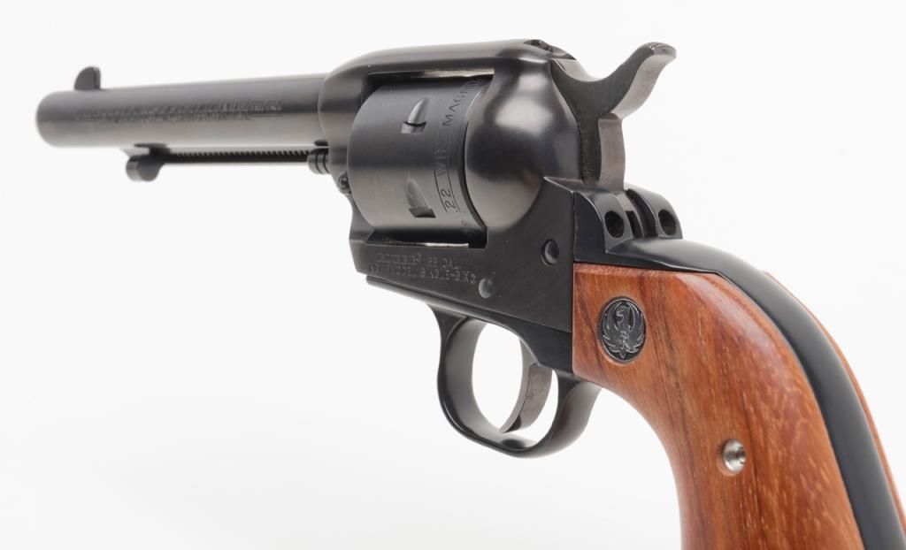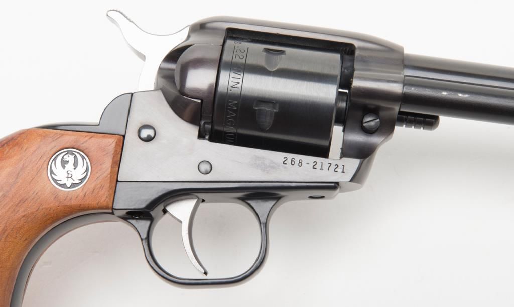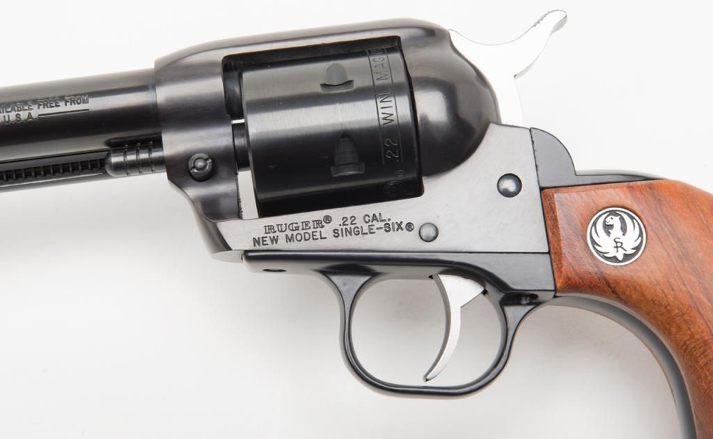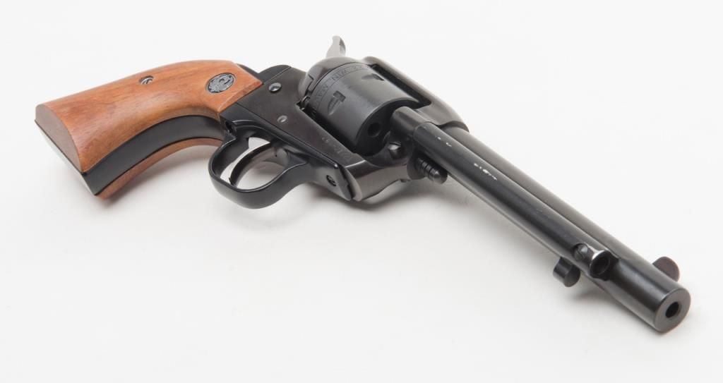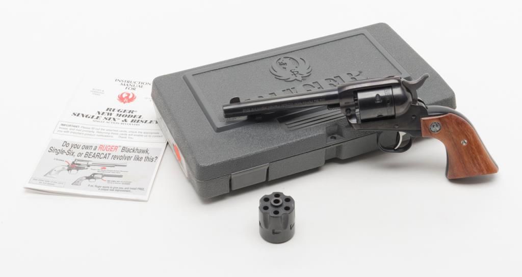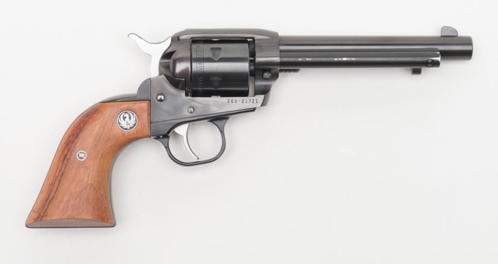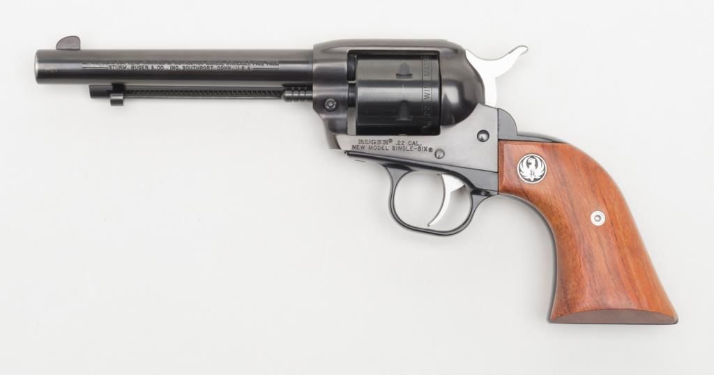 Ruger New Model Single-Six single action revolver in .22LR caliber with extra Magnum cylinder,5 1/2" barrel, smooth wood medallion grips, serial number 268-21721. This revolver remains in very good plus used condition with some wear to themuzzle and ejector rod housing. Both the .22 Mag and .22LR cylinders show a index line. In original box with instruction manual. Est.: $200-$400