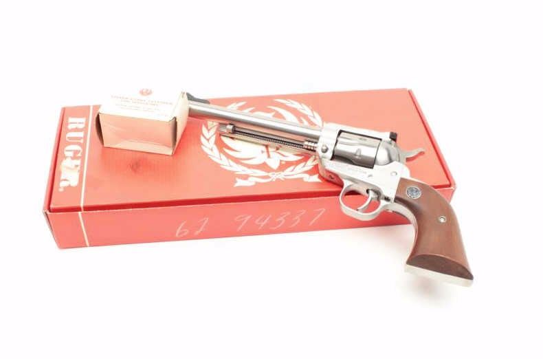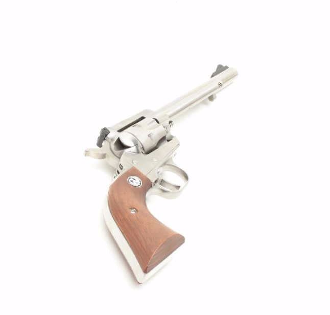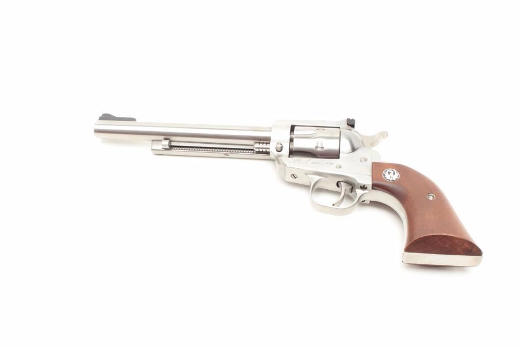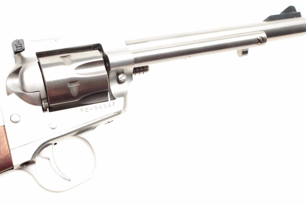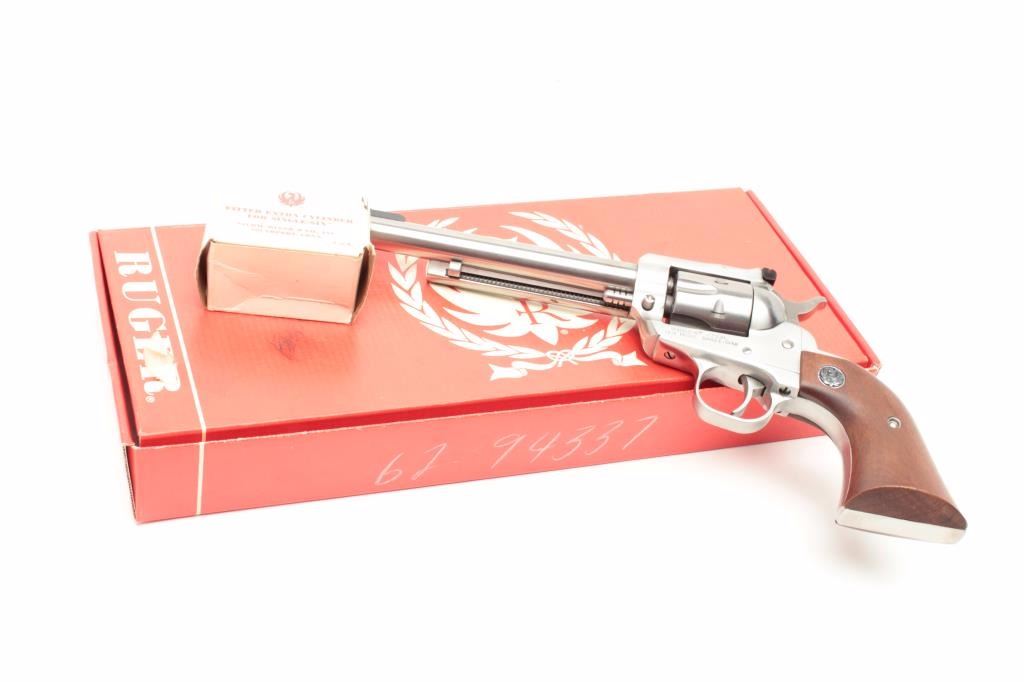 Ruger New Model Single-Six stainless steel single action revolver with 6 ¼” barrel in .22 L.R. and magnum cylinder, S/N 62-94337. In excellent to new in the box. (Modern/PPT) Est.: $275-550