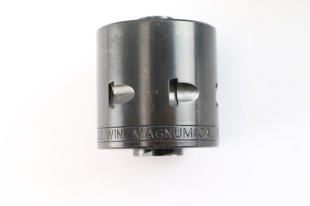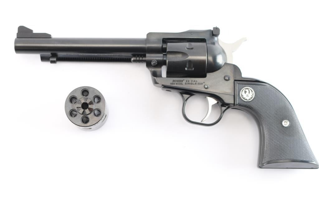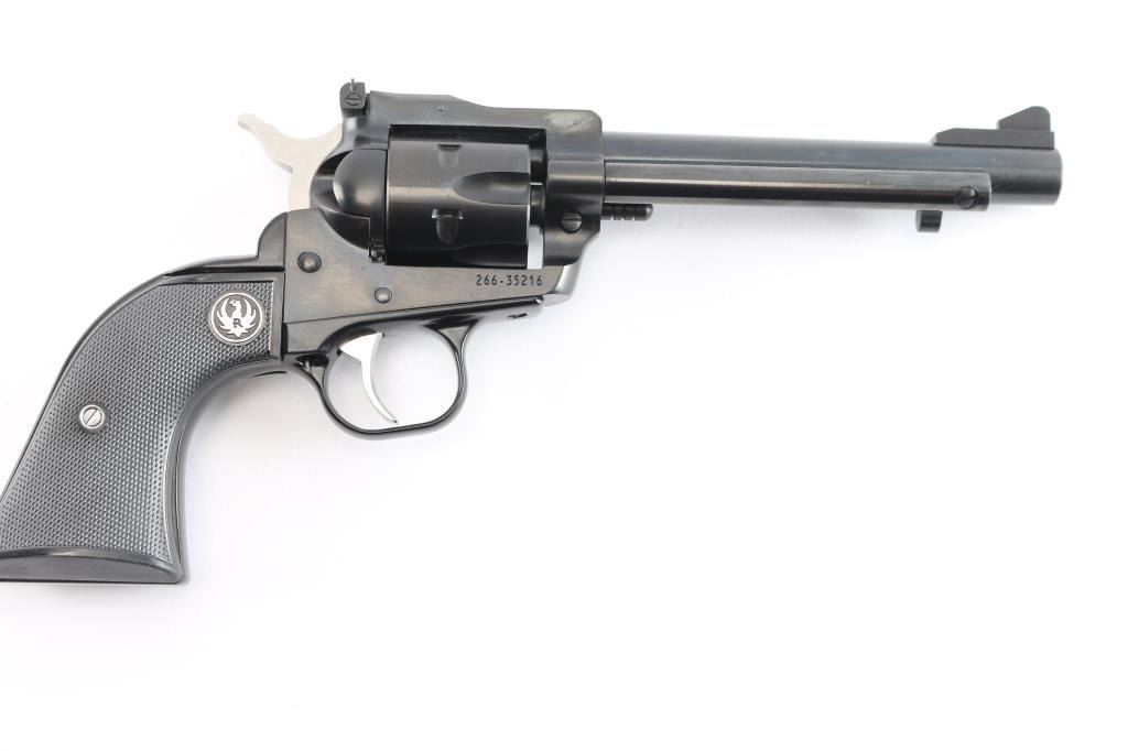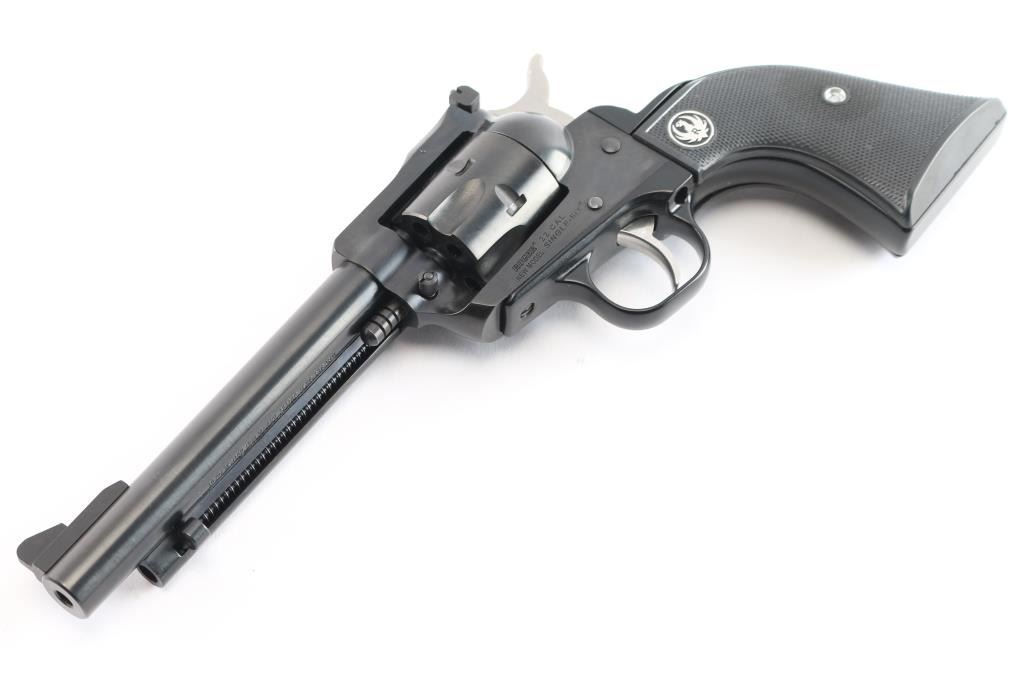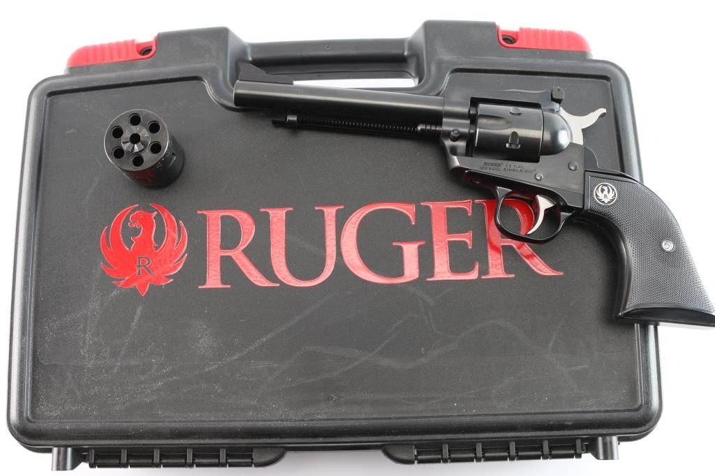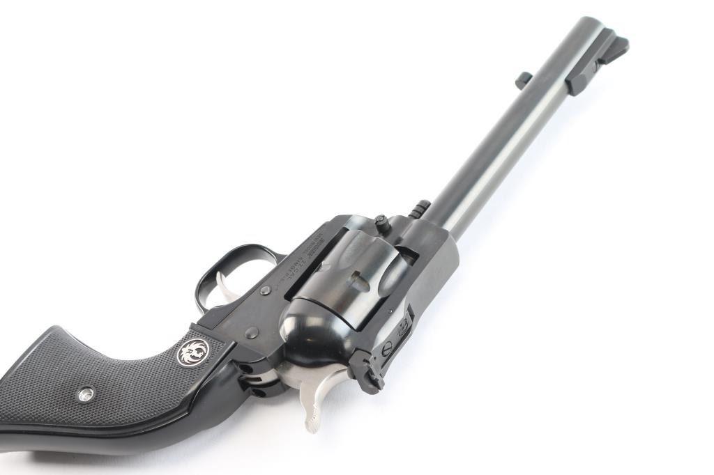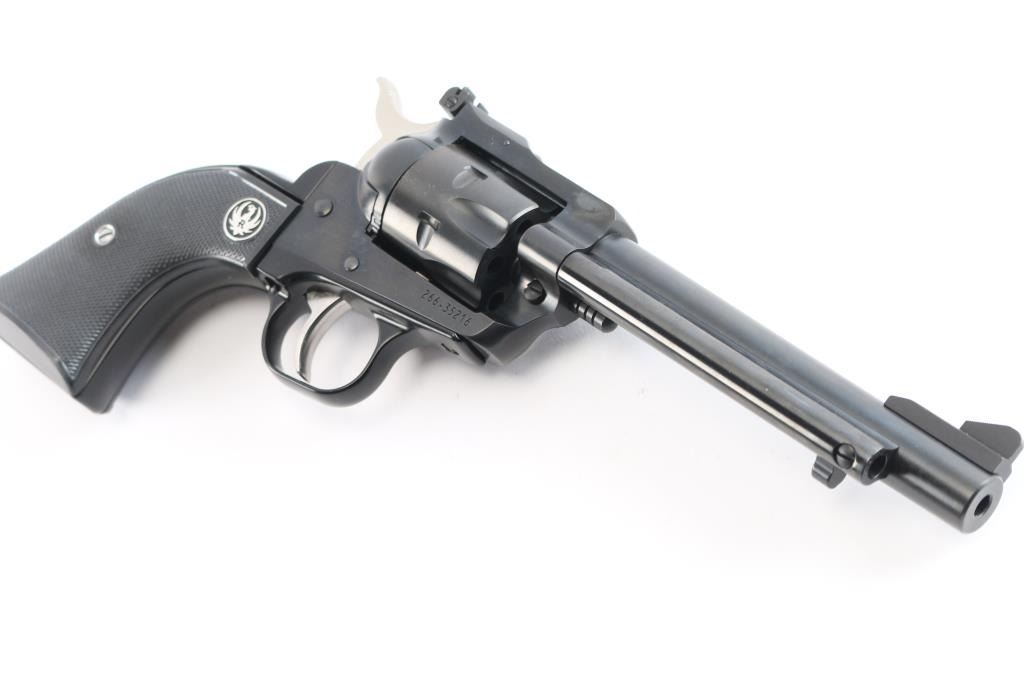 American made western style small frame single-action revolver chambered in .22 Long Rifle with a interchangeable .22 Magnum conversion cylinder. Manufactured circa 2024 in Newport, NH. Revolver features a blued finish, 5-1/2" barrel, raised serrated fixed blade front sight, micrometer adjustable square notched rear sight, ejector rod with round button, smooth curved in-the-white trigger, in-the-white external hammer with serrated spur, transfer bar safety, fluted six-round cylinder, collard cylinder pin head, black finished aluminum grip frame, smooth grip straps, and checkered two-piece black hard rubber grips with silver Ruger medallions. Revolver retains approximately 99% of its original blued finish with nothing remarkable. Metal displays no rust or deformation. The action is smooth and crisp with a tight lock-up. The bore is bright with strong rifling, and the cylinder chambers are excellent. The hard rubber grips are also excellent. The .22 Magnum cylinder is in excellent condition. Revolver includes the original black factory hard case with end label, documents, sticker, lock, and a factory fitted .22 Magnum unfluted conversion cylinder.