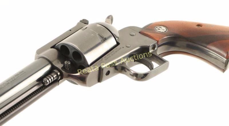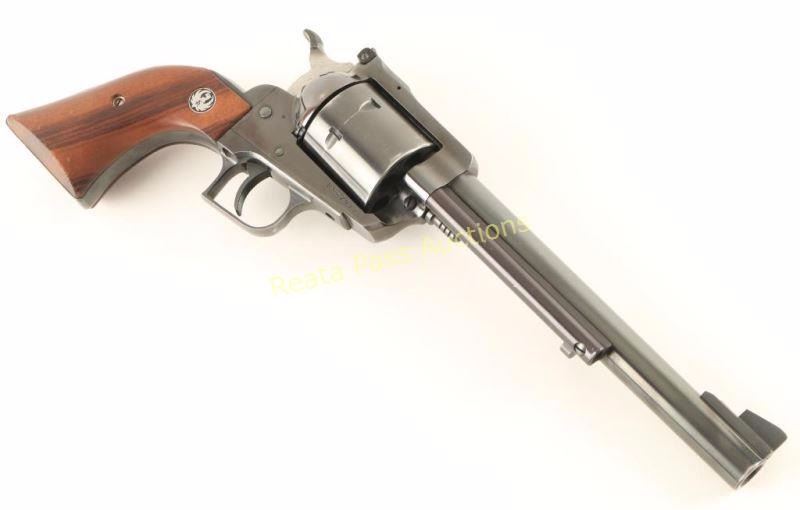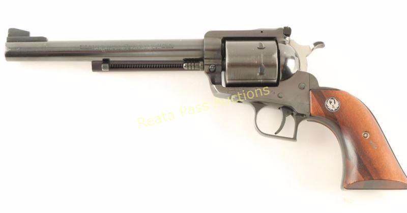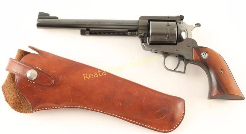 SN: 85-79778 Single action six-shot revolver chambered in .44 Magnum, circa 1987. Featured a blued finish, 7.5" barrel, ejector rod, large blade front sight, adjustable rear window sight(missing pin), non-fluted six shot cylinder, transfer bar safety, serrated hammer spur, square back trigger guard, serrated trigger, and two-piece smooth wood grips with Ruger medallions. Includes a Hunter Sure-Fit smooth brown leather belt loop holster. Revolver exhibits approximately 90% of it's original finish showing holster wear and a drag line. Action is smooth with good lock-up, bore is very good+ and grips are very good with a few small losses on the bottom of the right panel. Condition is very good. ***Modern Firearm***