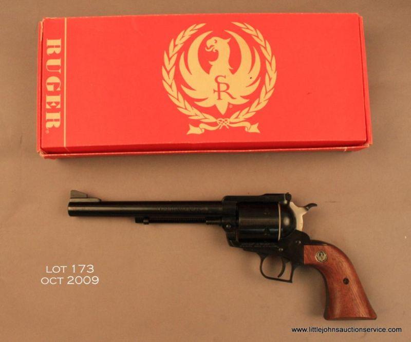 Ruger New Model Super Blackhawk, #81-64431, .44 Mag., 7.5" barrel, blued finish, adjustable sights, smooth wooden grips with medallions. Revolver is in excellent condition overall, and appears unfired. In it's original red Ruger boxwith all paperwork. Manufactured in 1976, and marked "Made in the 200th Year of American Liberty." Est. $150-$300.