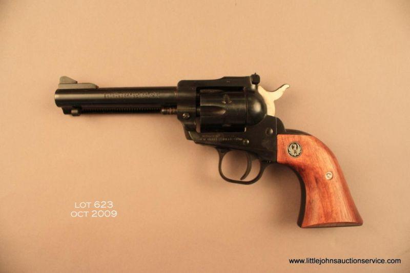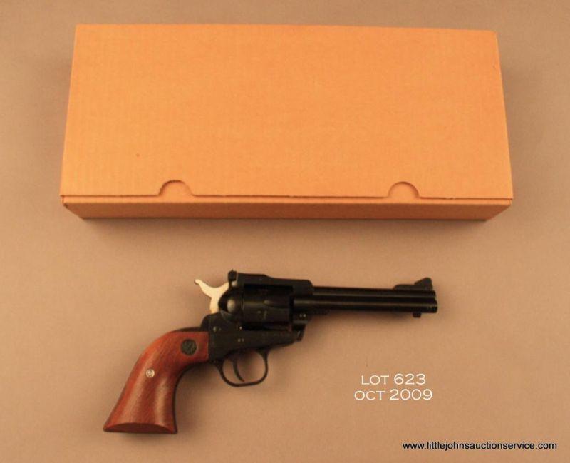 Ruger New Model Super Single Six, #64-49421, .22 LR, 4.5" barrel, blued finish, adjustable sights, with wood medallion grips. Revolver is in excellent condition in its original box with all associated paperwork, as well as an extra cylinder for .22 Mag. Manufactured in 1976, and marked "Made in the 200th Year of American Liberty". Est. $150-$300.