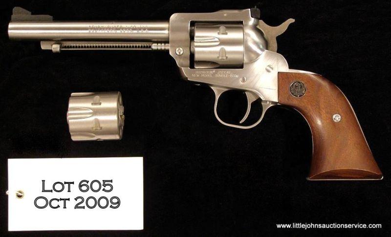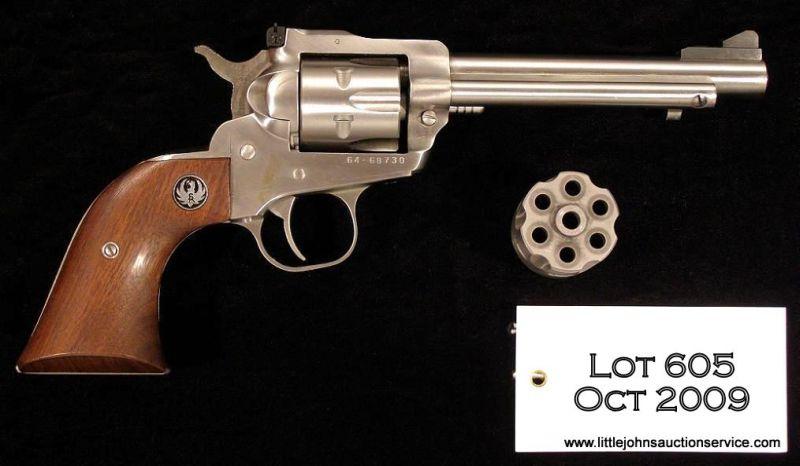Ruger New Model Super Single Six, #64-68730, .22 LR, 5.5" barrel, stainless finish, adjustable sights, with wood medallion grips. Revolver is in excellent condition in it's original box with all associated paperwork, as well as an extracylinder for .22 Mag. Manufactured in 1976, and marked "Made in the 200th Year of American Liberty". Est. $150-$300.