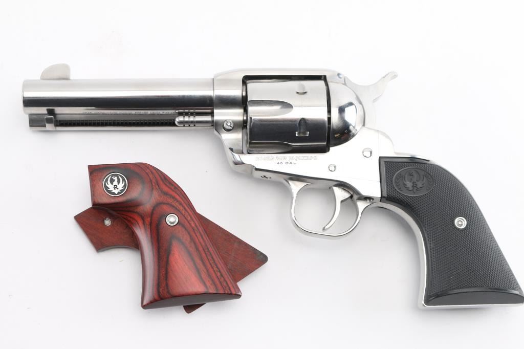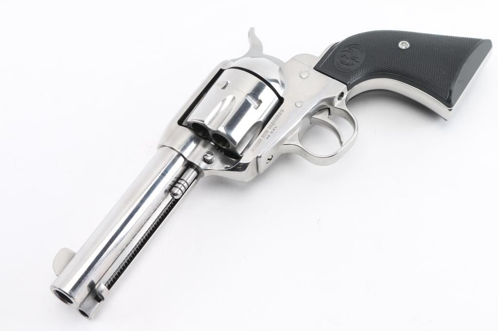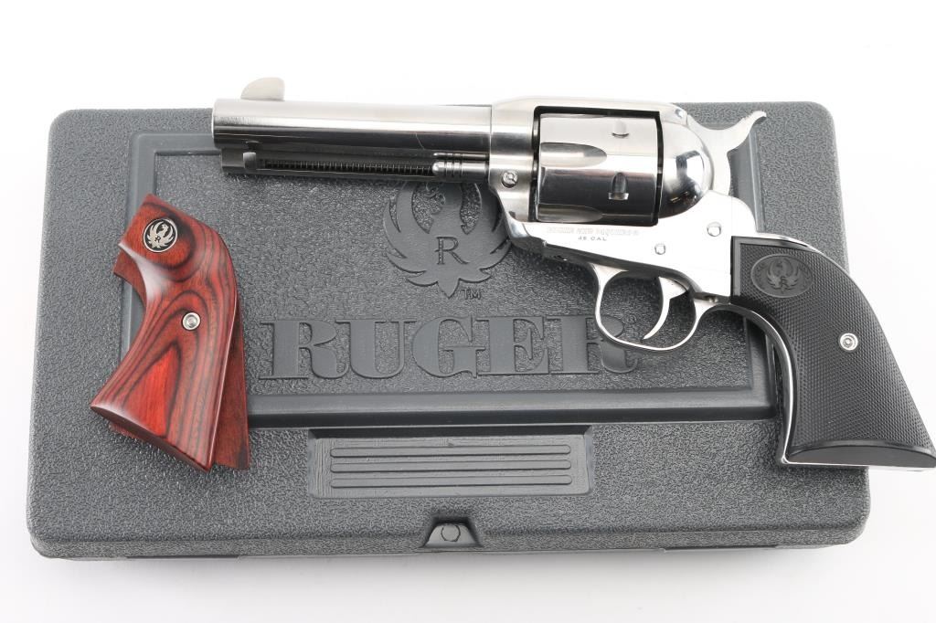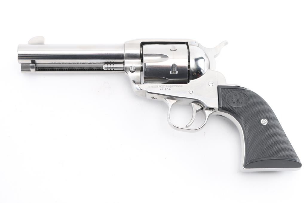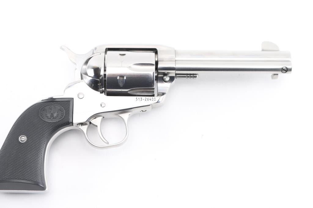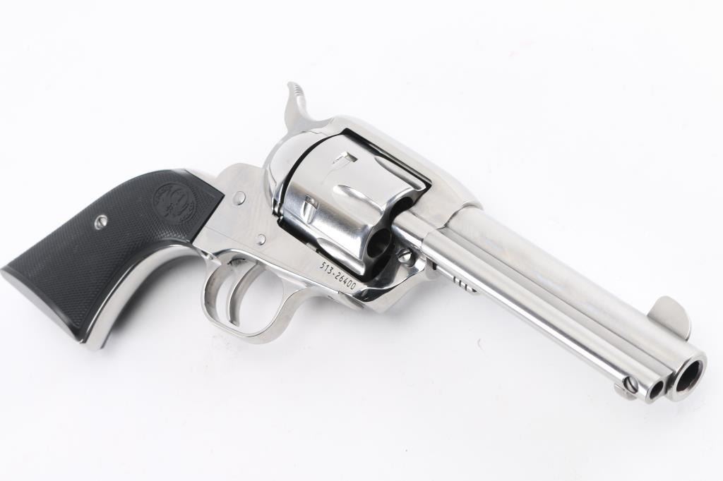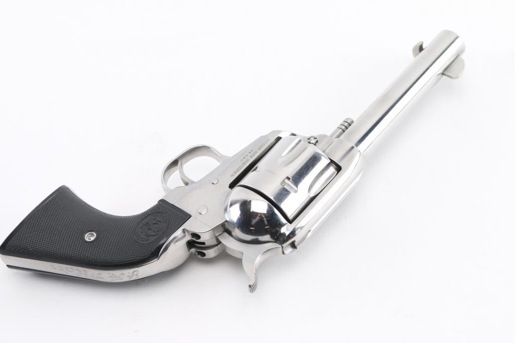 Single action revolver features stainless steel construction, checkered 'hard rubber' grips with Ruger monograms, 4 3/4" barrel with fixed sights, ejector rod under barrel, 6 shot fluted cylinder, loading gate on right side. Manufactured 2018. Bore is pristine. Overall appearance is like new, with minor scratches. Backstrap engrave "J.A. Wilder" Includes factory gray plastic box, manual. lock, & set of rosewood grips with black & silver Ruger medallions. Condition is NRA Excellent. Modern Firearm.
