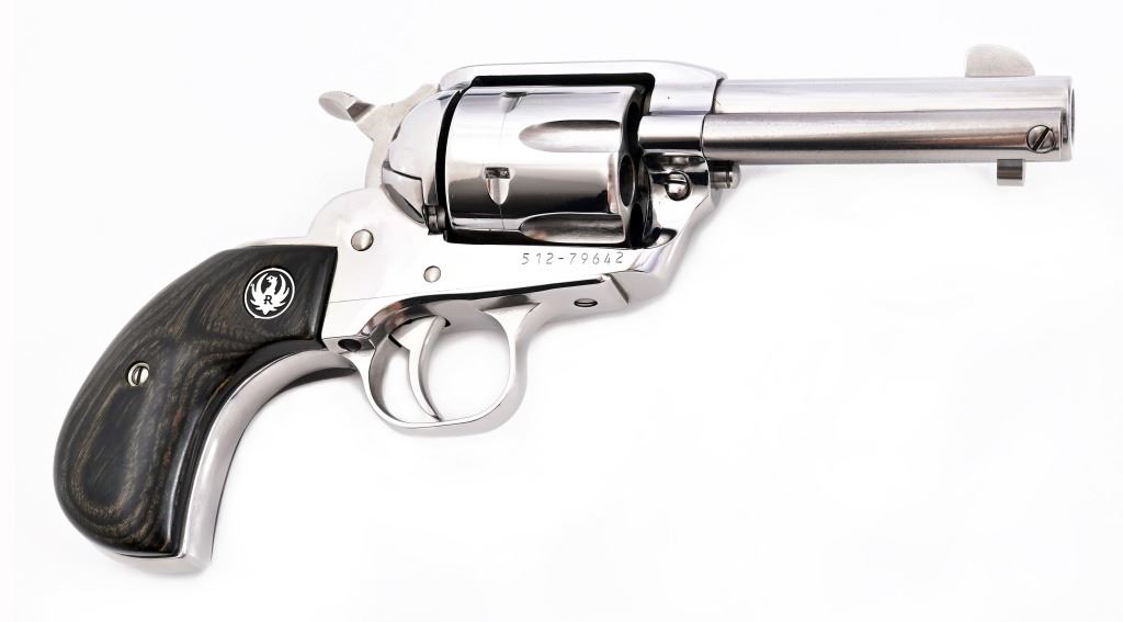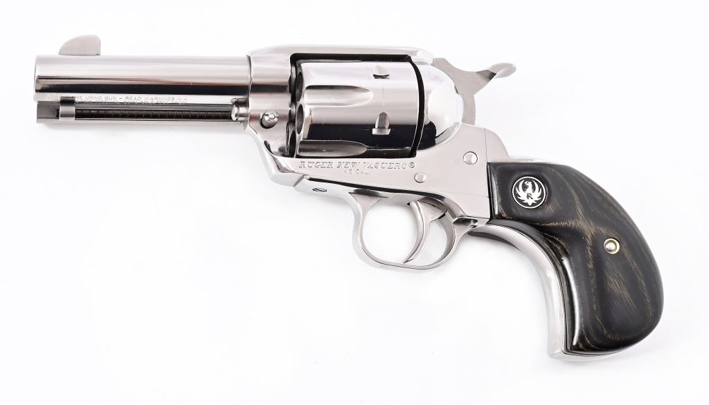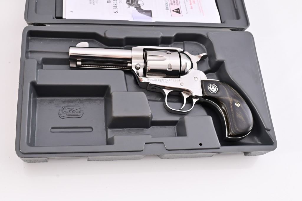 Chambered in .45 Colt, nickel plated with 3.75" barrel. Very nice condition with original factory hard case.