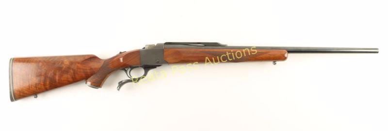American single shot falling block rifle chambered in .22-250 Remington, circa 1971. Features a blued finish, 24" tapered barrel with provisions for sights, scope base, serrated trigger, sliding tang safety, swivel studs, fancy-checkered semi-beavertail walnut forend and pistol grip shoulder stock with rubber recoil pad & metal grip cap. Rifle exhibits nearly all of it's original blued finish showing little to no wear. Action is smooth, bore is excellent, and wood stocks are very good+ with some small blemishes. Condition is near excellent. ***Modern Firearm***