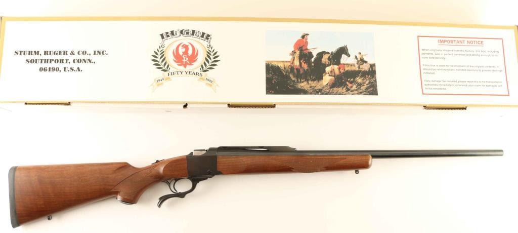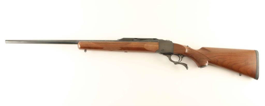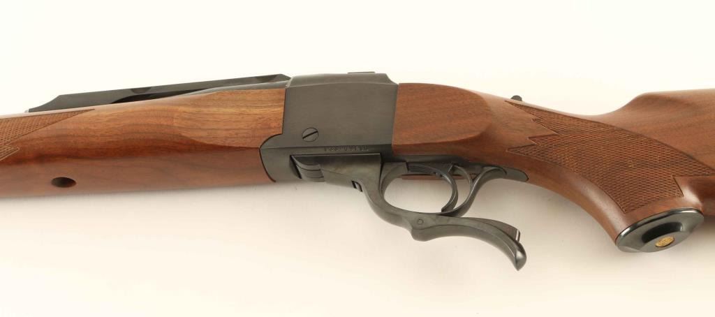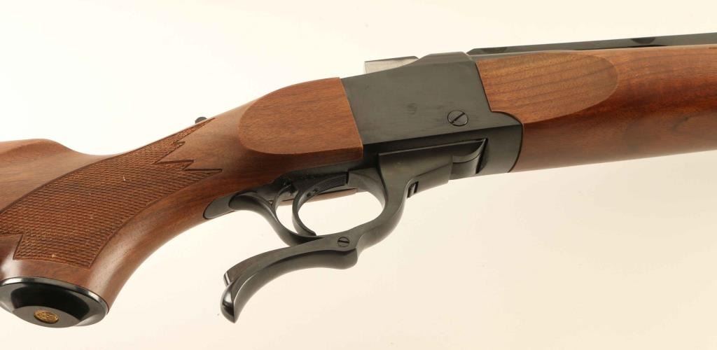 American made single-shot falling block sporting rifle manufactured circa 2000. Features a blued finish, 26" barrel without provisions for sights, factory installed scope base, serrated trigger, sliding tang safety, swivel studs, checkered American Walnut semi-beavertail forend, and pistol grip shoulder stock with metal grip cap & factory recoil pad. Includes the original factory cardboard box with documents, lock, scope rings and sling swivels. Rifle exhibits nearly all of it's original finish showing dried grease with no observed wear. Action is smooth, the bore is excellent and the wood stocks are extra fine. Condition is like NRA Perfect in box. ***Modern Firearm***