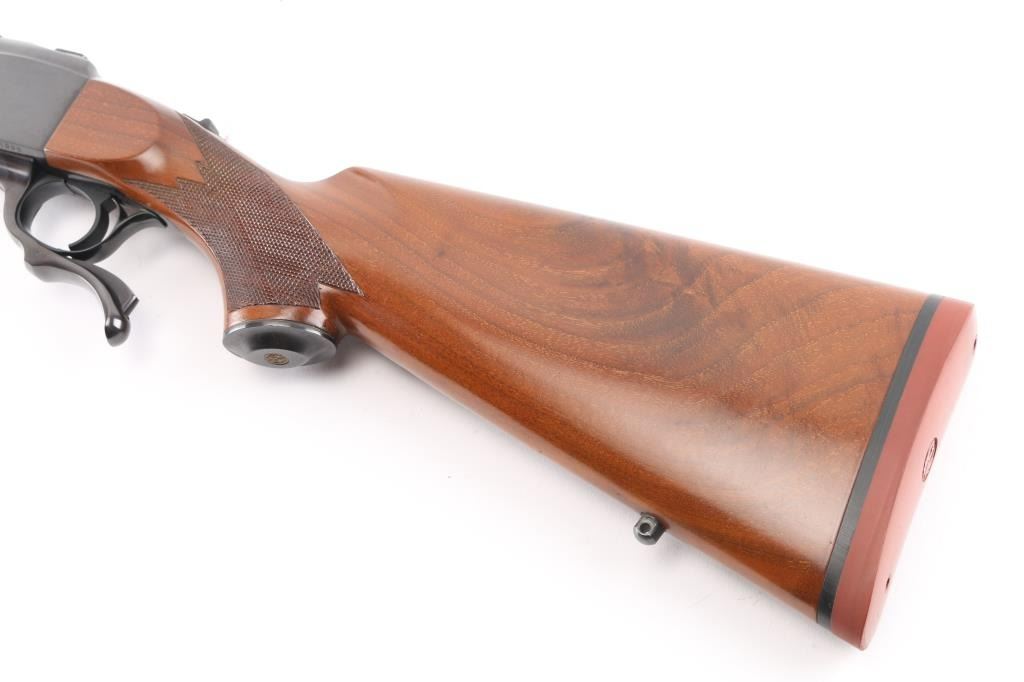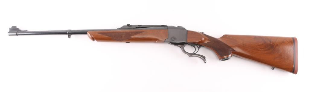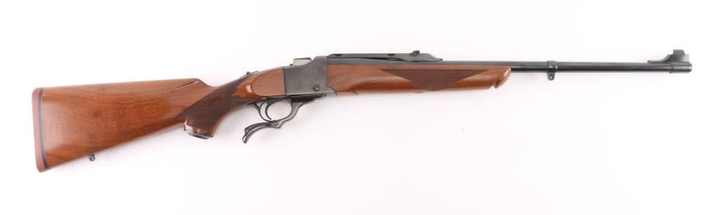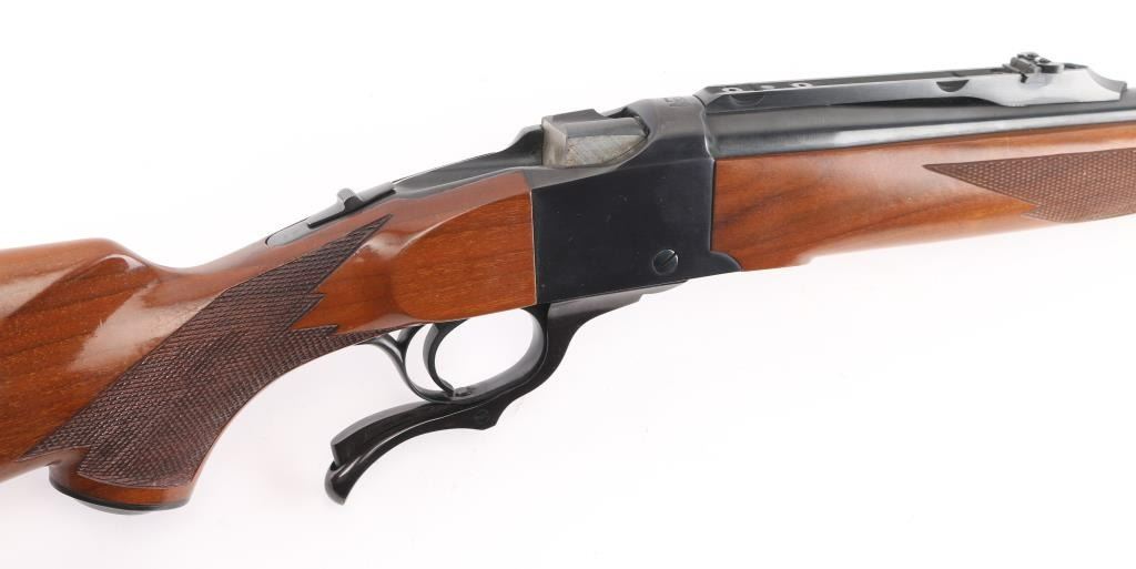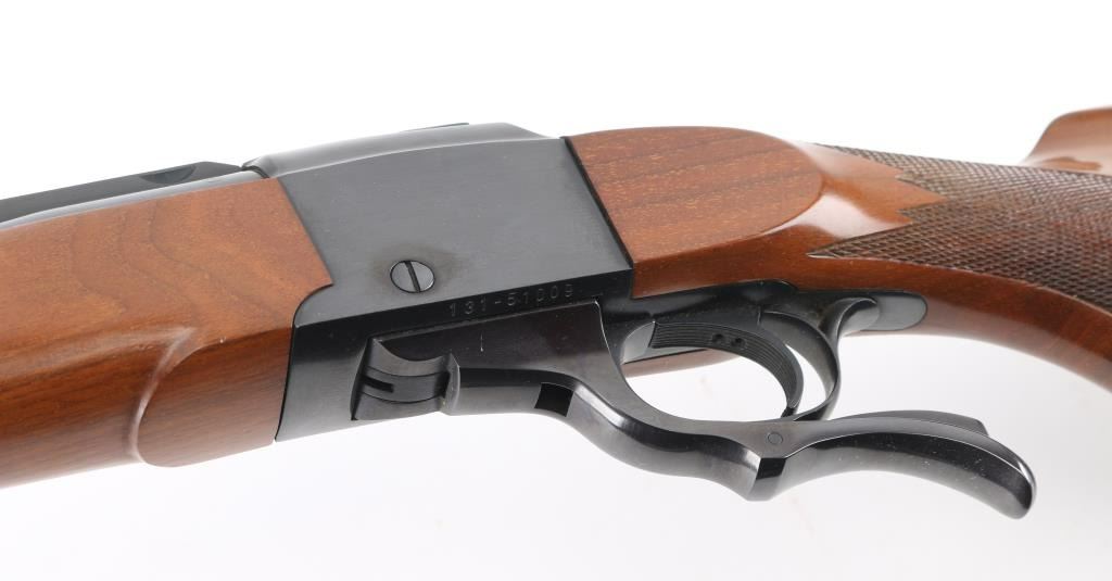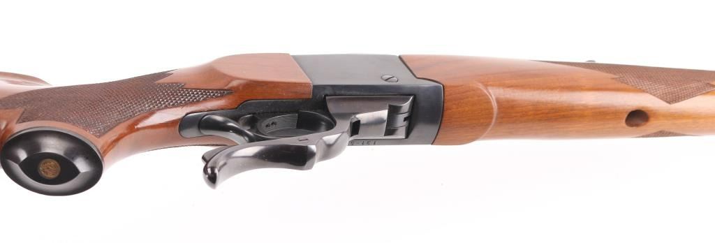 Single shot falling block rifle manufactured circa 1979. Features blued finish, walnut butt stock & forend, 22" barrel with quarter rib for scope mounting, banded ramp front sight, banded front sling stud, folding rear sight mounted in quarter rib, checkering on sides of forend & wrist, sliding tang safety, rear sling stud, red rubber butt pad. Bore is very good condition. Retains 95% finish with handling marks, edge losses. Wood is very good condition with some small dents & scratches. Condition is NRA Very Good++ *** Modern Firearm ***