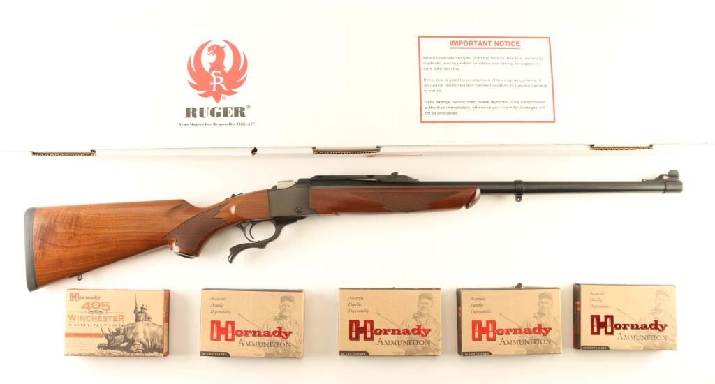 ‘1-H Tropical Rifle’ High quality big bore single-shot falling block sporting rifle chambered in .405 Winchester, manufactured in Southport, CT circa 2005. Features a blued finish, 24" heavy barrel with full banded sling stud, ramped blade front sight with white bead, quarter rib with adjustable folding leaf rear sight & integral scope base cuts, serrated trigger, sliding tang safety, stainless steel breech block, point checkered American Walnut Alexander Henry forend and semi-pistol grip shoulder stock with metal grip cap, installed swivel stud, factory recoil pad & 13 5/8” LOP. Includes the original factory cardboard box with manual. Also includes 73 rounds of Hornady ammunition (mostly 300 grain SP) and 44 spent cases. Rifle retains approximately 99%+ of its original blued finish showing little to no wear. Action is smooth, the bore is pristine and wood stocks are near fine with a few minor imperfections. Condition is NRA Excellent. ***Modern Firearm***