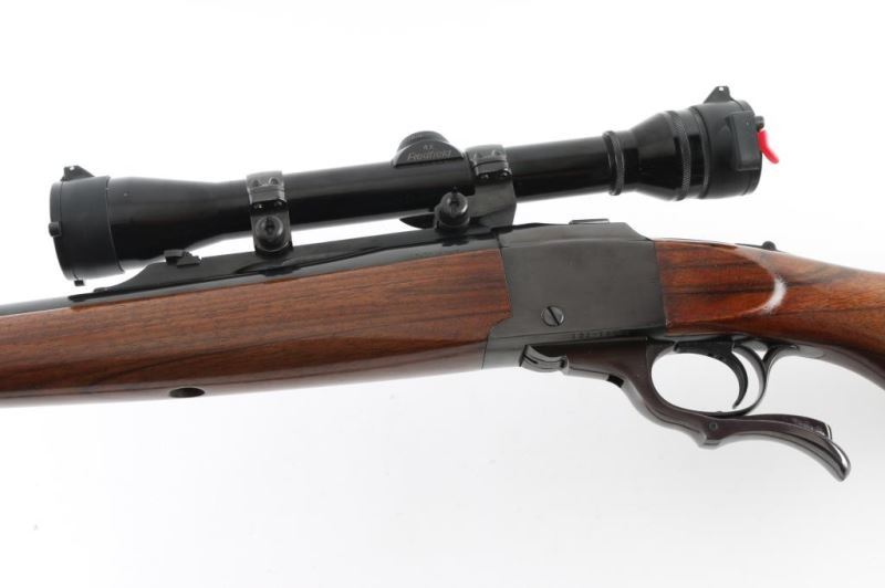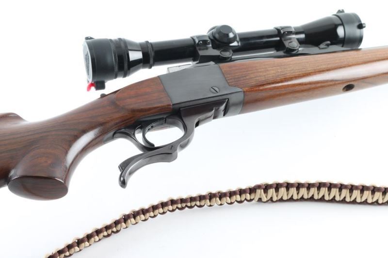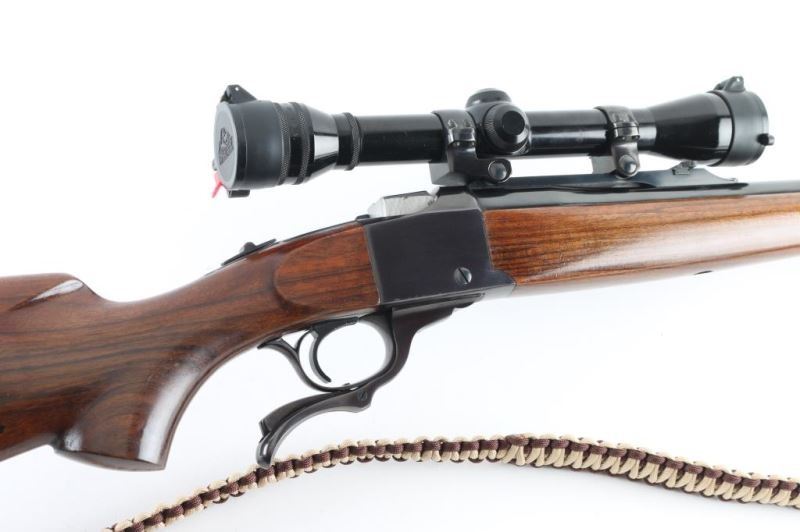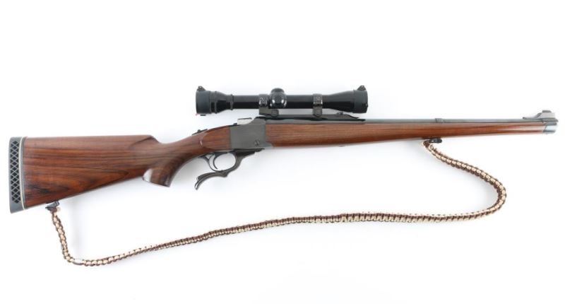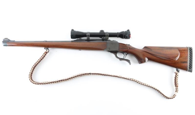 Rifle. Single-Shot. Falling-Block action. Introduced in 1966, based on John Farquharson's falling-block design that was patented in Scotland in 1872. 22" tapered barrel with post/bead front and flip notch rear sights. Blued metal finish. Full Mannlicher walnut stock with cheek piece. Black Pachmayr recoil pad. Tang safety. Bore is excellent/bright. Block action is smooth/tight. Wood is excellent. Blued finish is about 99% with a few very minor scratches. Mounted with a Redfield 4X scope with clear optics. Attached is a two-tone brown nylon para-cord sling. Comes with manual. Rifle is in almost new condition. NRA Condition-Near Perfect. Modern Firearm.
