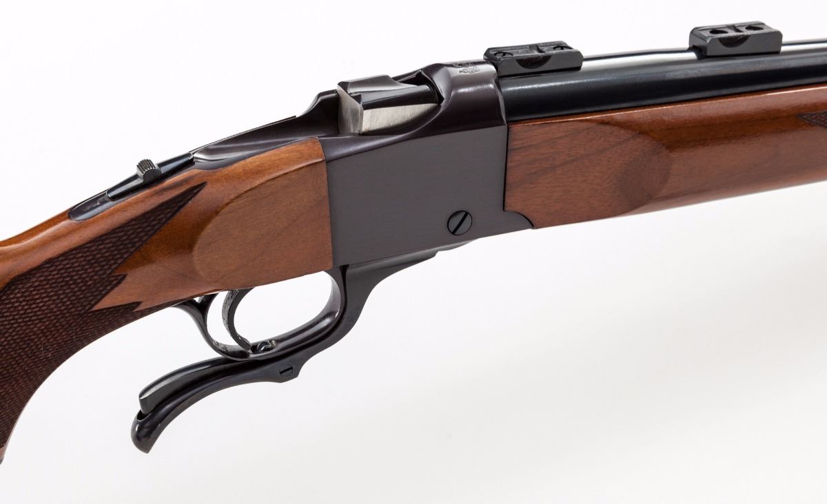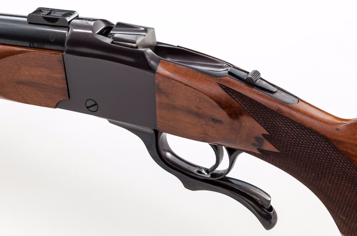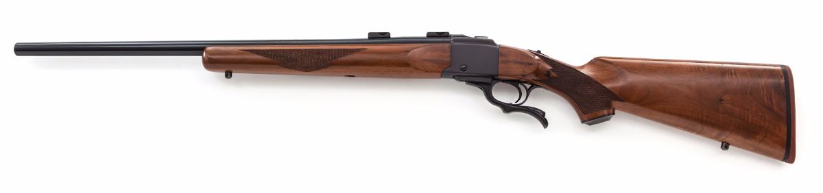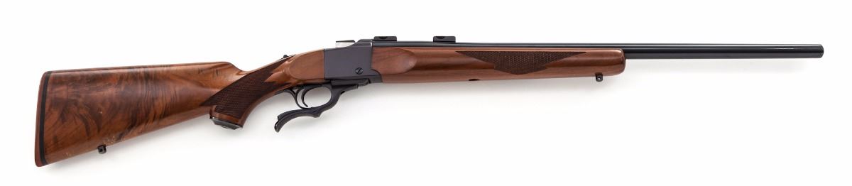 Ruger No. 1 Single Shot Rifle, #131-02030, .22-250 cal., 24'' blue barrel, plum blue receiver, checkered pistol-grip walnut stock and forend, Ruger grip cap, factory red rubber Ruger recoil pad, with scope blocks. Mfg'd 1977. Condition to metal surfaces is excellent retaining approx. 98% blue, with a few light marks from handling, as well as some wear to edge of lever. Stock is very good with general small impressions and a few larger impressions and loss to finish at bottom edge of buttstock near rear sling swivel stud. Checkering remains crisp. Action is excellent, bore is bright. Est.: $600-$800. (Modern)