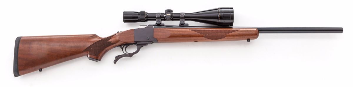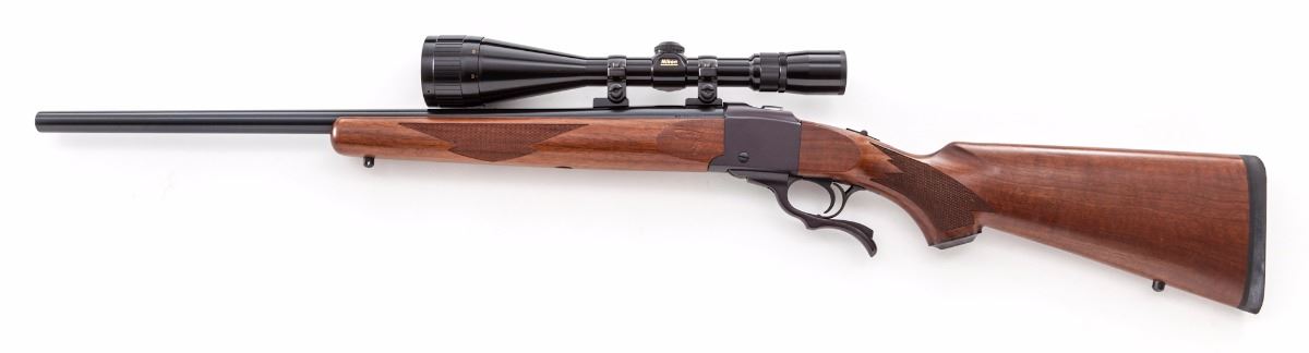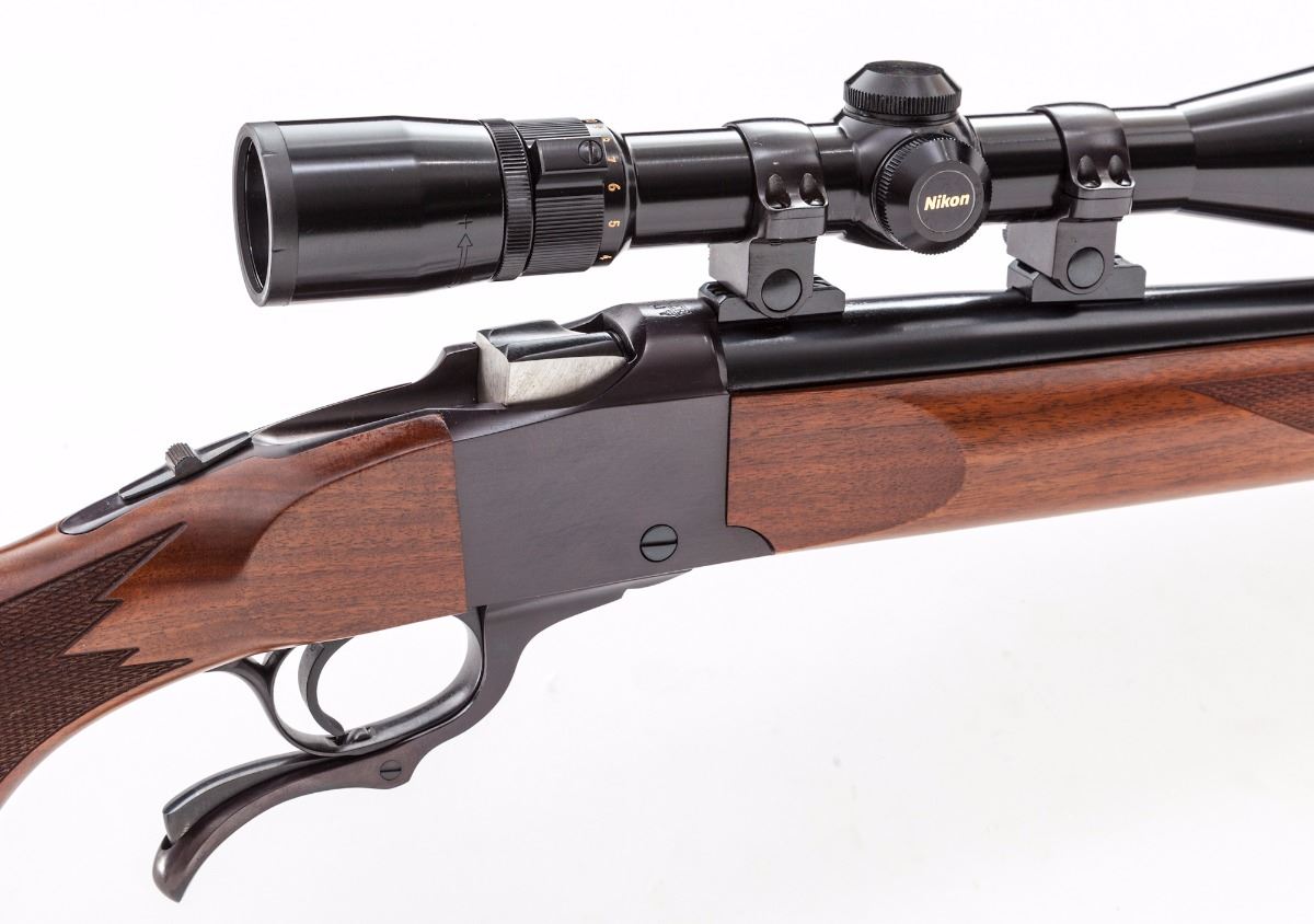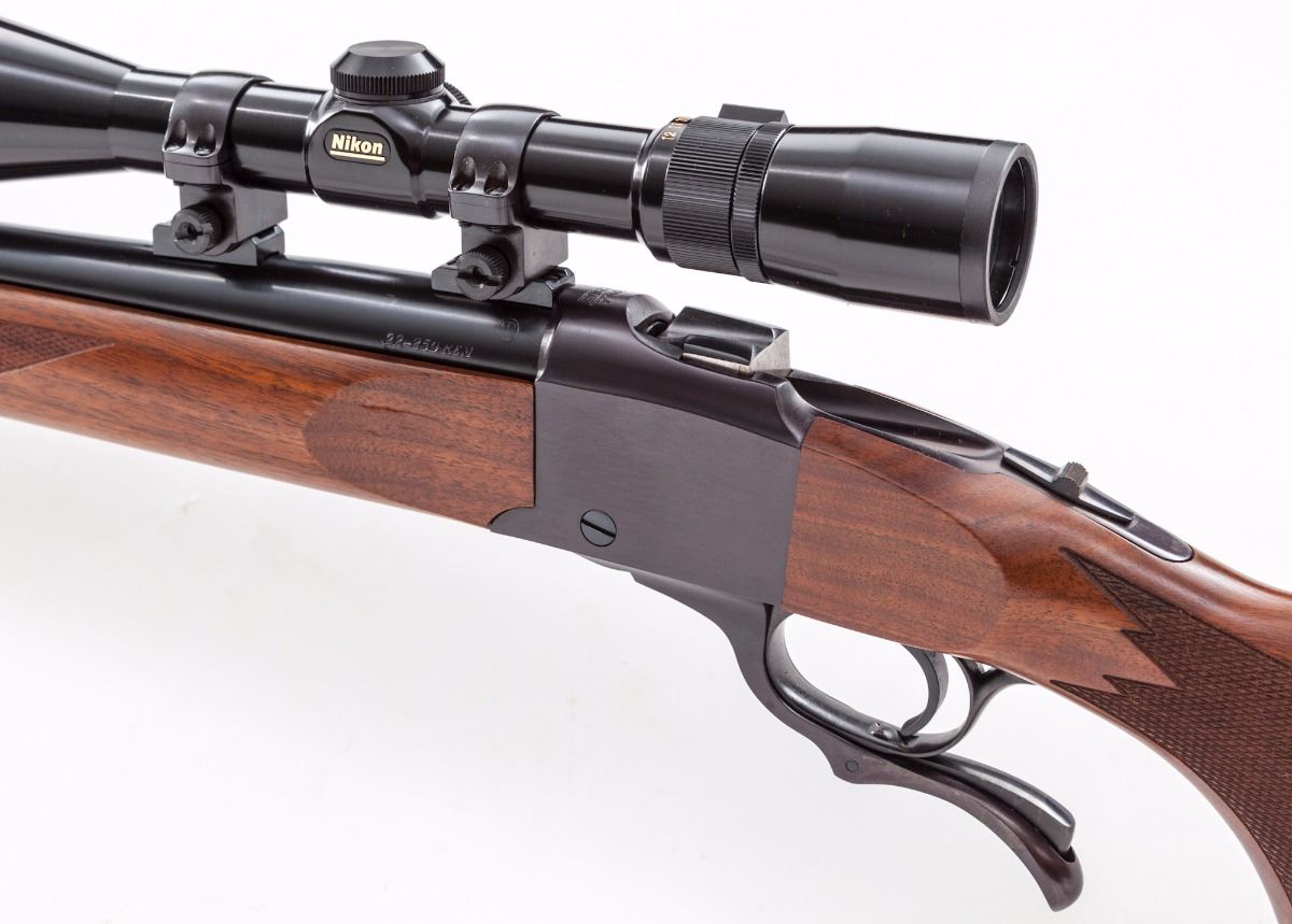Ruger No. 1 Single Shot Rifle, #133-23917, .22-250 cal., 24'' dark blue barrel, plum/blue receiver, checkered pistol-grip walnut stock, pommel cap with inlaid gold Ruger medallion, factory rubber Ruger recoil pad, with sling swivel studs. Topped with a Nikon 4-12x50 scope. Condition is excellent retaining approx. 98%-99% blue with a few scattered light marks from handling. Forend with an area of moderate impressions to left side near receiver; checkering remains crisp. Action is tight, bore is excellent, scope optics are bright and clear. Est.: $600-$800. (Modern)
