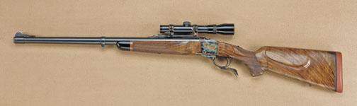 Ruger No. 1 custom big game express rifle in .450 3-1/2” caliber. 24” factory heavyweight barrel, blue and case hardened finish, select checkered custom select burl walnut stock showing case hardened rib and quick detachable mounts with Helia 2S2 scope by Kahles of Austria. The quality of the restocking and refinishing is excellent, accomplished by a master gunsmith. The stock measures 13-7/8” to the end of the wood, 15” to the end of the hard-rubber pad. The rifle shows mounts for quick detachable sling swivels. The condition is fine to excellent as upgraded at time of refinish and the case hardening and blue is first-class, as good a quality as 19th century arms. The interior is excellent showing just slight use. We would estimate replacement cost at over $7,500 with this expensive scope and mounts which are estimated at $2,500 alone. Est: $3,000 - $6,000