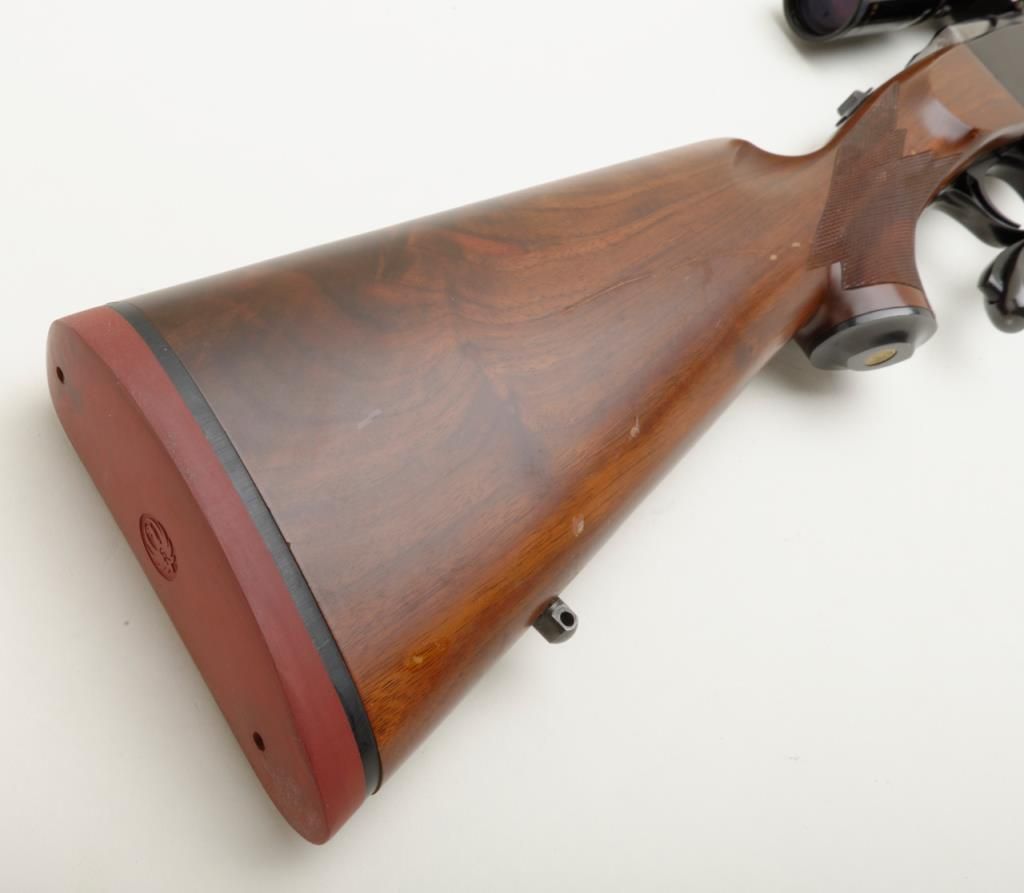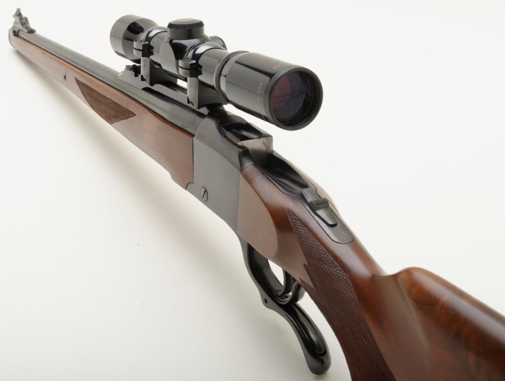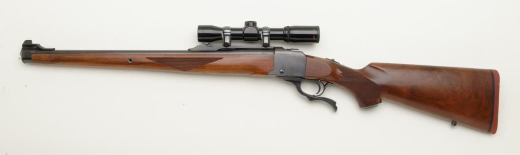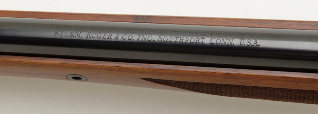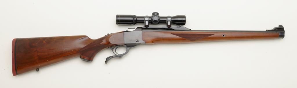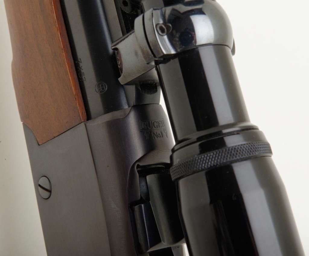 Ruger No. 1 falling block carbine with Mannlicher stock, 7x57mm cal., 20” barrel, blue finish, checkered stocks, #132-68389 in overall very good to fine condition showing the majority of its original finish, fine bore, crisp action and markings, very good wood with some scattered mars and streaks of varnish on the right side of the butt stock that can be remedied with some careful cleaning. (Modern/PPT). Est.: $350-$700.