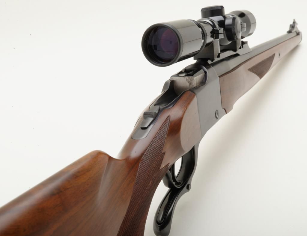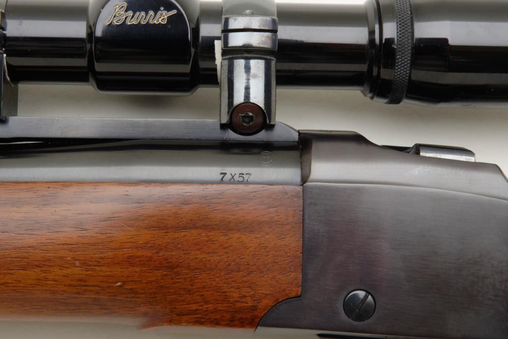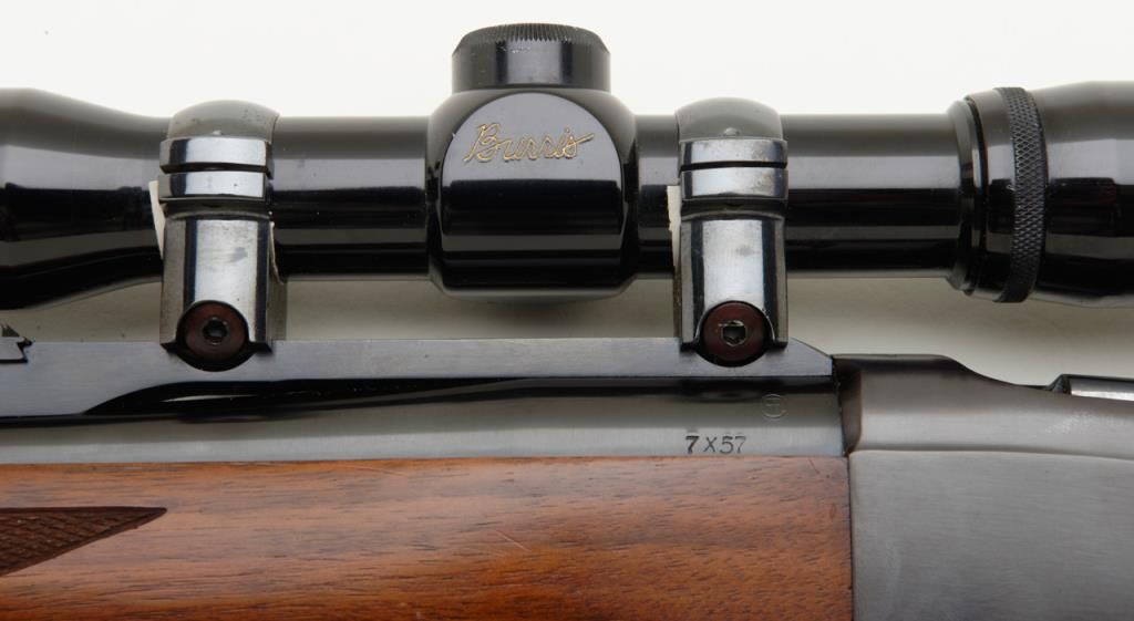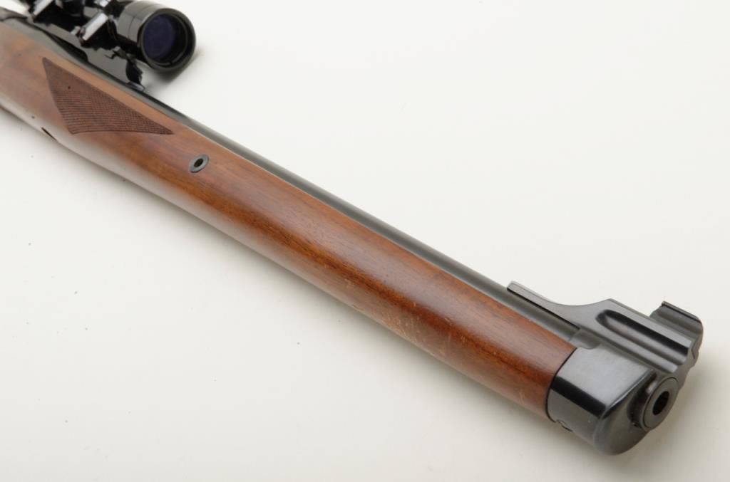 Ruger No. 1 falling block carbine with Mannlicher stock, 7x57mm cal., 20” barrel, blue finish, checkered stocks, #132-68389 in overall very good to fine condition showing the majority of its original finish, fine bore, crisp action and markings, very good wood with some scattered mars and streaks of varnish on the right side of the butt stock that can be remedied with some careful cleaning. (Modern/PPT). Est.: $350-$700.