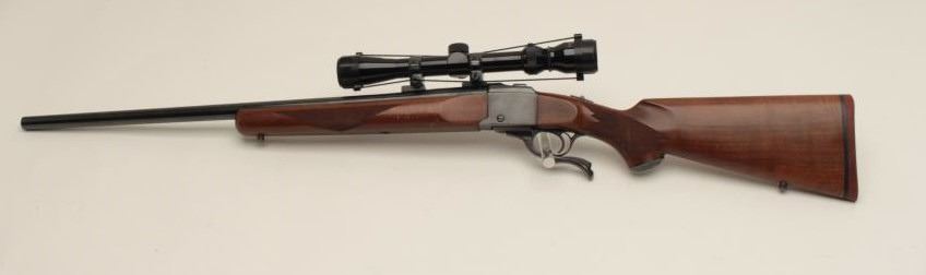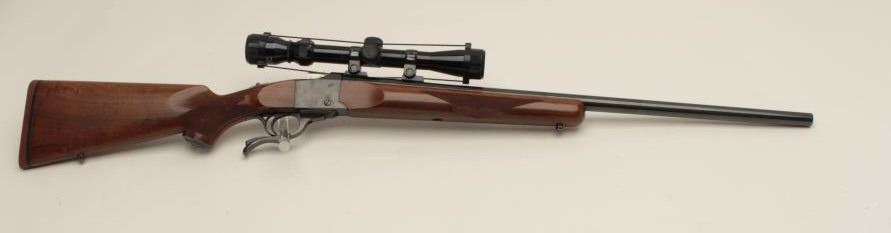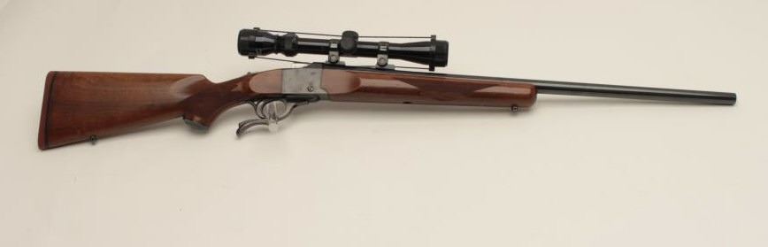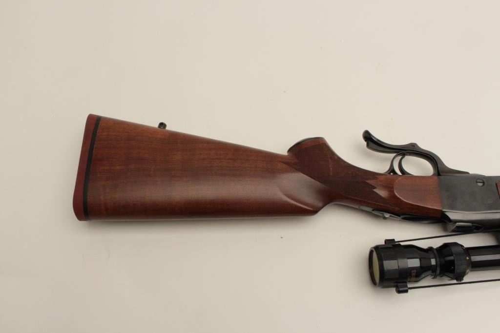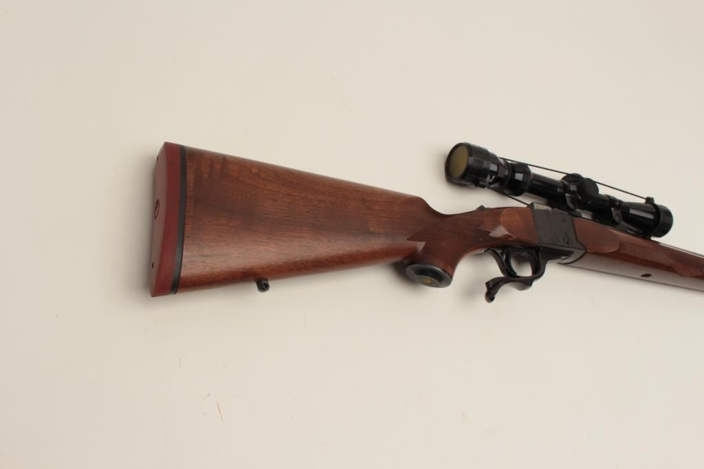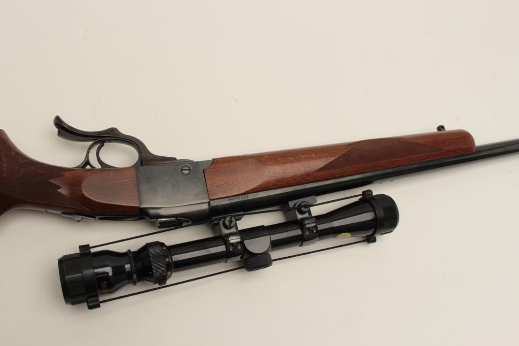 Ruger No. 1 single shot rifle, .220 Swift caliber, 26” round barrel, blued finish, checkered wood stocks, S/N 132-12579, mounted with a Tasco 3-9x32 scope with fine optics, in overall very good to fine condition with a fine bore, crisp action, sharp markings and very good to near fine wood stock. (Modern/No PPT). Est.: $500-$1,000.