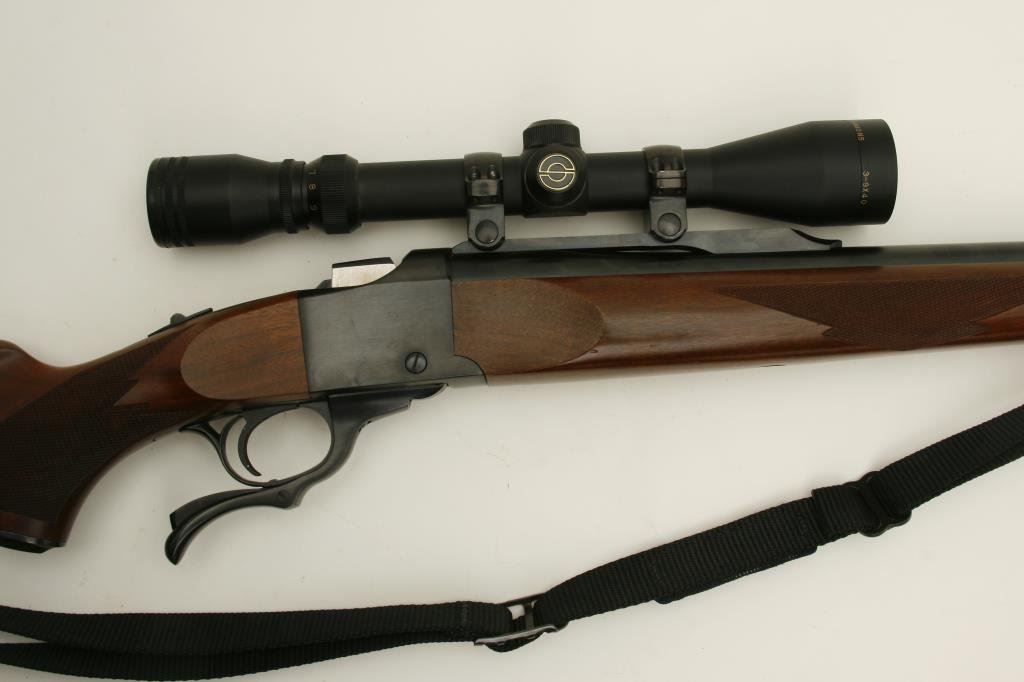 serial #132-91920. The rifle is in very good to nearly fine overall condition with a 26” barrel. The barrel and receiver retain nearly all of their blued finish with only handling marks noted. The smooth wood stocks are in very good condition with small mars and compressions consistent with field use. The butt stock ends with a Red, Ruger marked rubber recoil pad and a 13 ¾” LOP. The rifle is topped with Ruger proprietary rings and a Bushnell Trophy 3x9 variable power scope. The bore is very good, the action crisp and markings are sharp on this desirable Ruger No. 1. The lot includes an Uncle Mike’s leather rifle sling. (Modern) Est.: $500-$1,000.
