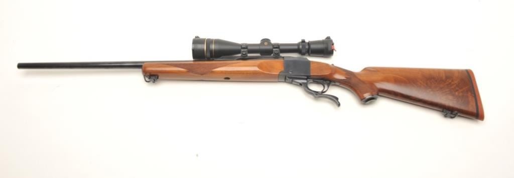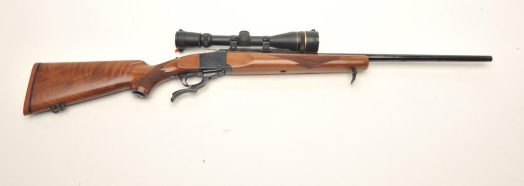 Ruger No. 1 single shot rifle, .243 Win. caliber, 26” round barrel, blued finish, checkered wood stocks with Ruger red hard rubber butt pad, S/N 130-20057, mounted with a Leupold Vari-X III 4.5 x 14 scopedisplaying fine optics, in overall excellent condition showing little if any use. (Modern). Est.: $600-$1,200.