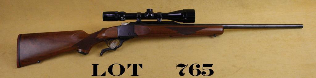 Ruger No. 1 single shot rifle, falling block, .300 Win. Mag. cal., 26” round barrel, blue finish, checkered wood stocks, #131-11073. This gun is in overall excellent condition showing approx. 99% original blue finish,bore is overall very good, crisp action, sharp markings, excellent wood stocks with a couple of mars from storage, nicely flamed graining in the butt stock, red rubber butt pad; mounted with a Bushnell 4x-12X Bannerscope with good optics. Est.: $300-$500.