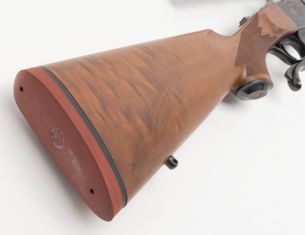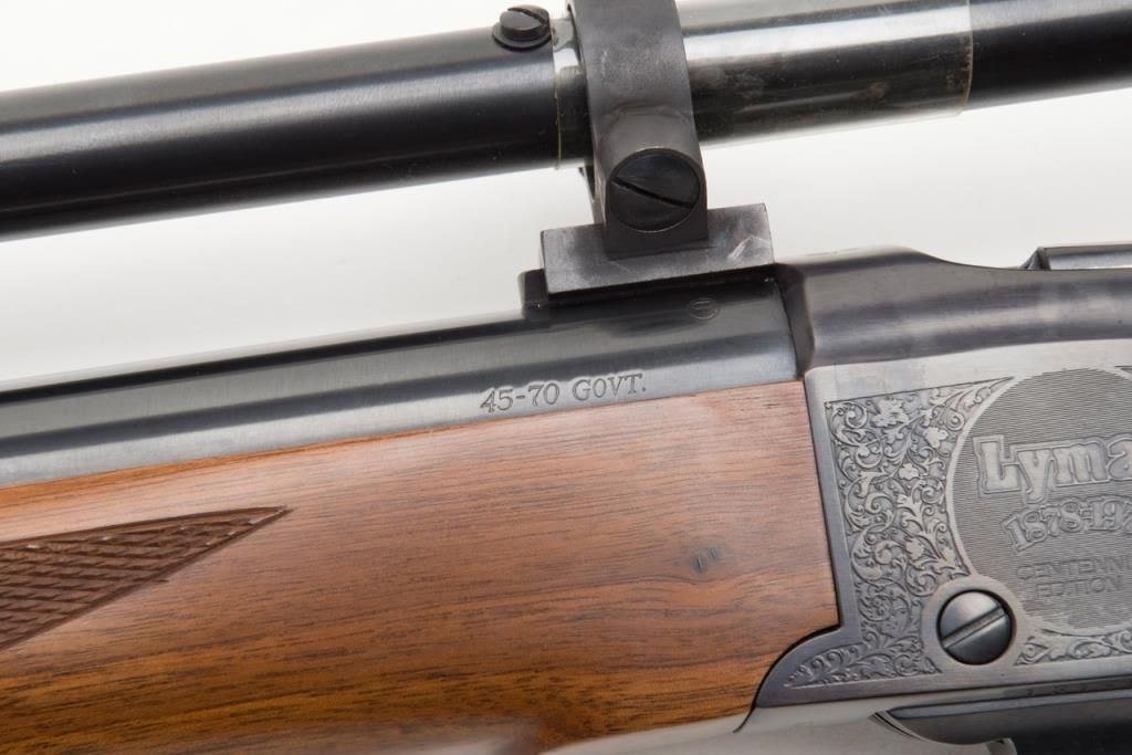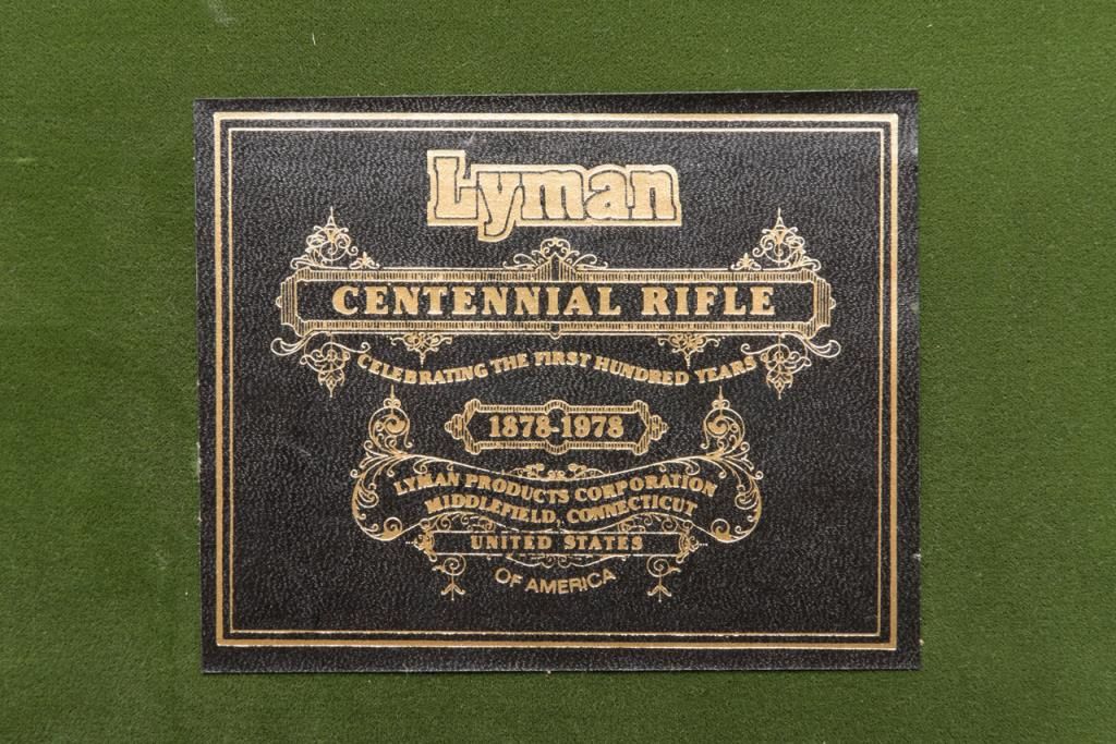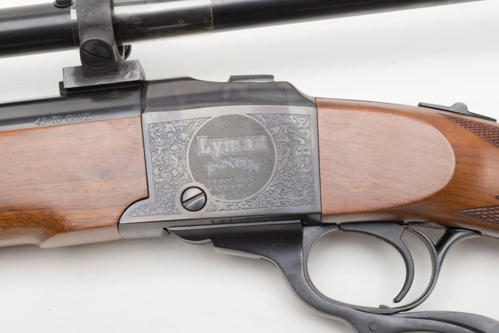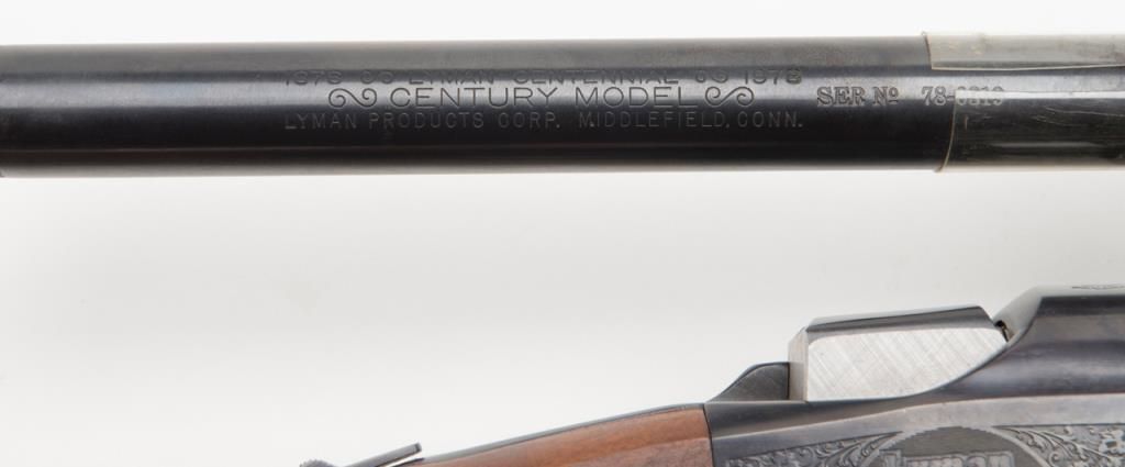 Ruger No. 1 single shot target rifle/Lyman Centennial (1878-1978), .45-70 Gov’t cal., 28” heavy round barrel, blue finish, ornamented receiver, checkered wood stocks, #131-50235 (L-78-0319) in overall fine condition showinglittle use or handling; accompanied by beautiful wood presentation case with Lyman Centennial Journal, box of 20 unprimed nickel plated cases, a bullet mold, die set, brass Commemorative disc and Lyman Century Model tube scope, #78-0319.(Modern). Est.: $1,000-$2,000.