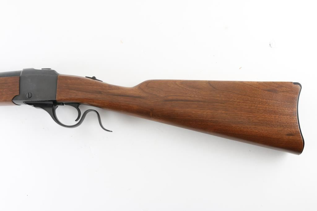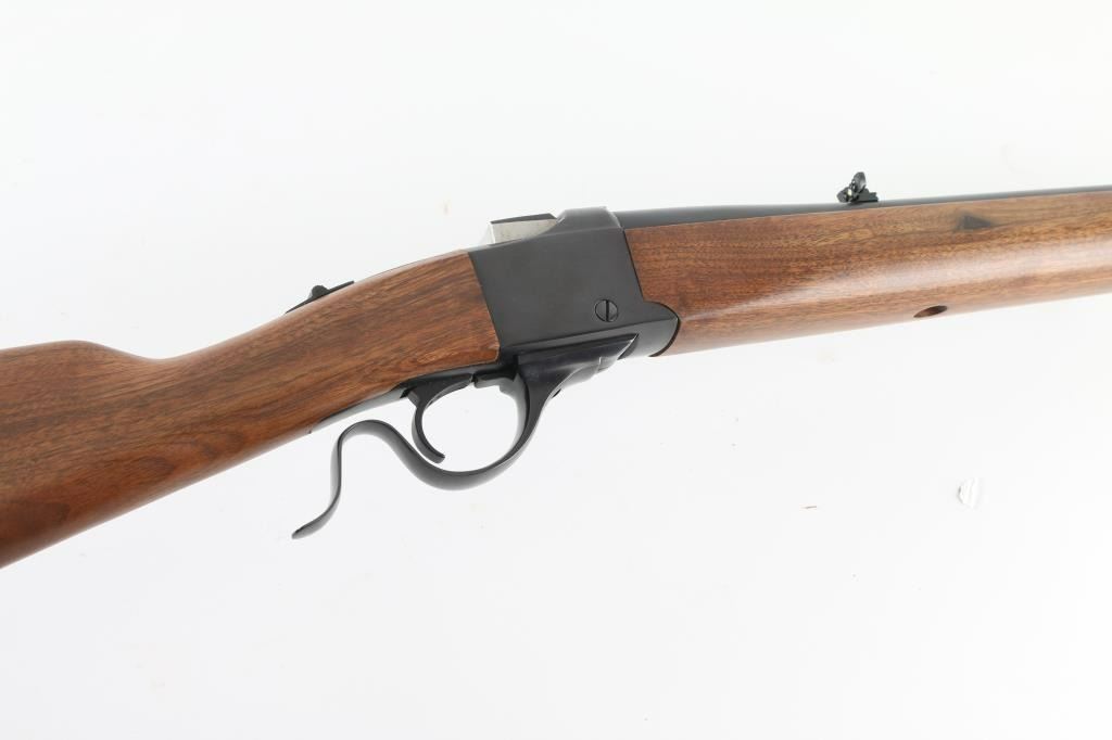Rifle. Single-Shot. Falling block Action. based on the No 1 Rifle. Simpler one-piece breech lever. Produced 1973-1986. 22" contour barrel. Front post/bead, and adjustable folding notch rear sights. Tang safety. serrated adjustable trigger. Straight walnut stock and forearm. Action is smooth/tight. Bore is excellent/bright. Wood is excellent. Blued finish is excellent. Like new condition. Comes in original box with manual. NRA Condition-Excellent. Modern Firearm