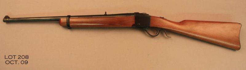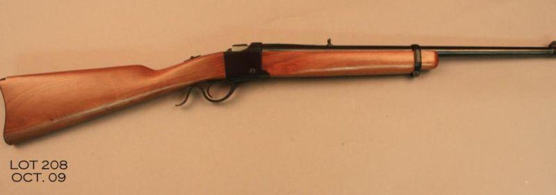 Ruger No.3 Carbine, #130-59285, .30-40 Krag cal.,  22" barrel, blued finish, smooth walnut stock.   Rifle is in excellent condition overall, bore is  excellent, finish is 95-98% original, with slight  loss on the left side of the receiver.  Includesoriginal box, which is in good condition, and  paperwork.   Manufactured in 1976, and marked  "Made in the 200th Year of American Liberty".   Est. $250-$500.