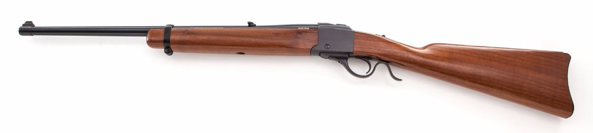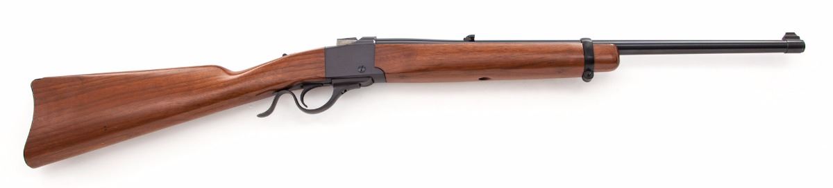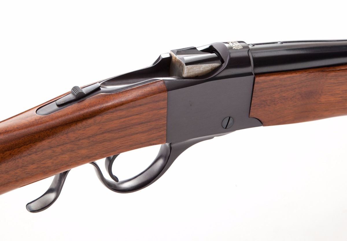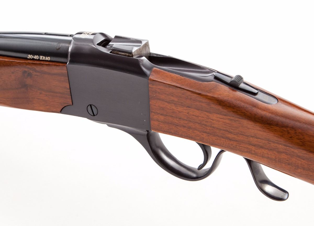 Ruger No. 3 Single Shot Rifle, #130-58170, .30-40 Krag cal., 22'' barrel, blue finish, smooth straight walnut stock and forend, brass bead front sight and folding rear sight. Mfg'd 1976. Condition is excellent retaining approx. 99% blue. Receiver with scattered fine micro-scratching, as well as a few pinhead size marks to left side of frame. Stock with minimal fine impressions, mainly to bottom edge. Action is crisp, bore is like new. Est.: $750-$1,000. (Modern)
