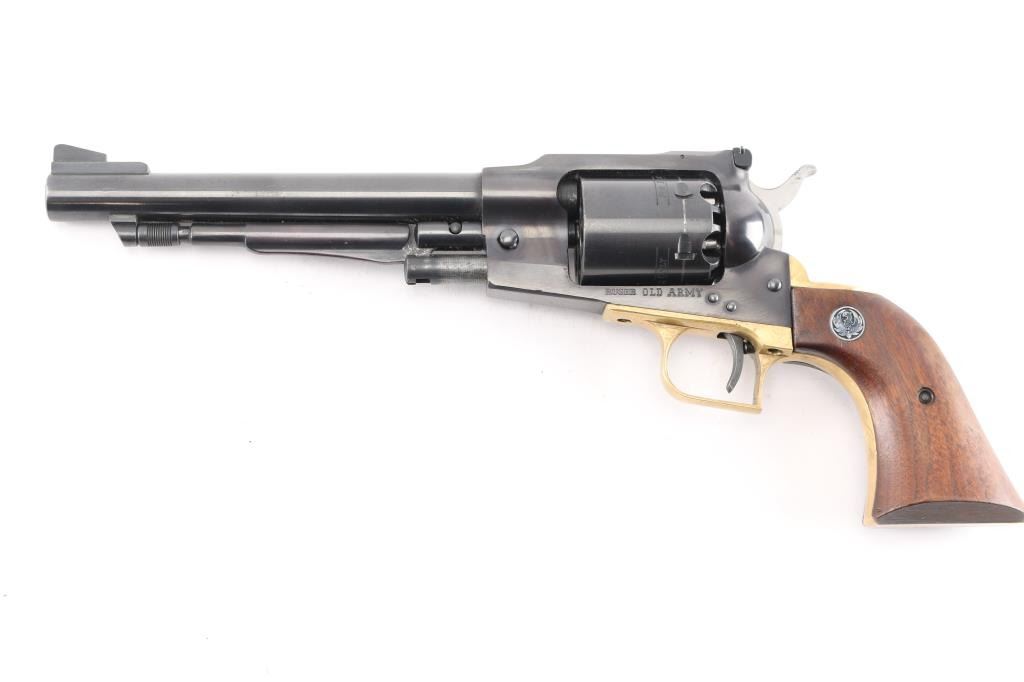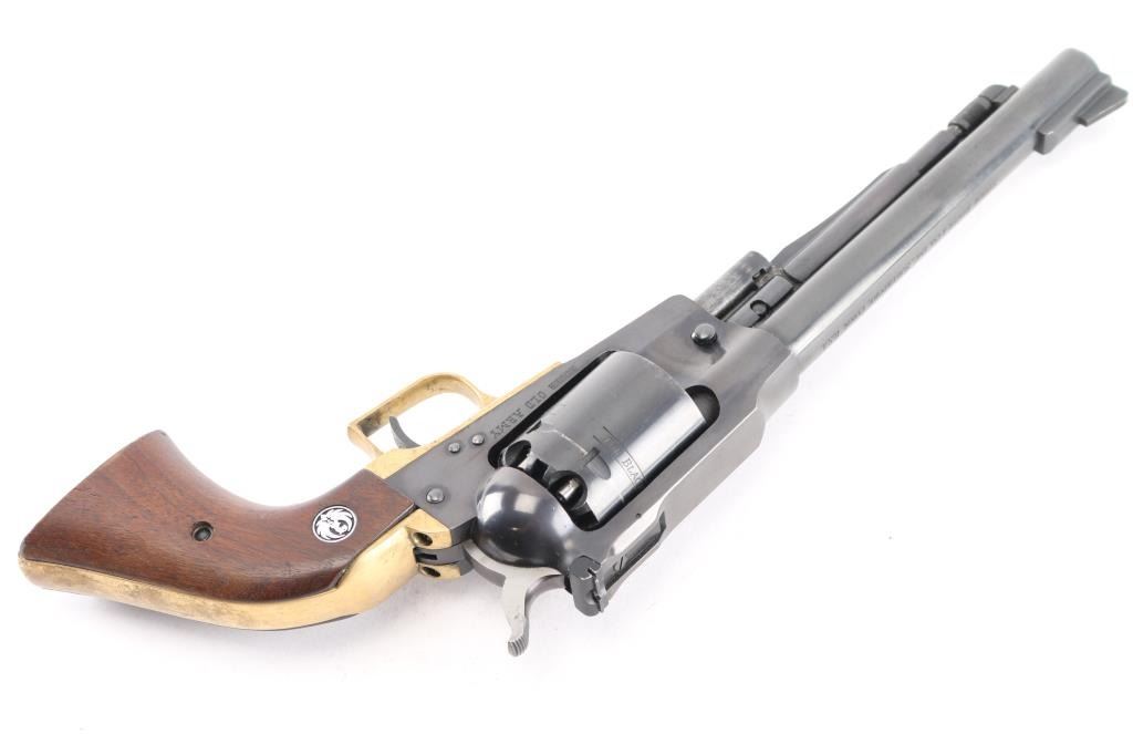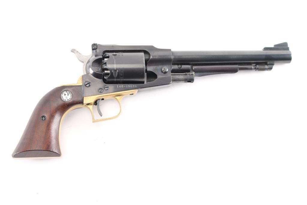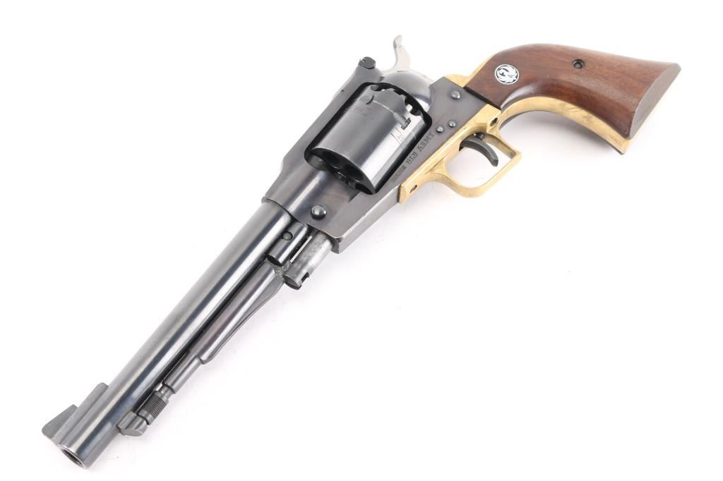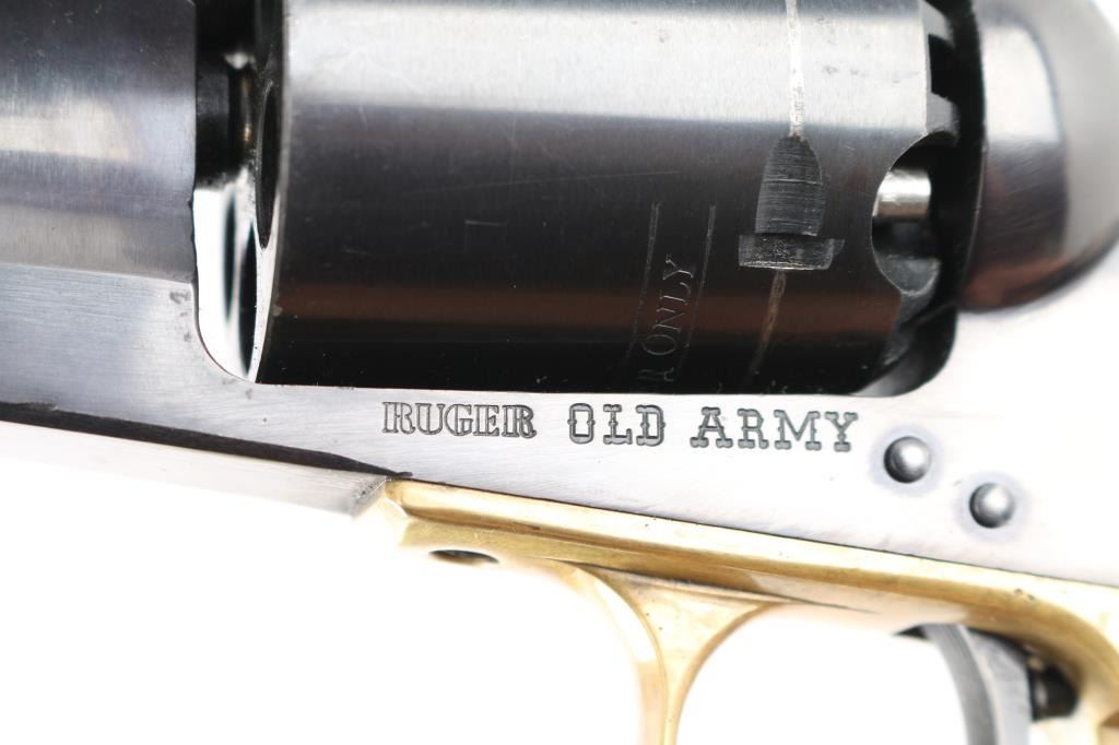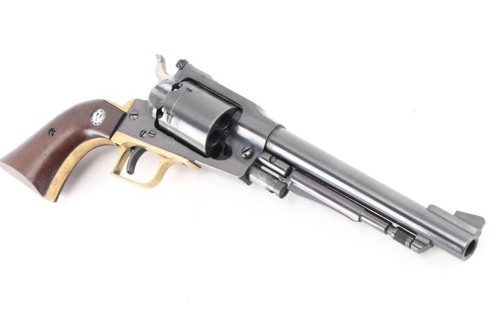 Rare authentic Ruger square back brass grip frame. If you look under the right grip, you will see the casting mark MR3-DB that authenticates it. The casting mark is located near the grip alignment pin. Brass grip frames were shipped on ROAs from 1972 to 1973. There were approx. 1100 originally made with brass grip frame. Manufactured 1973. Single action black powder percussion revolver, second year of production. Barrel has single line address, no warning disclaimer. Features blued steel steel construction, 7.5" barrel, loading lever, raised serrated ramp front sight, factory adjustable rear sight, serrated trigger, serrated hammer spur, non-fluted cylinder with safety stops, three-screw steel frame, two-piece smooth wood grips with Ruger medallions. Bore and charge holes are excellent/bright, retains about 90% with minor muzzle/edge wear, some friction wear on the plunger, minor scratches, tracking on the cylinder and some scratches in the loading gate, I assume from caps. Grips are very good. Action is smooth with tight lock-up.