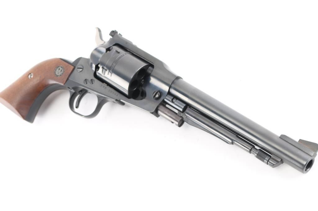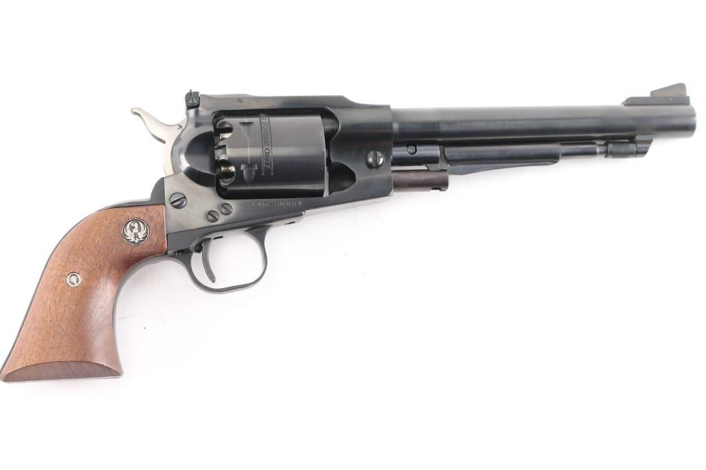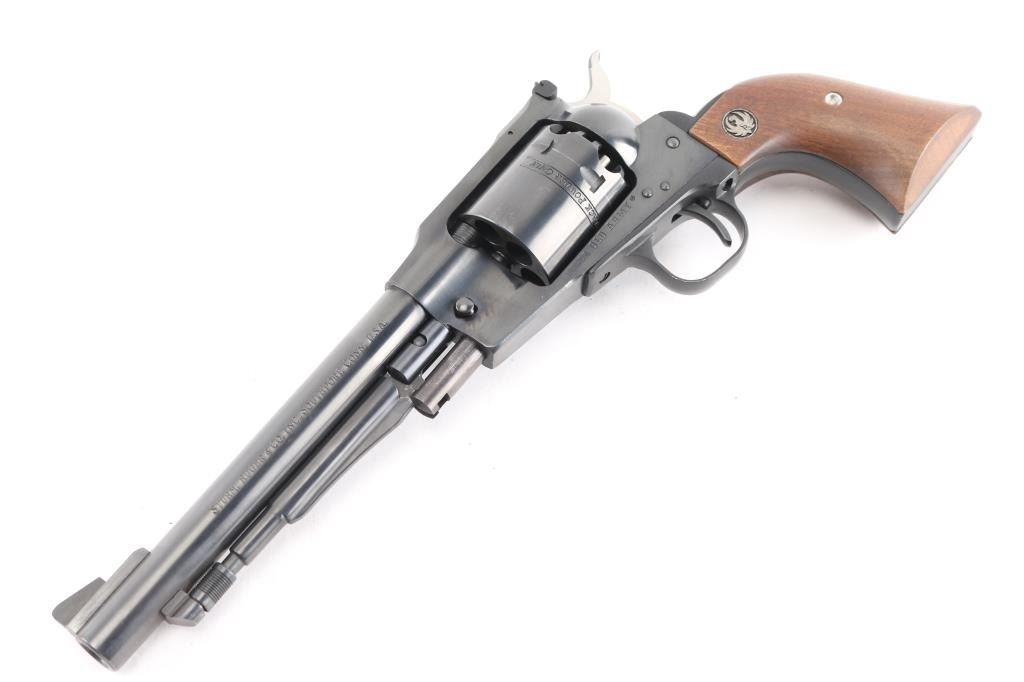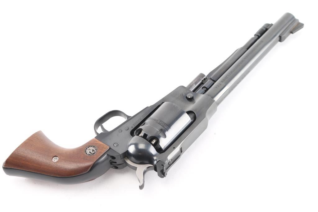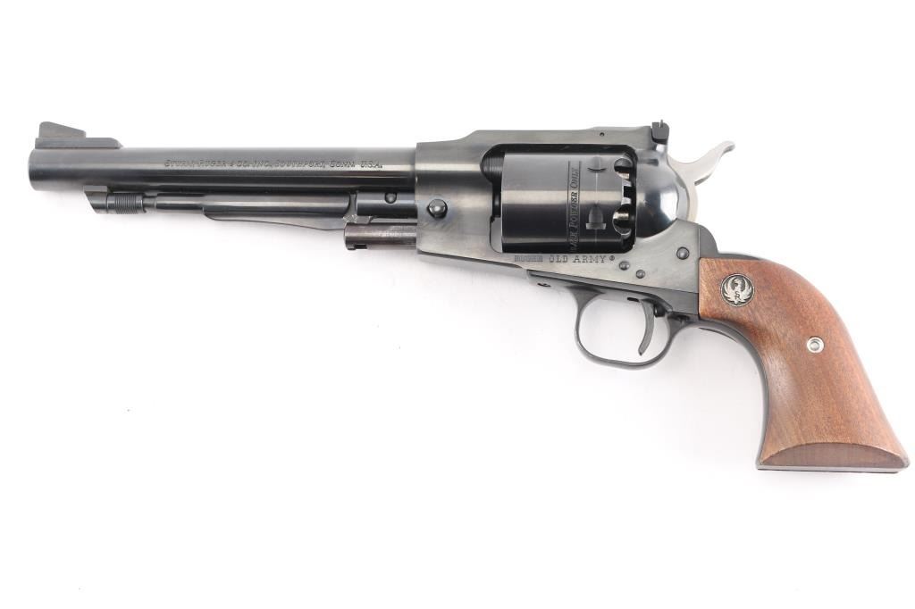 "liberty Model". Manufactured in 1976. Barrels of Ruger Old Army revolvers made in 1976 were marked "MADE IN THE 200TH YEAR OF AMERICAN LIBERTY". Single action black powder percussion revolver. Features blue finish, 7.5" barrel, loading lever, raised serrated ramp front sight, factory adjustable rear sight, smooth trigger, serrated hammer spur, non-fluted cylinder with safety stops, three-screw steel frame, two-piece smooth wood grips with Ruger medallions. Bore and charge holes are excellent/bright. External appearance is very good with minor scratches and feint tracking on the cylinder. Action is smooth with tight lock-up. Grips are very good, a couple of minor scratches,