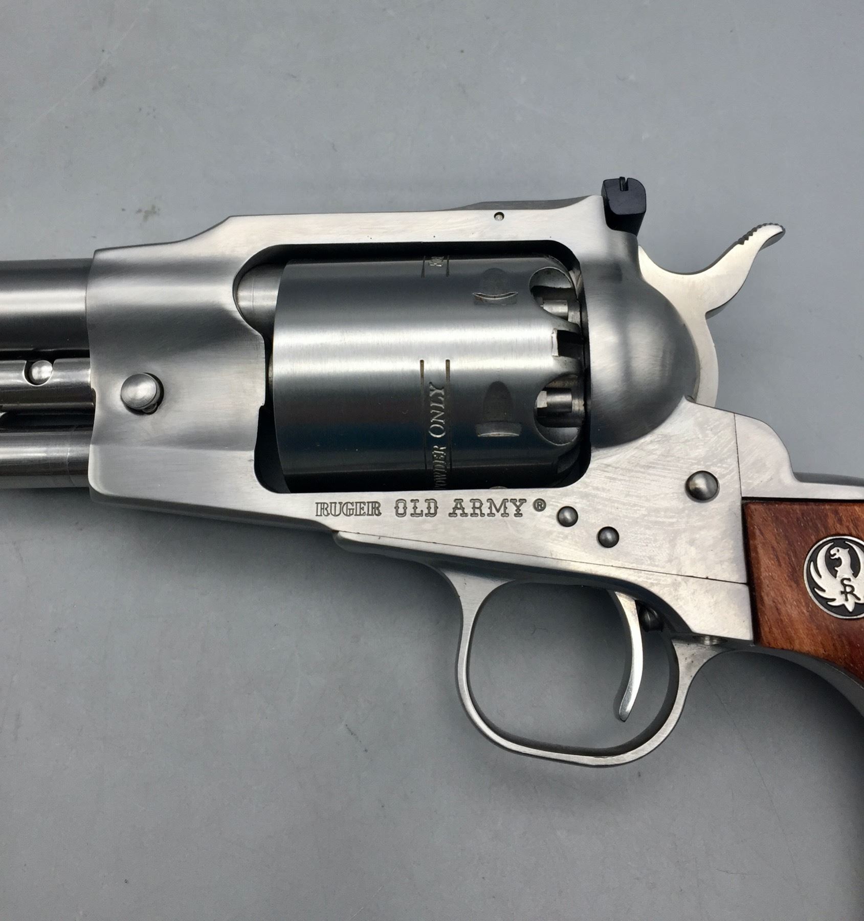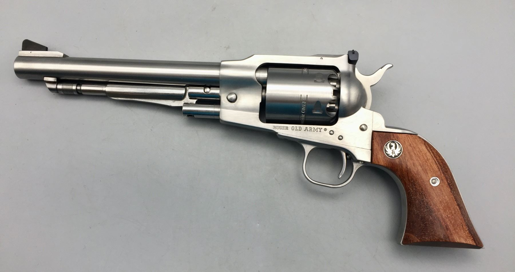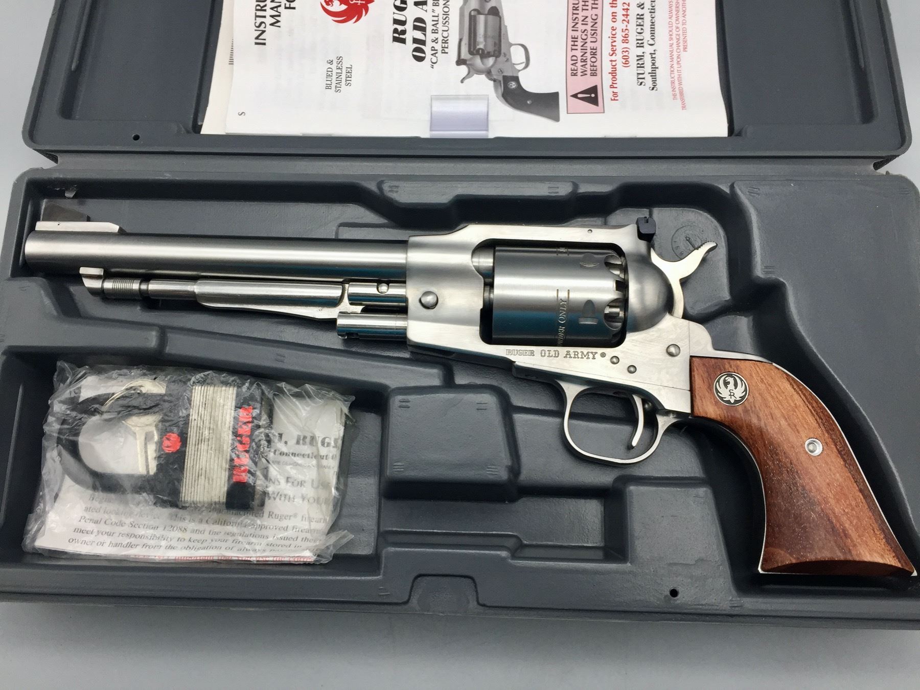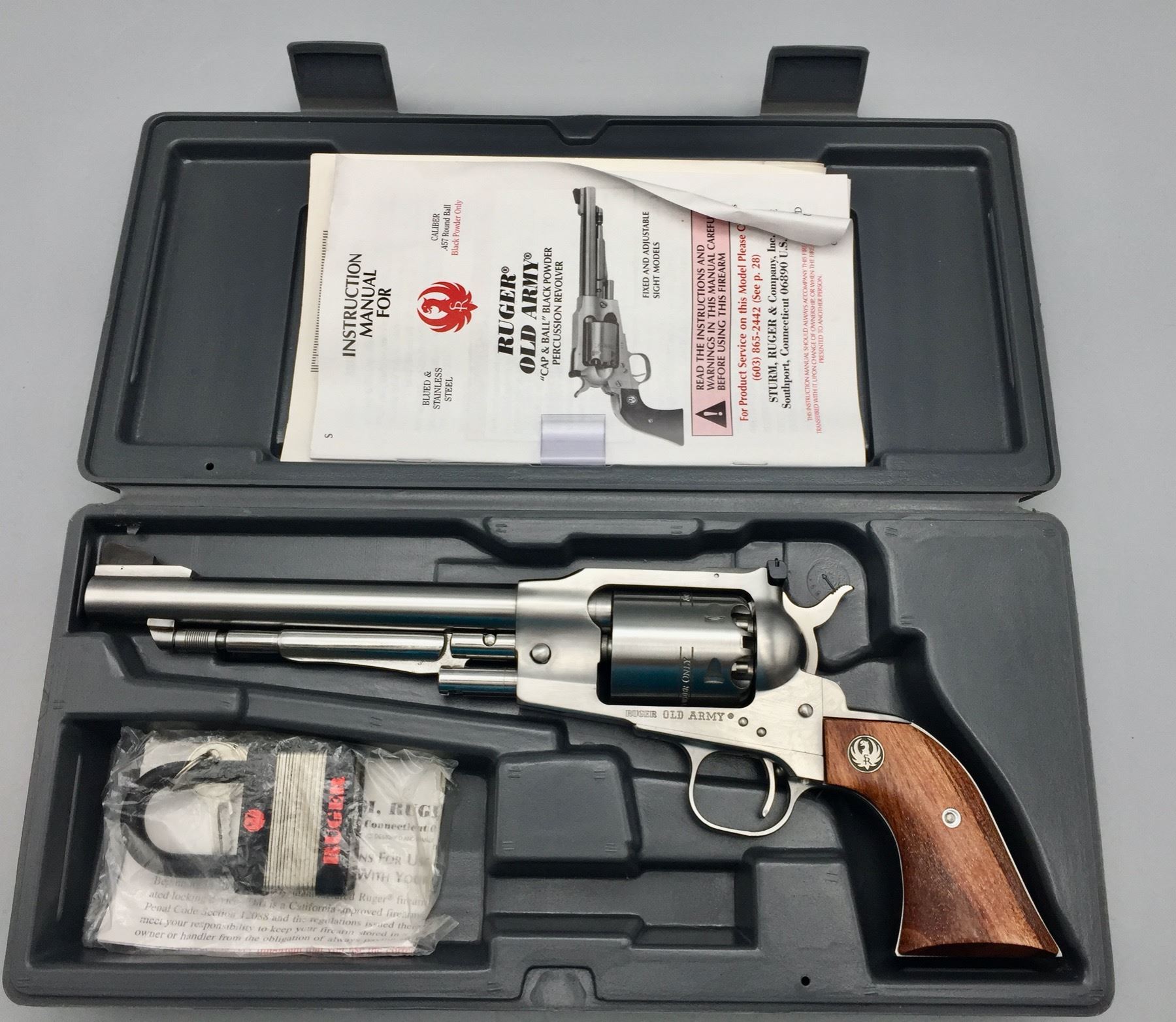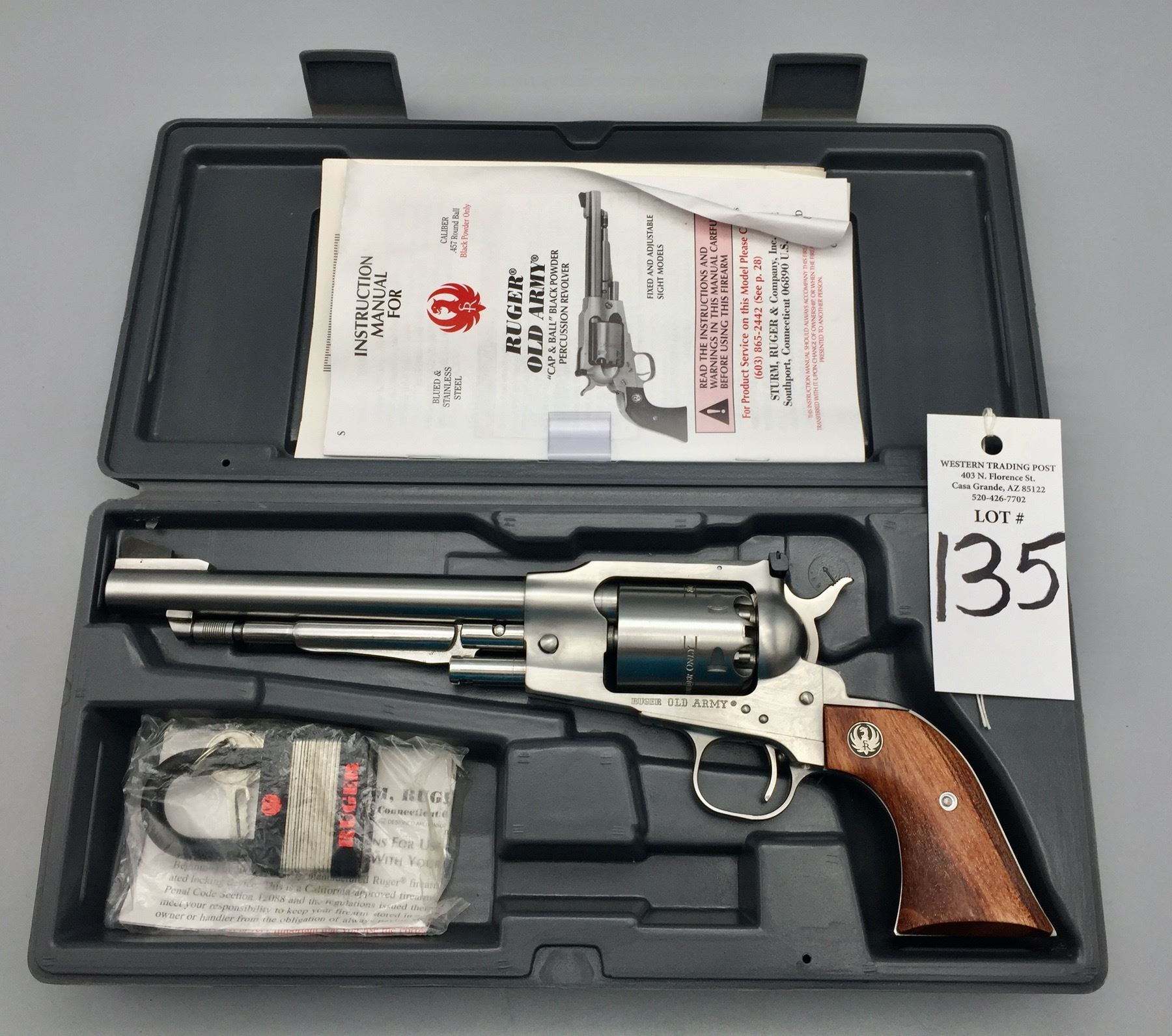 Description: Presented for sale in this lot is a Ruger, Old Army .44 caliber black powder revolver with its original case. Like new! Take a look! Maker: Ruger. Approx. Age: Modern. Serial No. 145-95479. Size: Barrel measures 7-1/2†with an overall length of 14â€. Condition: Good. Please look closely at the pictures - they are an important part of our description. Shipping: There will be a $15 handling / packaging fee for shipping this lot. The actual cost of postage will be added on top of that. *BLACK POWDER Replica firearm DOES NOT REQUIRE an FFL Transfer*