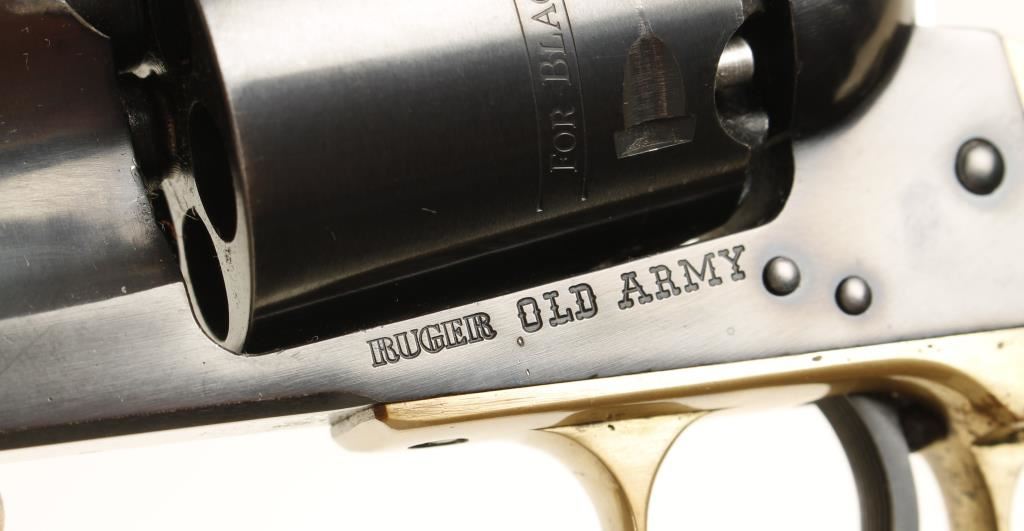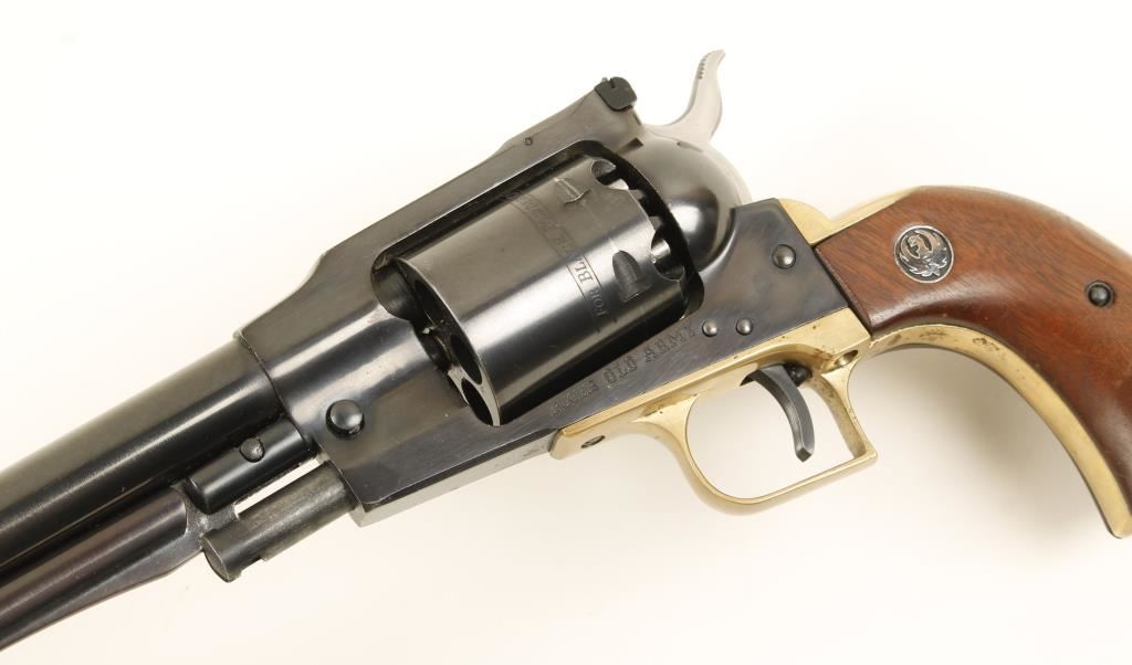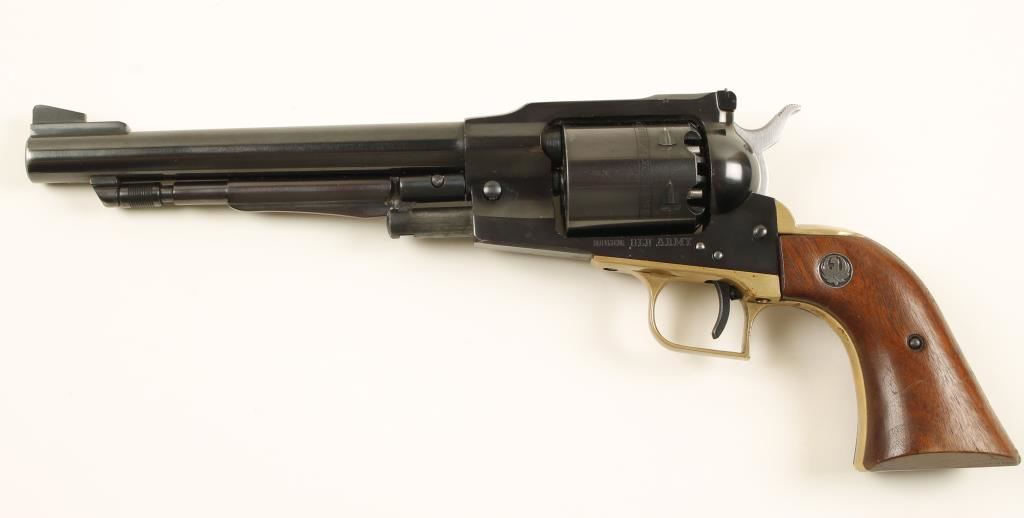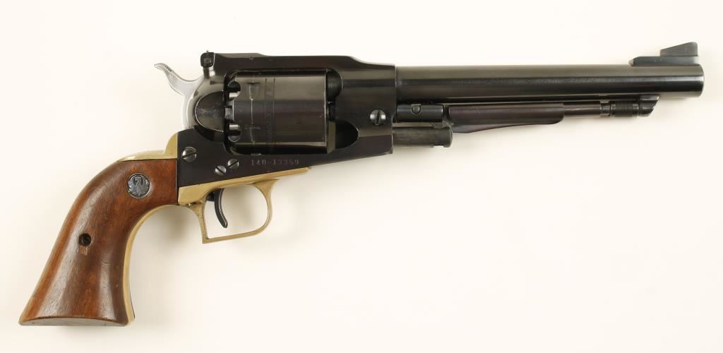 Blued and brass single-action 6-shot percussion revolver with a 7-1/2" barrel and adjustable rear sight. Bluing has edge wear on cylinder and muzzle, a drag line and scratches in the capping cut-out. Brass square-backed grip frame has some rubs and scratches. Bore and chambers are pristine. Wood grips have dings and scratches. Action works well with good lock-up. Condition is very good. *Antique Firearm*