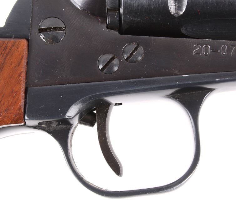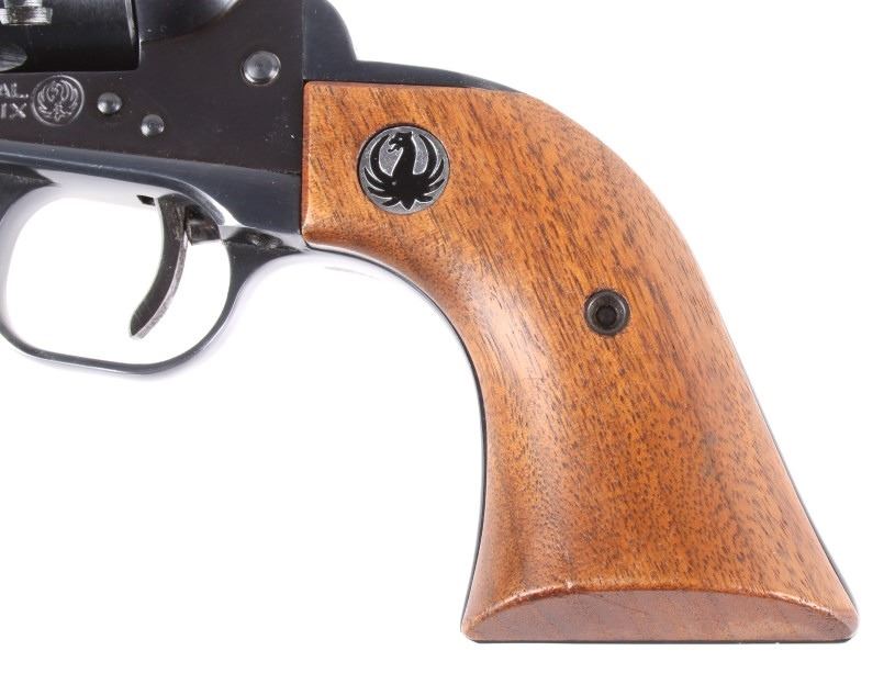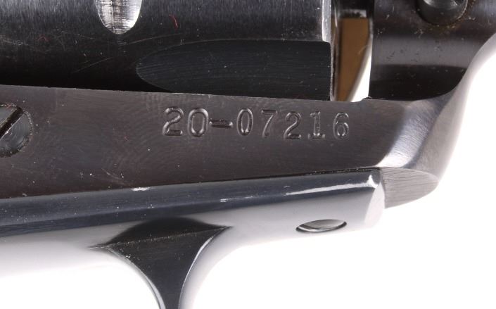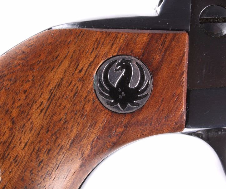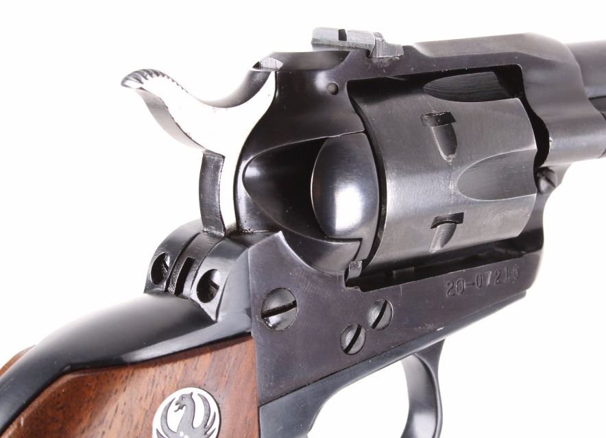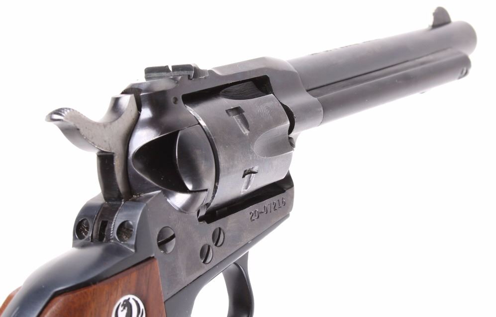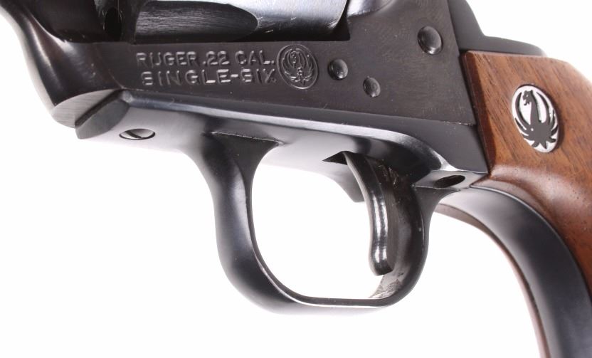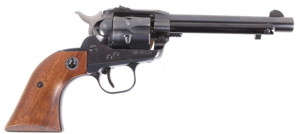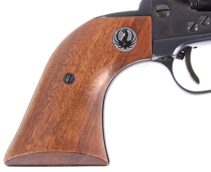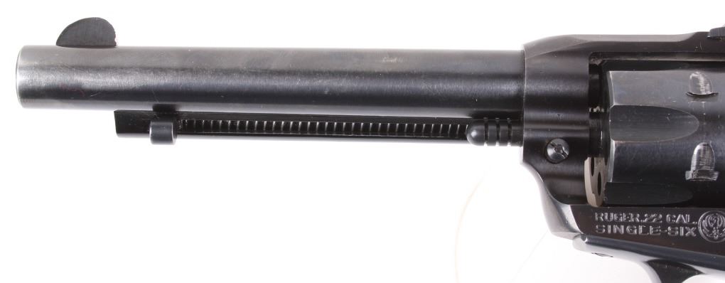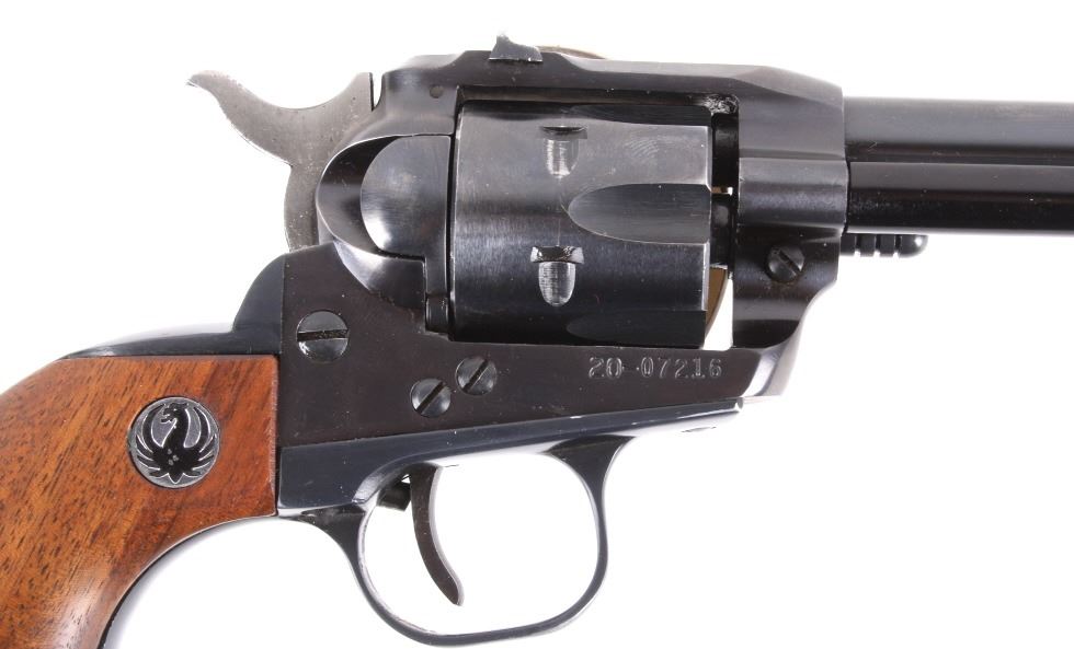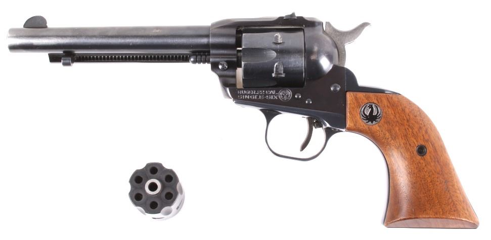 This is a exceptional example of the increasingly rare Old Model Ruger Single Six three screw revolver in .22 LR and .22 WMR. This revolver features a blued steel and wood handle, two interchangeable .22 LR and .22 WMR six shot cylinders, and a 5 1/2" Barrel. This old model revolver has not had a transfer bar installed making this a uncommon revolver. The gun was produced in 1969. The gun shows good bluing with normal holster wear and is in good condition. FFL transfer or NICS background required. Serial number is 20-07216, and cylinder is marked with the last three digits of the revolvers serial number. The revolver measures 11 1/4" L x 5" H x 1 1/2" W