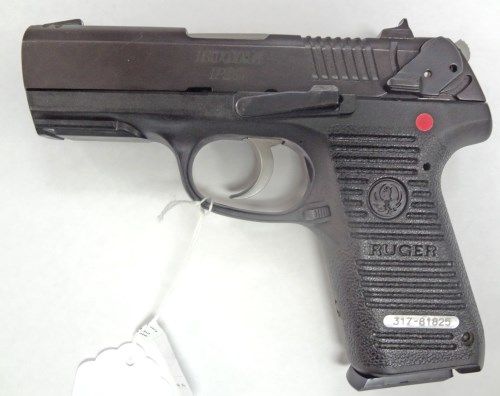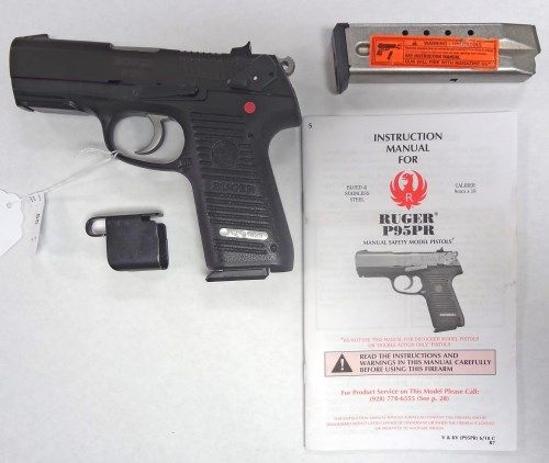 Ruger P Series. Semi-Automatic Pistol. 9mm. Used, but very minor wear. Excellent condition. Like new. Stock: black synthetic. Capacity: 15+1. # of magazines: 2. Safety: manual safety. Weight: 27 oz. Overall length: 7.25".