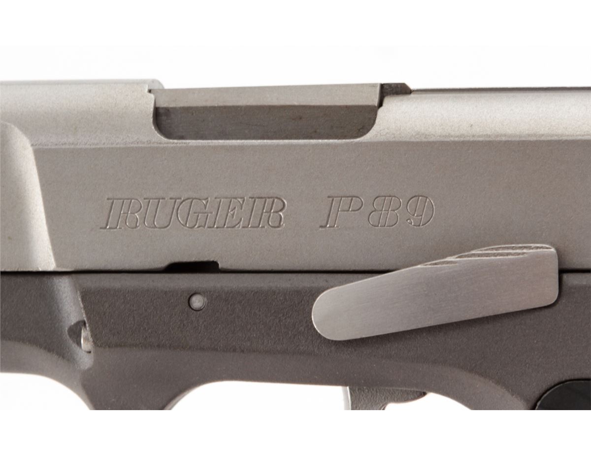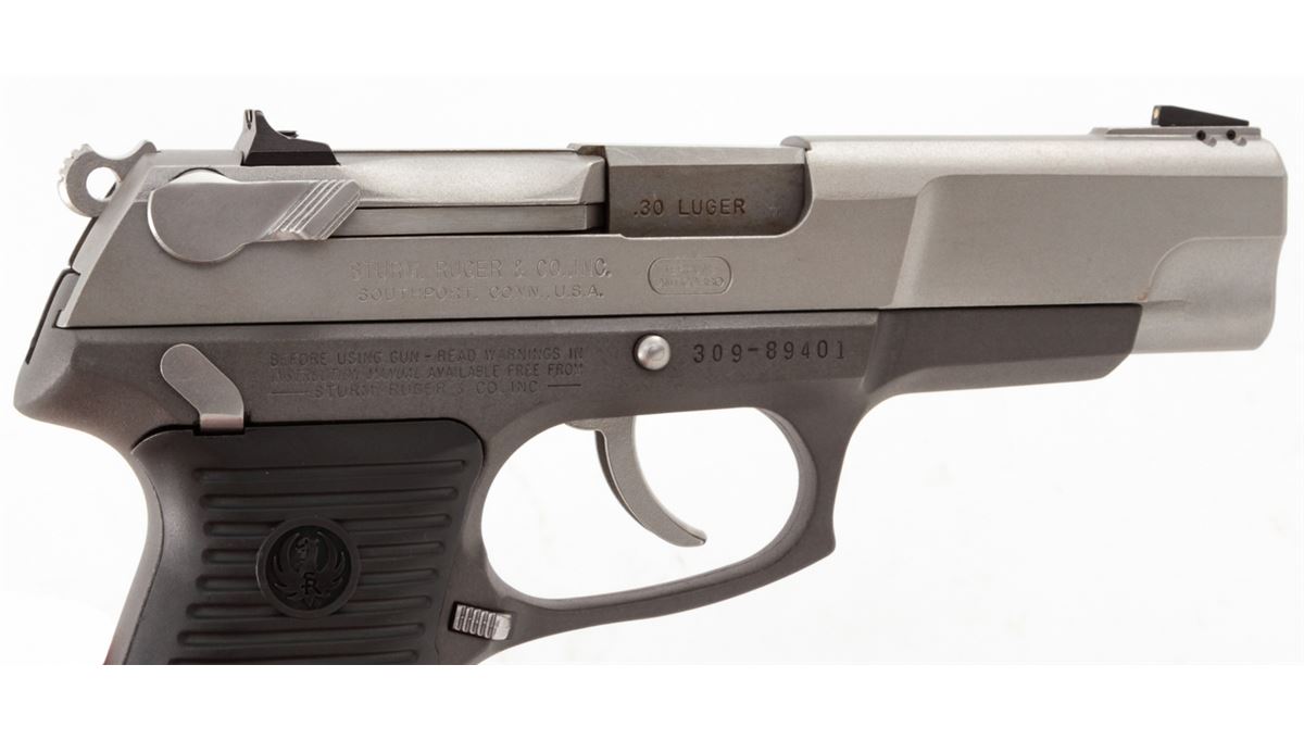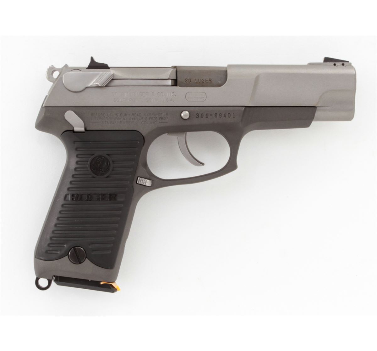Ruger P89 Semi-Automatic Pistol, #309-89401, .30 Luger/9mm cal., 4.25'' barrel, stainless steel, factory fluted plastic grips, with two magazines, two barrels, and two different recoil springs, one for each caliber. Condition is excellent, appearing as new in its original box. Est.: $300-$500. (Modern/PPT)