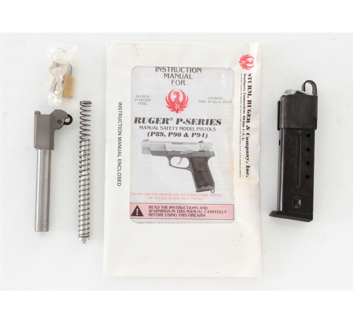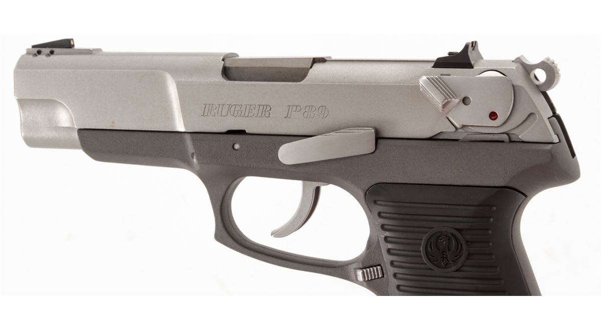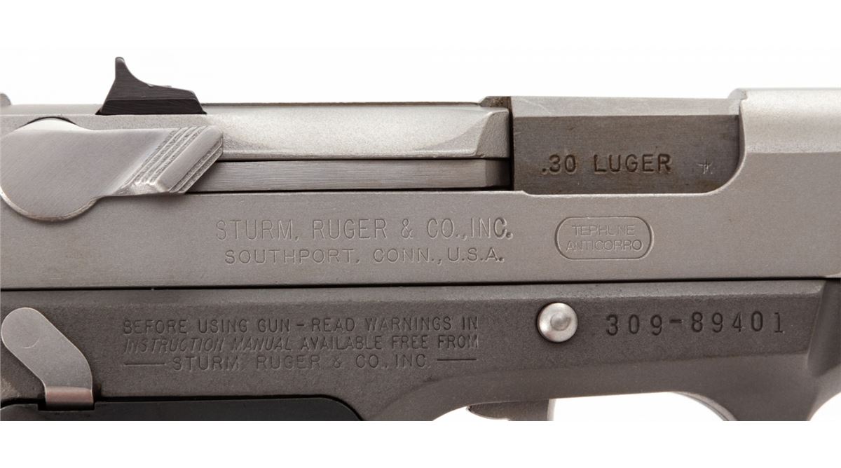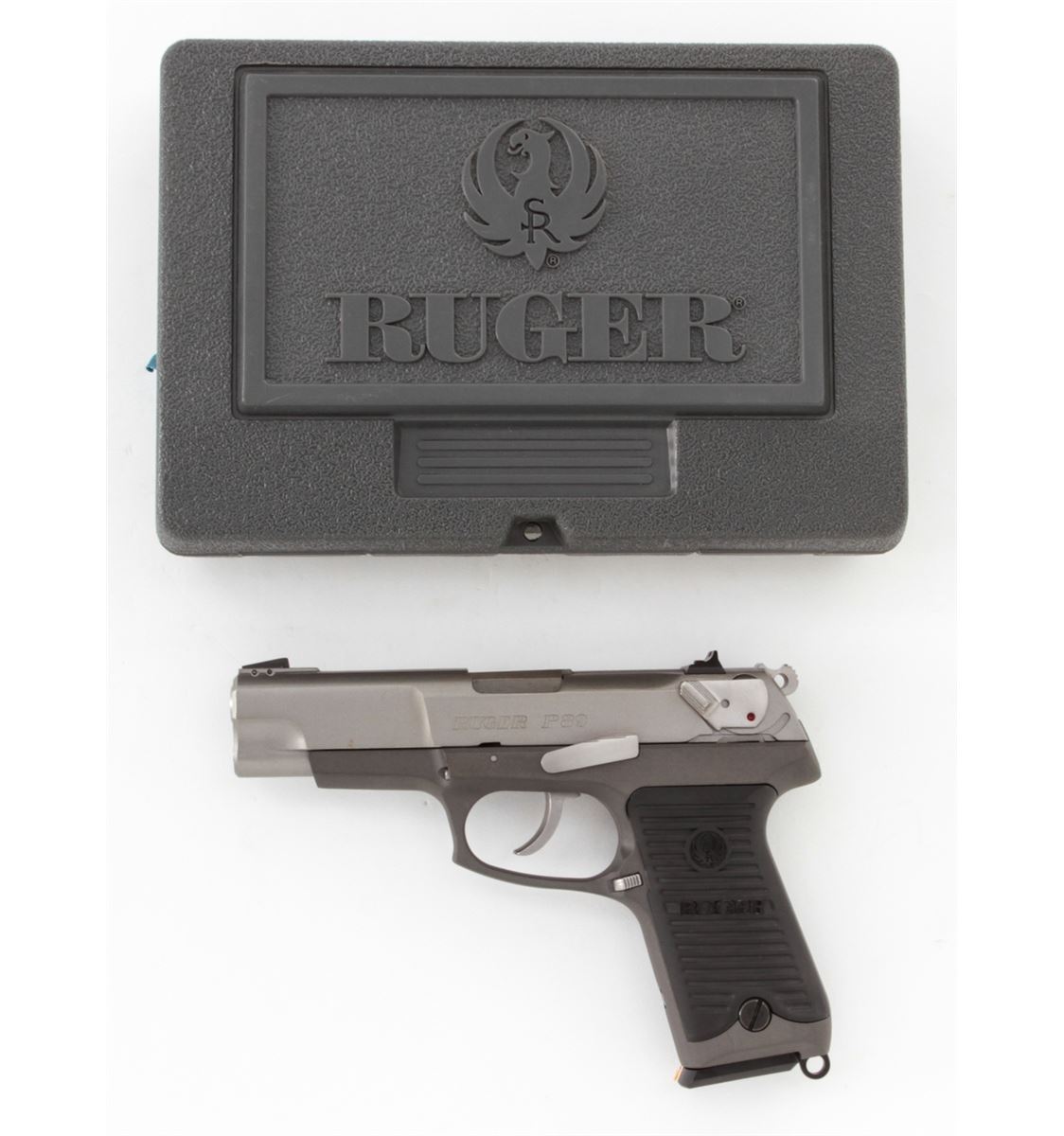 Ruger P89 Semi-Automatic Pistol, #309-89401, .30 Luger/9mm cal., 4.25'' barrel, stainless steel, factory fluted plastic grips, with two magazines, two barrels, and two different recoil springs, one for each caliber. Condition is excellent, appearing as new in its original box. Est.: $300-$500. (Modern/PPT)