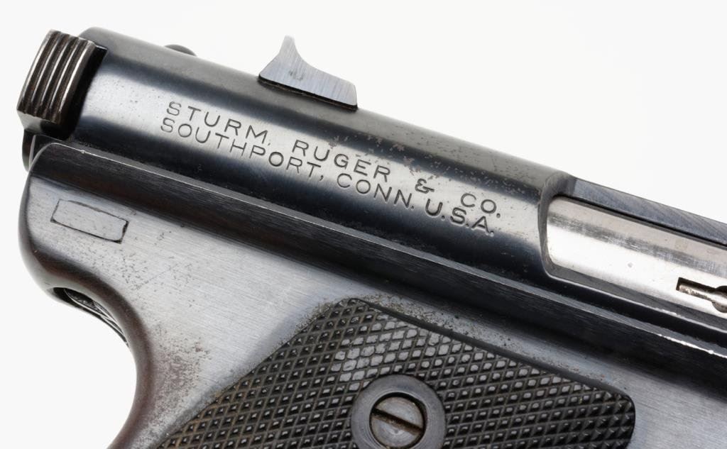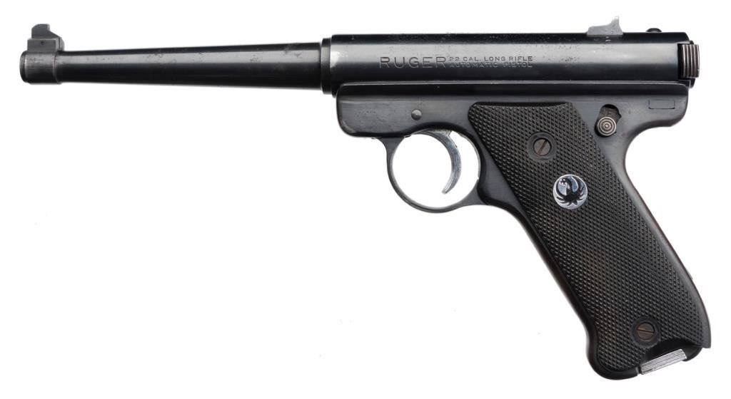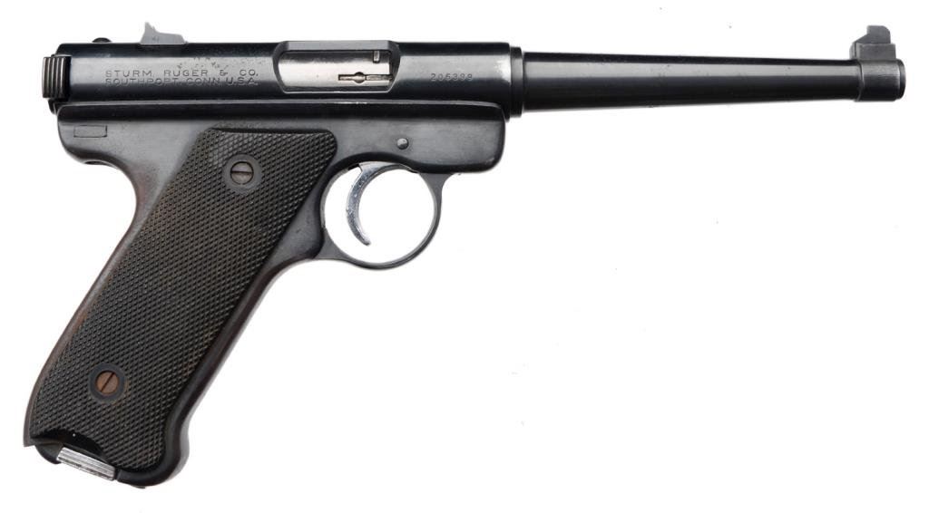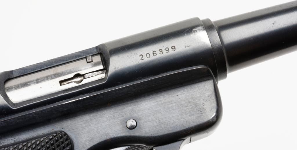 *Ruger Pre Mark I semi-automatic pistol, .22 Long Rifle cal., serial #206399. The pistol is in overall good to very good condition with a 6” blued barrel. The pistol retains the majority of its blued finish with some surface erosion and slight surface rust evident on the barrel and at the rear of the action. The checkered medallion plastic grips are in overall very good condition with small mars and flattening on the right grips. The bore is very good, action crisp and markings legible on this pistol. One correct magazine is included with the lot. Est.: $200-$400.