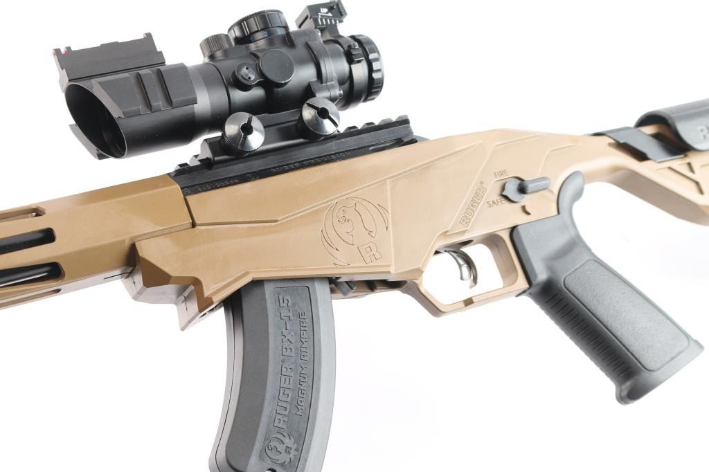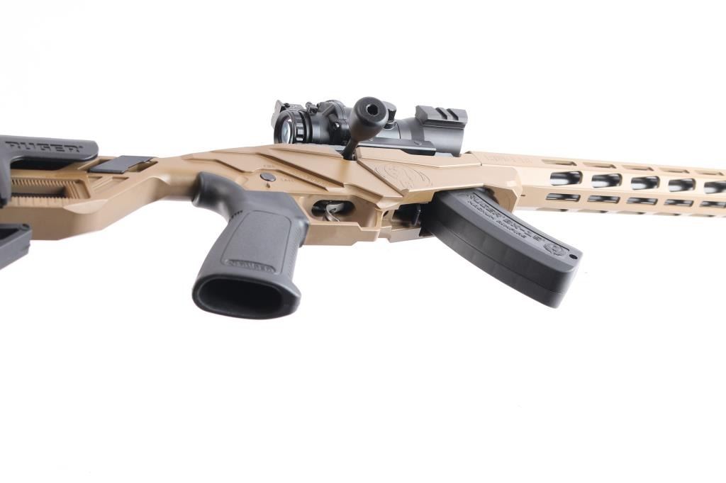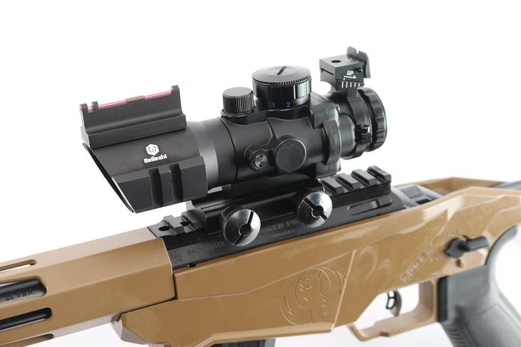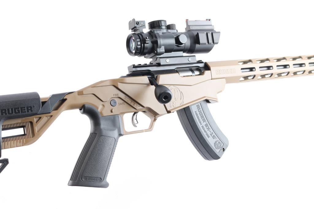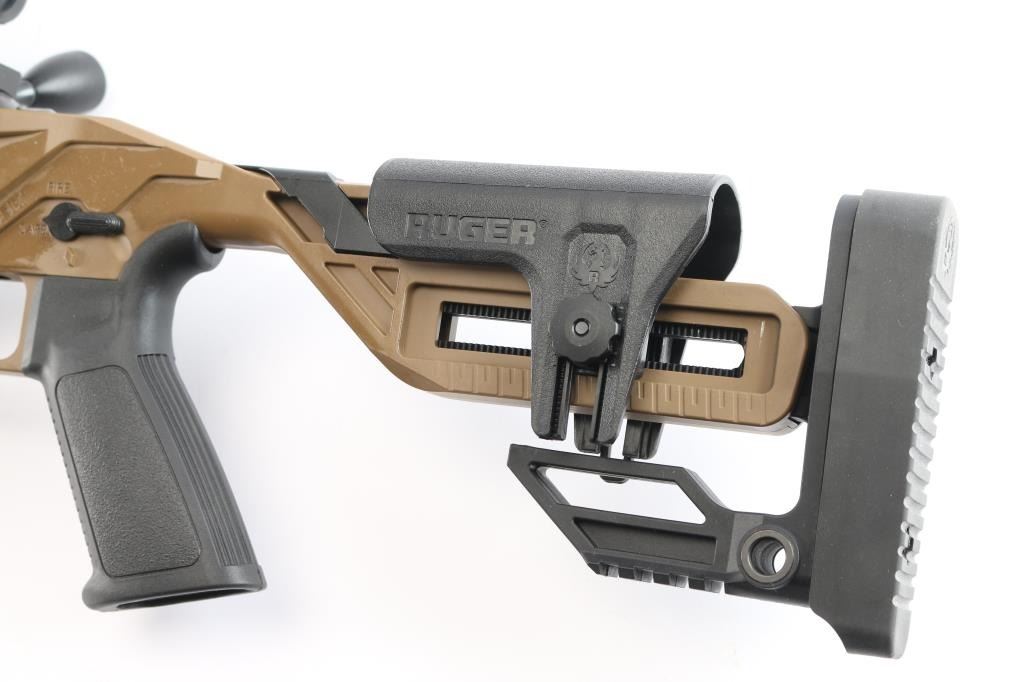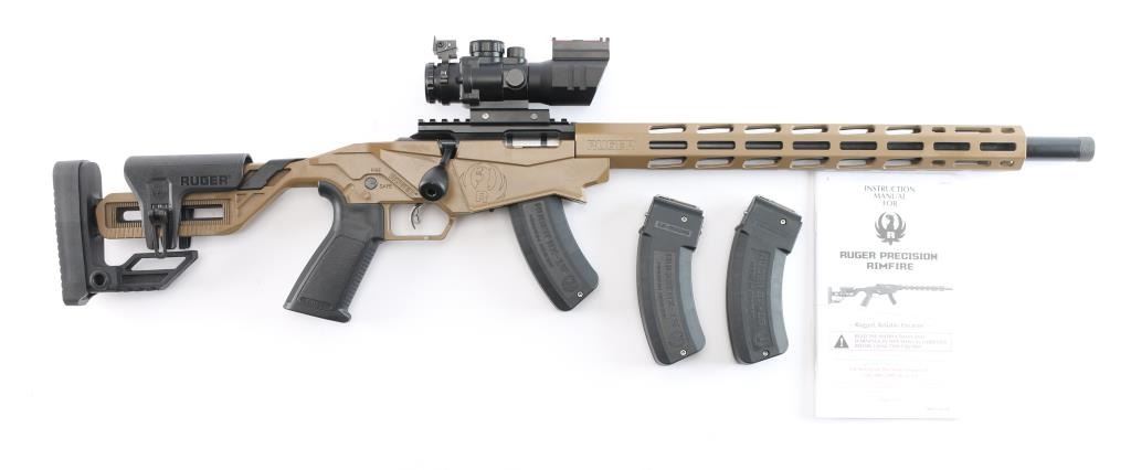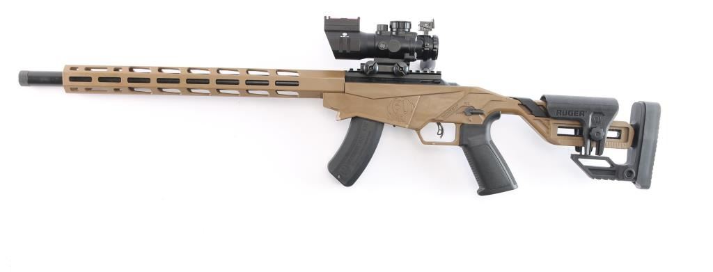American made bolt-Action. Hard-coat anodized Smoked Bronze Cerakote finish, 15" free float aluminum handguard. 24" 1:14 threaded, cold hammer forged barrel, with Picatinny Optics Rail, protective cap attached. Folding, adjustable length of pull, and comb height stack. Ruger accutrigger, manual safety. Comes with 3 Ruger 15-rd magazines and manual. Mounted with a Beileshi Optics 4x32 RGB Triple Illuminated Rapid Range Reticle Rifle Scope, clear optics. Bore is excellent/bright. Action is smooth/tight. Metal finish, and furniture are excellent, with no visible mars. Rifle is in almost new condition.